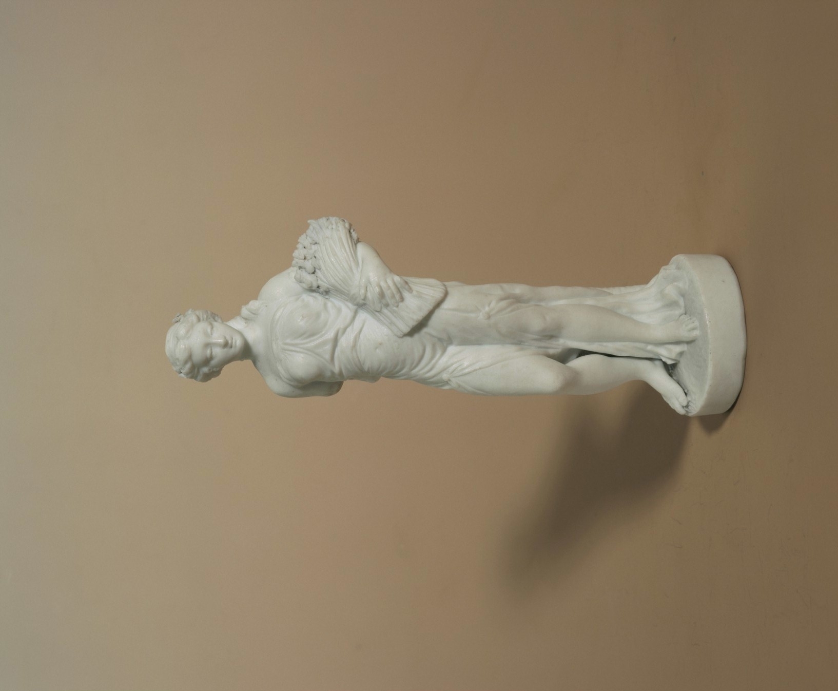FIGURIN. Ceres stånde med huvudet något nedböjt, högra armen avslagen vid överarmens mitt, vänstra armen böjt, hållande om en sädeskärve. Bakom figuren en trädstam. På rund fotplatta. Fabriken Rue Fontaine-au-Roy grundlagd 1773 av Jean-Baptiste Locré. Pris: 5 Kr.