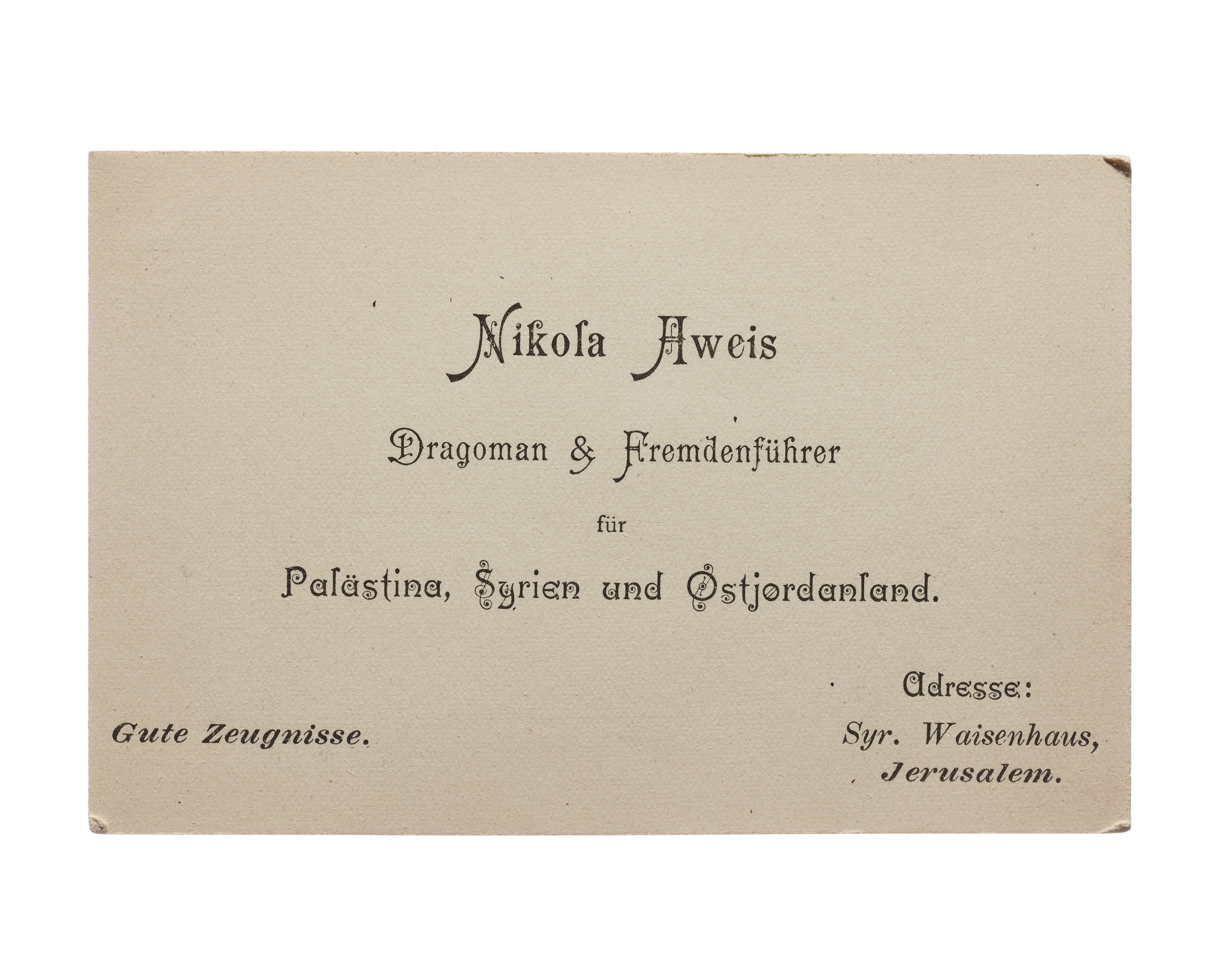 Ett visitkort från Nikola Aweis, "Dragoman und Fremdenfuhrer", adress (nedre högra hörnet) Syr. Waisenhaus Jerusalem.