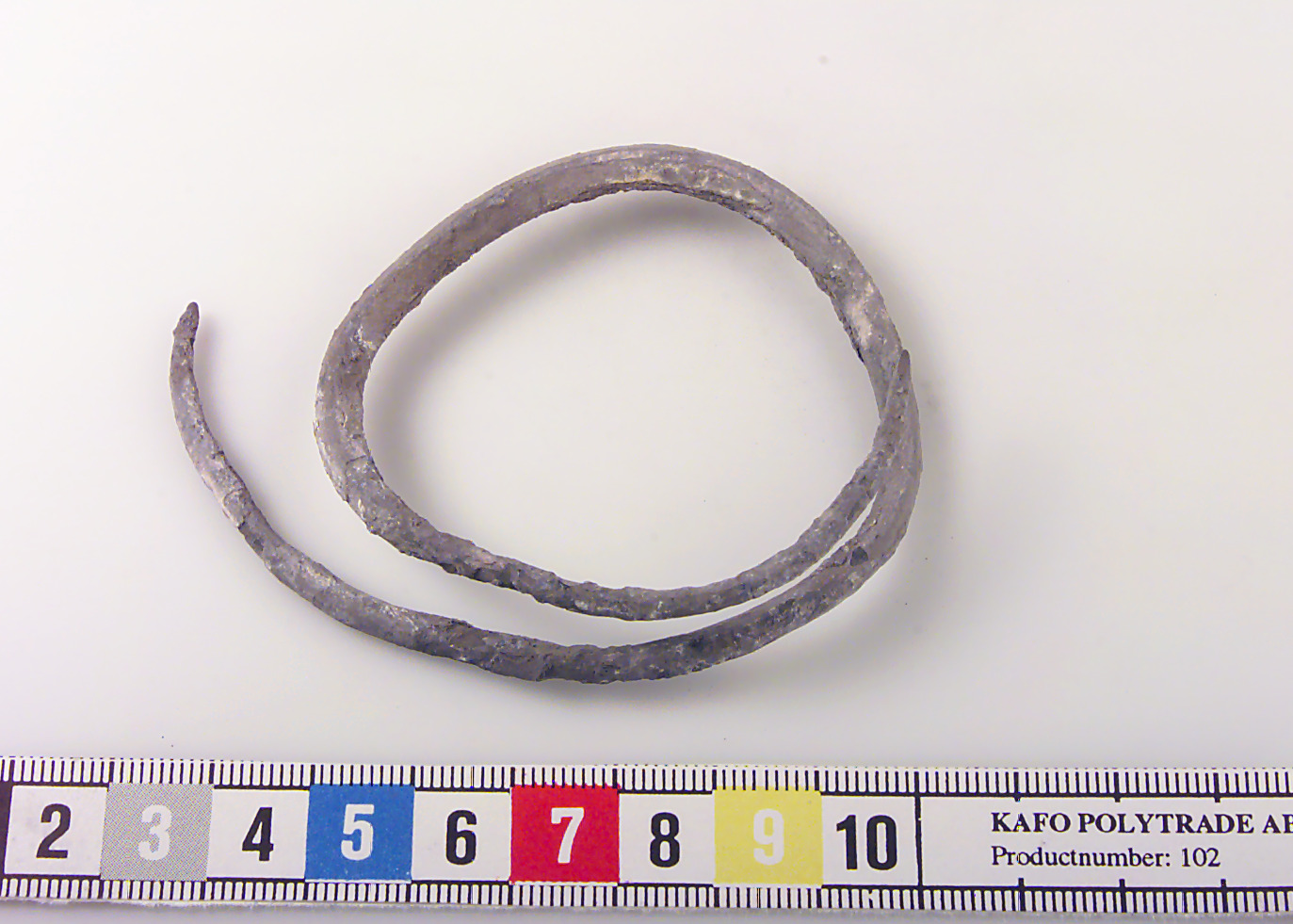 Fyrsidig ten med avsmalnande ändar (korroderade, spetsiga). Skadat ytskikt. Ihorullad i ett och ett halvt varv.