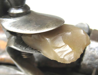 Gulgrå flinta, rektangulär med raka kanter och sned, grovt tillslagen spets.