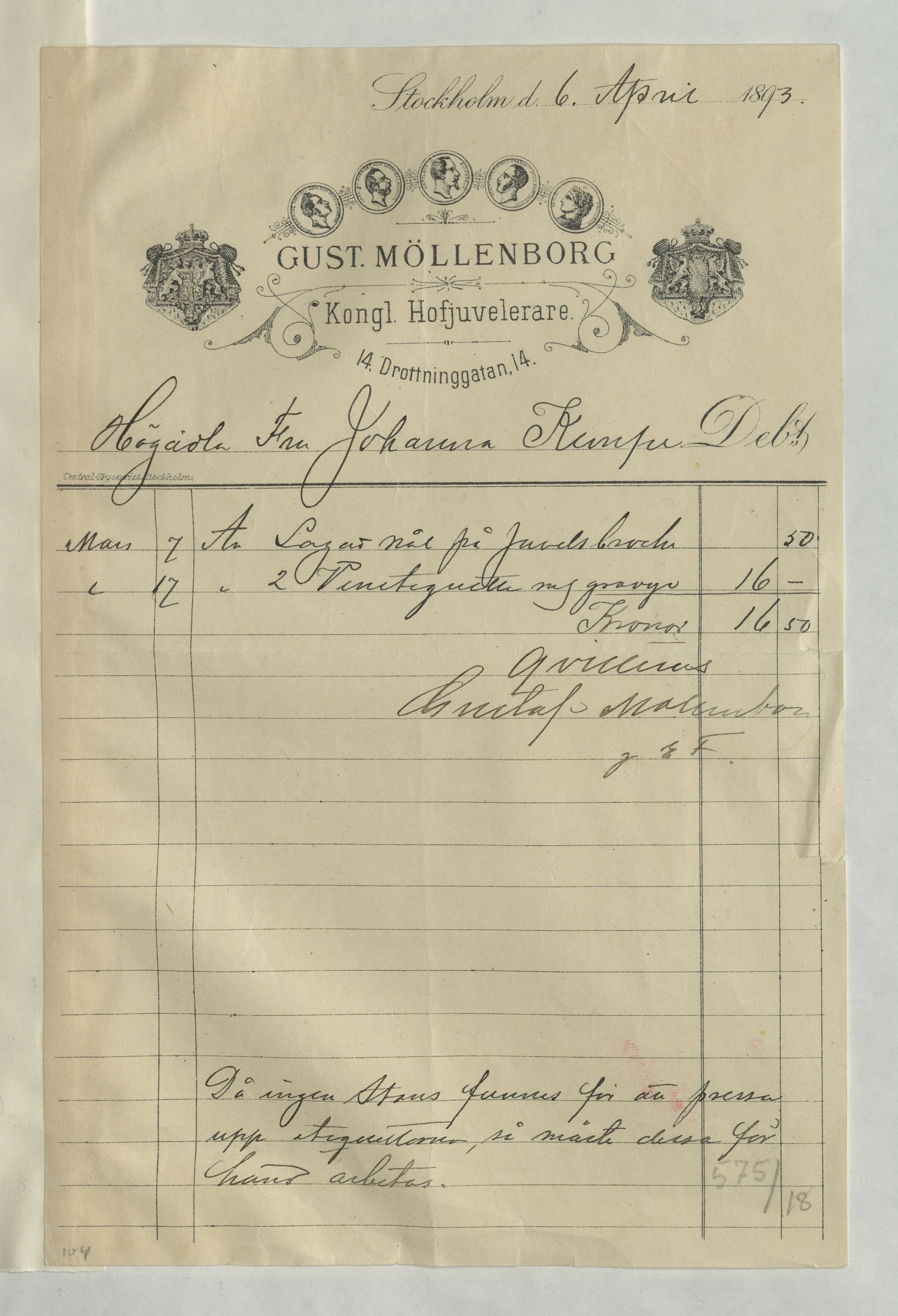 Kvitto från Gustaf Möllenborg, Juvelerare, 1893