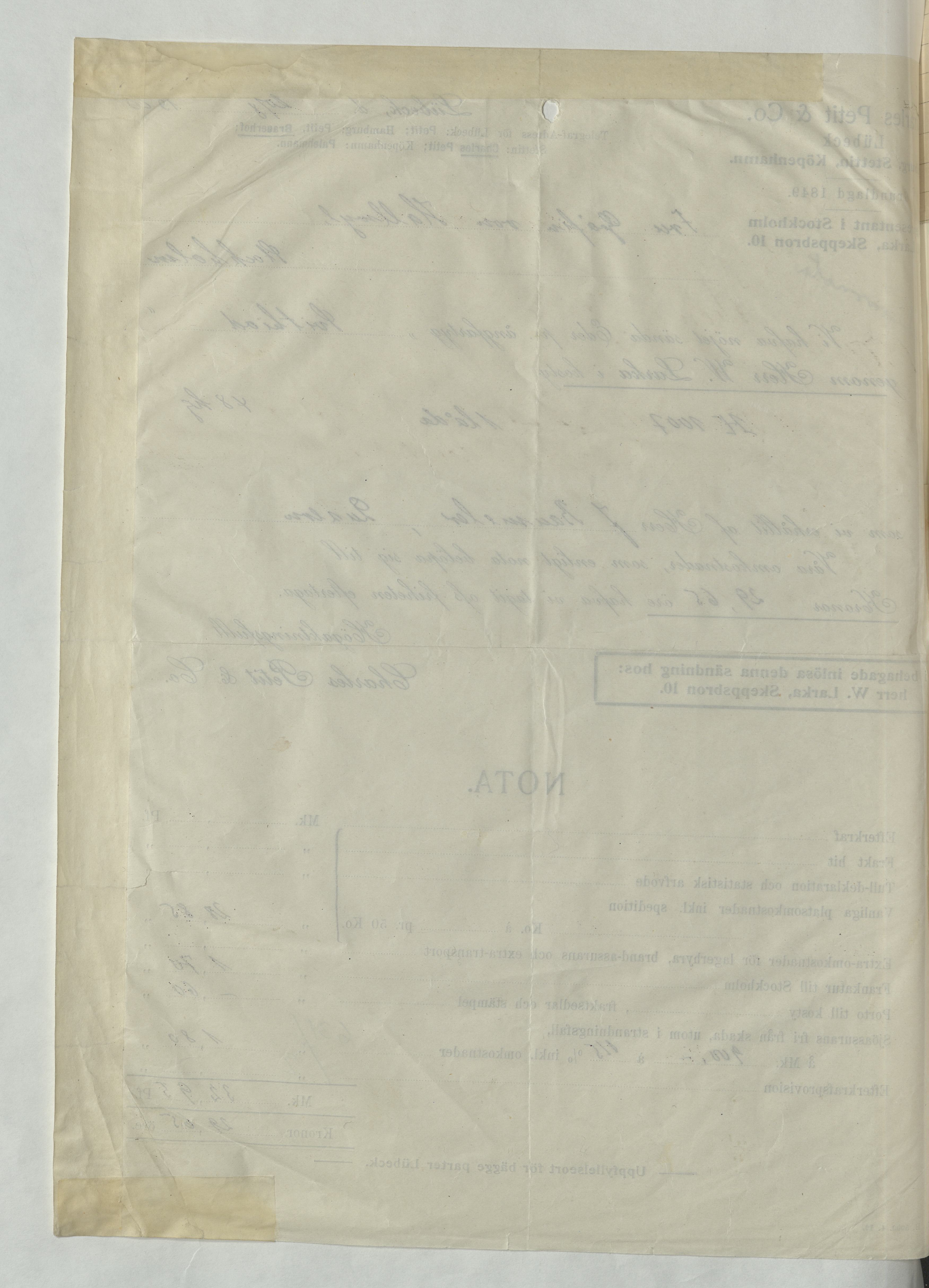 Kvitto från Charles Petite & Co, Lübeck, 1910