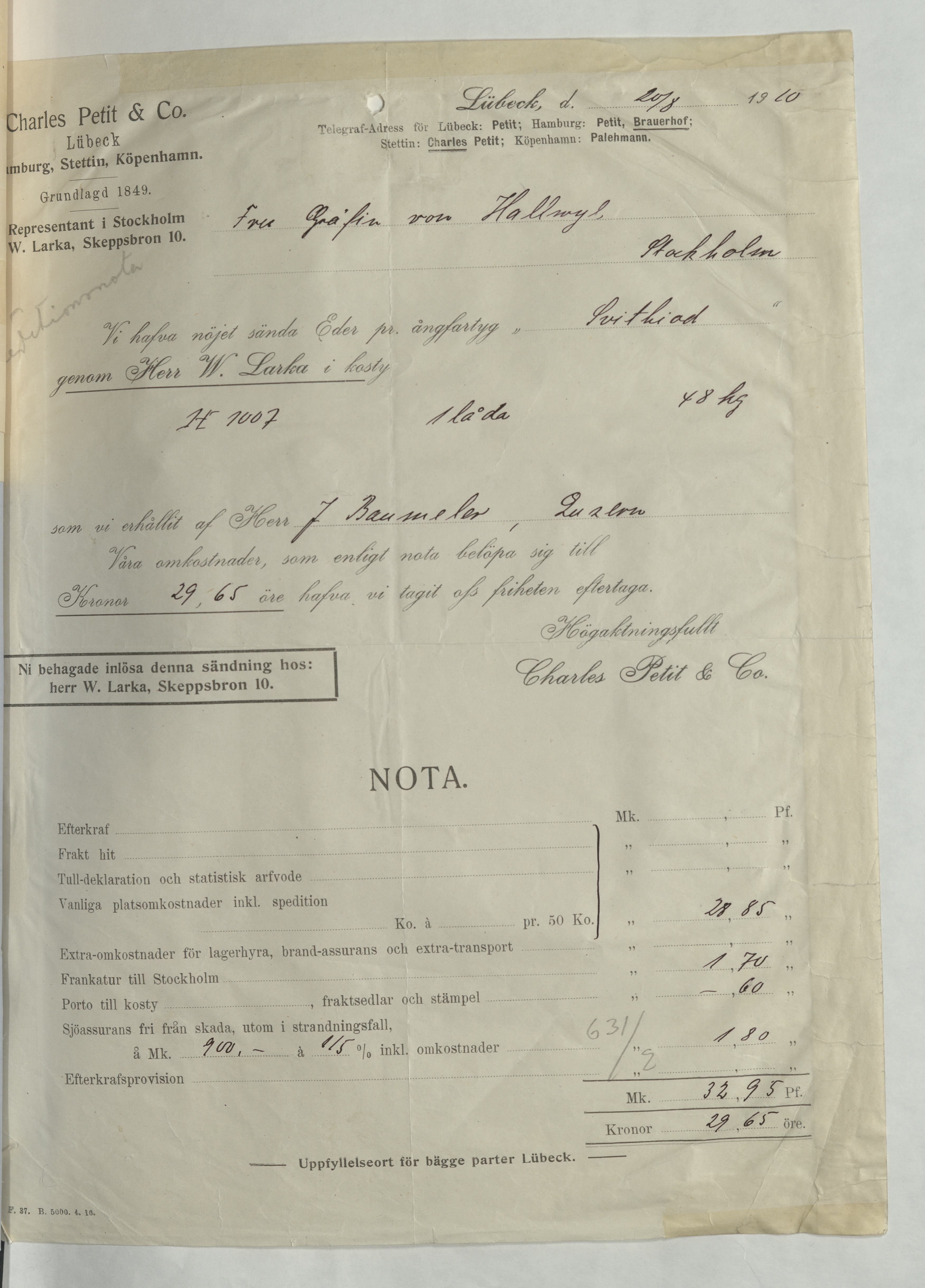 Kvitto från Charles Petite & Co, Lübeck, för 1 låda (48kg), 29:65Kr. Lübeck, 20 augusti 1910.