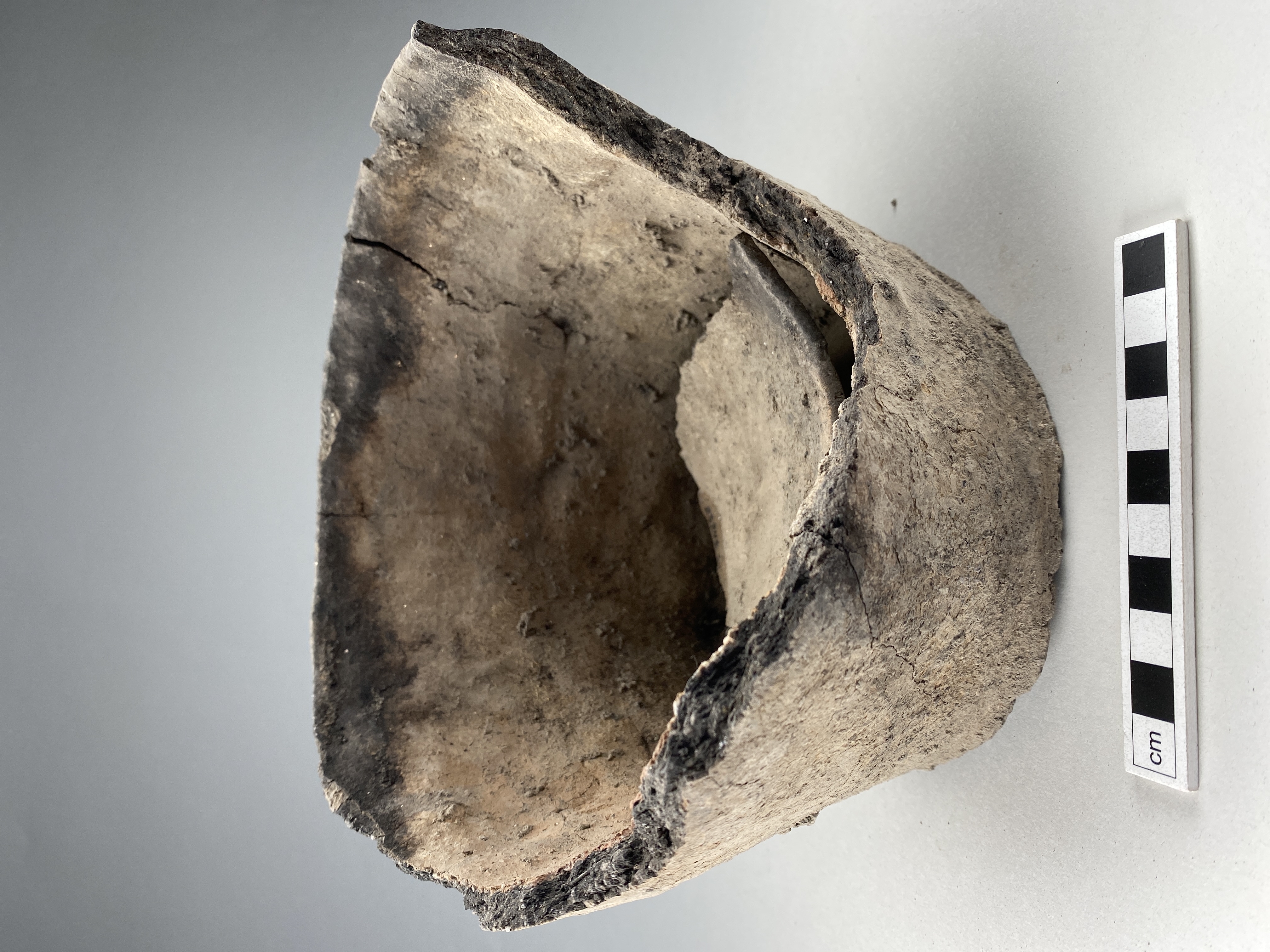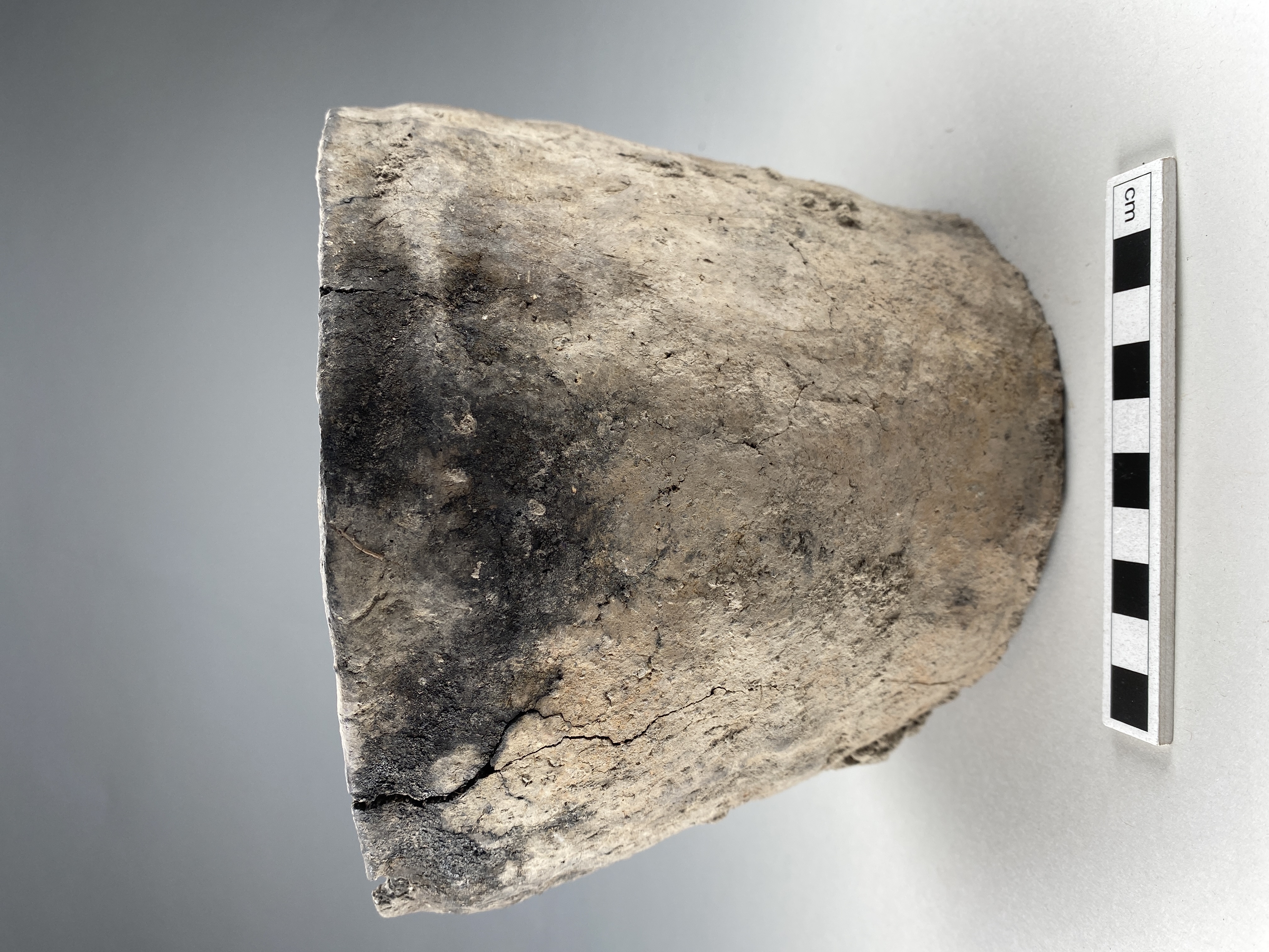 Lätt koniskt kärl med svagt indraget mynningsparti och raka sidor. Oxiderat bränd utsida, orgatiska beläggningar på insidan. Grovt glättad yta. Avsmalnat rundad mynningsläpp och plan undersida