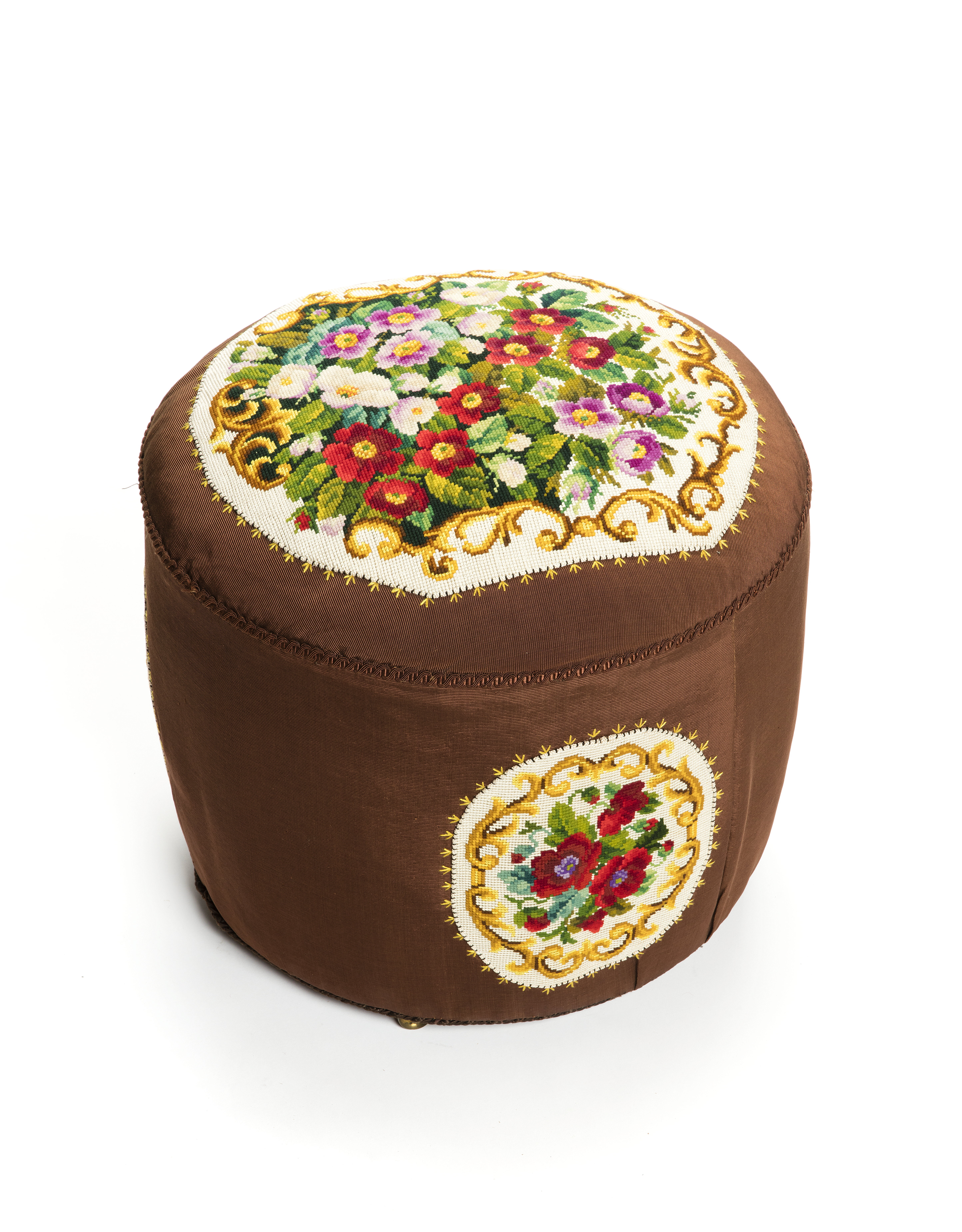 PUFF, rund. Med broderad klädsel, broderierna utförda av Wilhelmina von Hallwyl åren 1870-1873. Inköpt från möbelhandlaren I D Heymann i Hamburg oktober 1873, tillsammans med flera andra delar. Utgör del av möbeluppsats VI:II:A.a.30. bestående av bord, hylla, notportfölj med fotställ, hörnskåp med nyckel, soffa, två länstolar, åtta stolar, en avlång puff, två runda puffar, en trymå, två undergardiner med fyra hållare, två lufter övergardiner med två kappor, fyra broderade bårder, två ovala broderier jämte en lös frans, fyra gardinhållare, fyra gardinrosetter, två kornischer, två gardinbrädor, ett spjällsnöre, en matta samt överblivet garn. Möbeluppsatsen har till 1916 stått på Ericslund, Västerljungs socken, Södermanland, därefter i Hushållerskans rum i Hallwylska palatset.