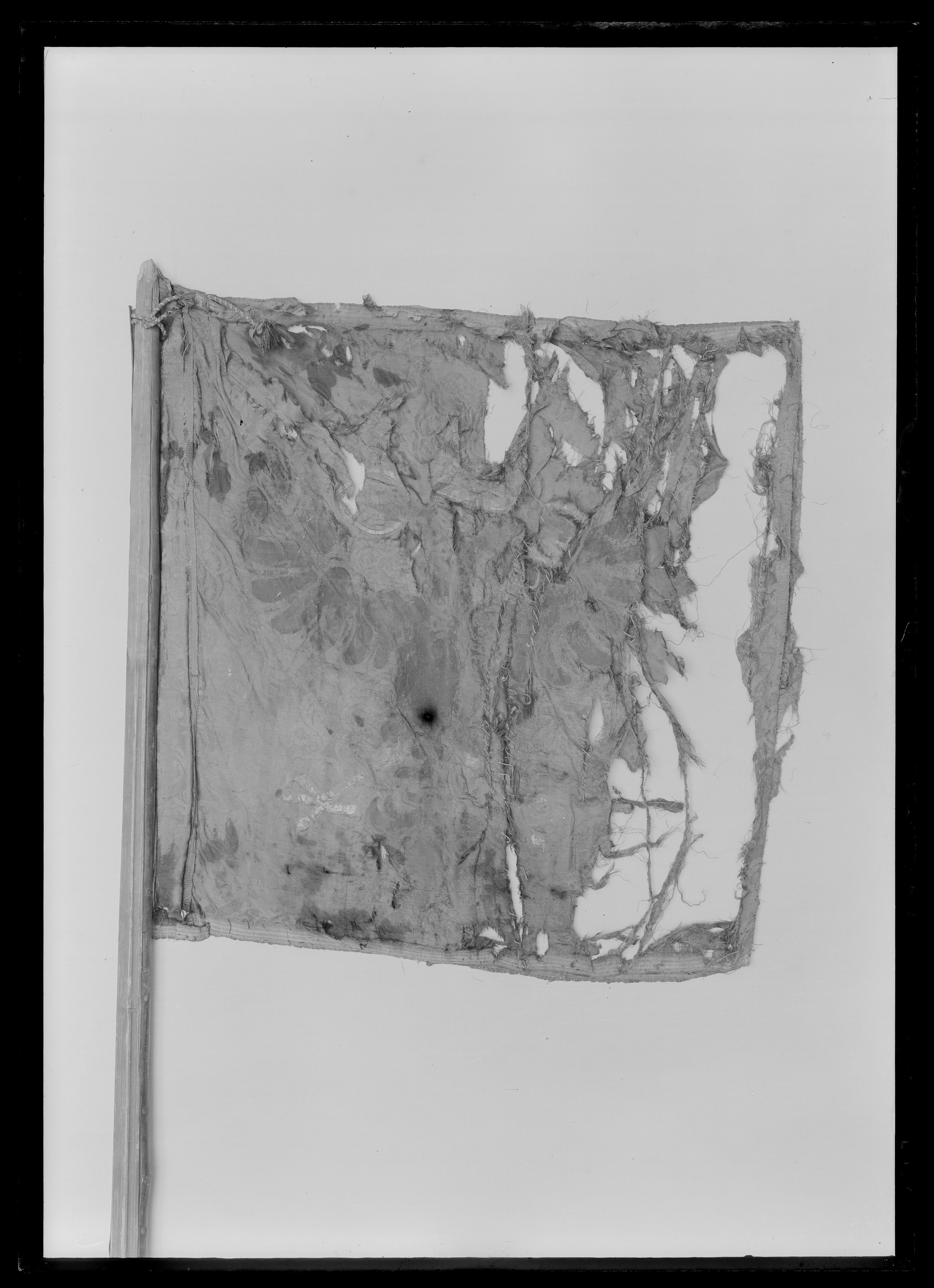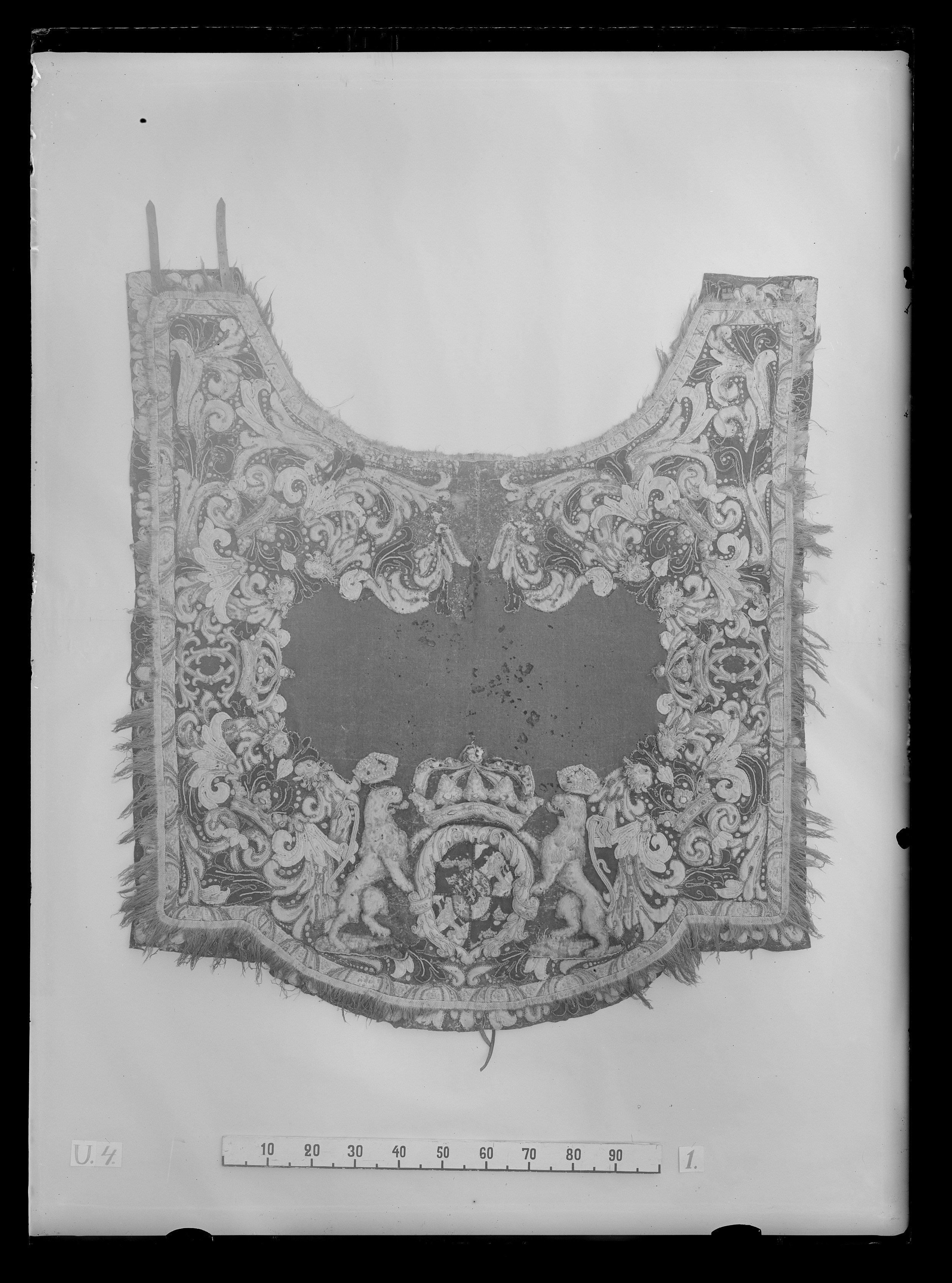 Täcke av blått kläde med applikationer av kläde i flera färger, huvudsakligen gult och vitt. Samma typ som nr 4061 men skiljer sig från detta i följande avseenden: Täckets bredd framtill: 1515 mm. Ingen kantning. Riksvapnets mått: 500x670 mm. De sköldhållande lejonen bär slutna kronor utan korsglober och står på små grästuvor med yttäckande ullgarnsbroderier i gult, vitt och grönt. De gula lejonen i vapenskölden är markerade med gult ullgarn i schattersöm. Vänstra framstycket har två bruna läderremmar,240x20 mm placerade ca 60 mm innanför framkanten. På höger framstycke finns bruna lädertränsar, 37x30 mm, tränsarna bär spännen av vitmetall, 30x20 mm. På baksidan nedanför inskärningen sitter en vågrät rad tränsar från sen tid liksom på nr 4061. Nedanför tränsarna, 70 mm nedanför inskärningen står "G.11" med svart tusch. Två bruna läderhällor, 240x35 mm, sitter ca 540 mm innanför respektive långsida och 320 mm nedanför inskärningen. En svansrem av brunt läder, 650x9 mm, sitter 220 mm ovanför bakre kanten.