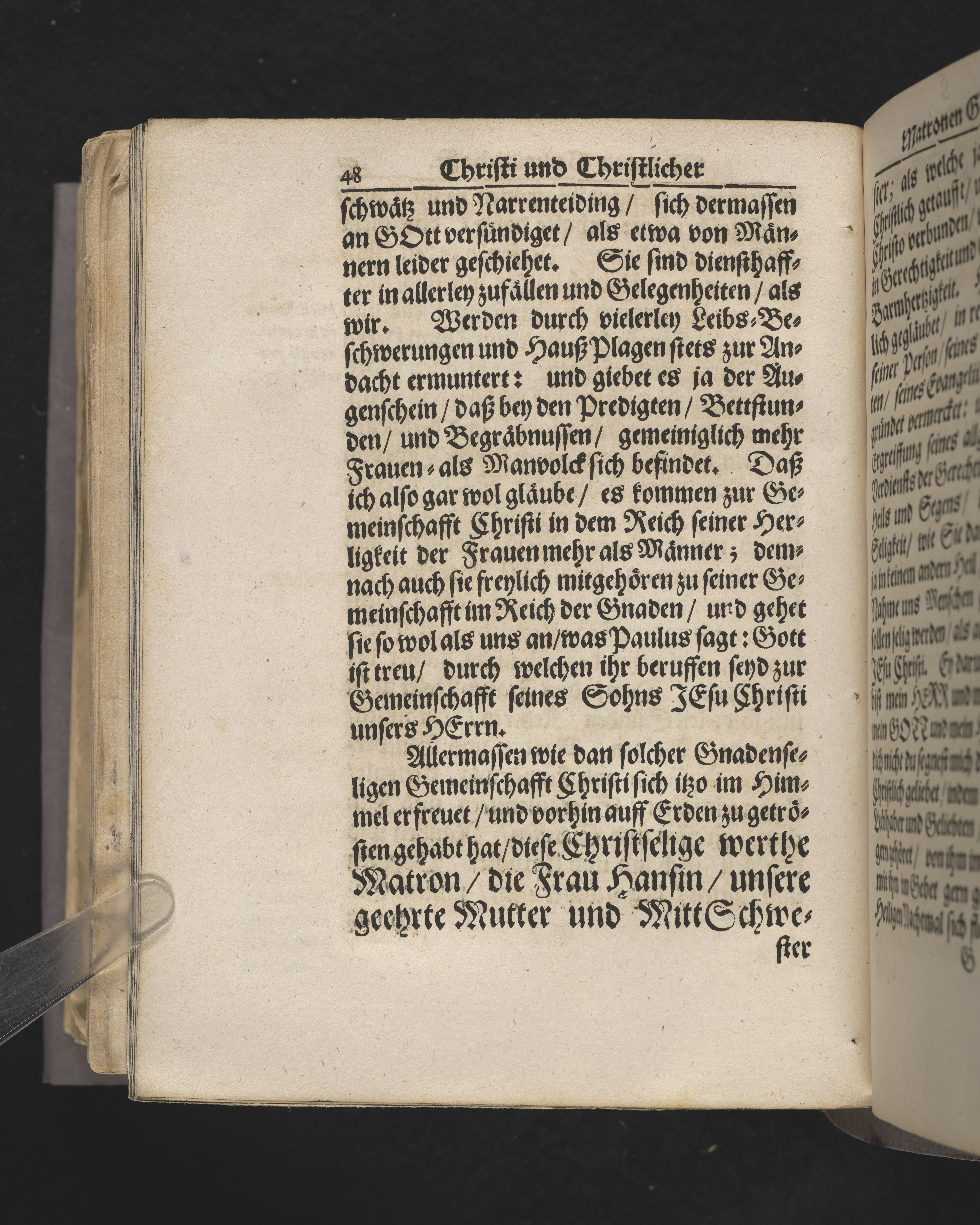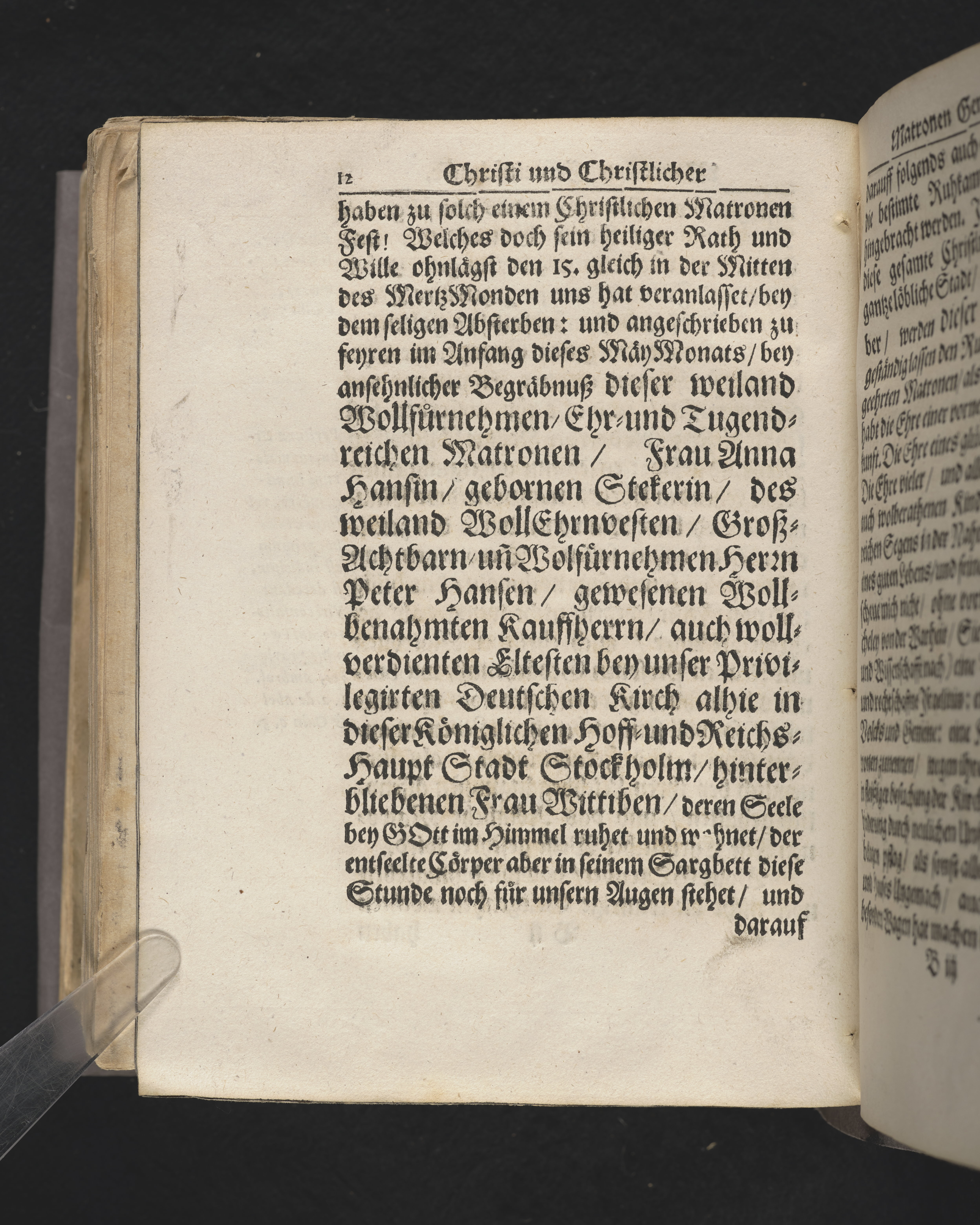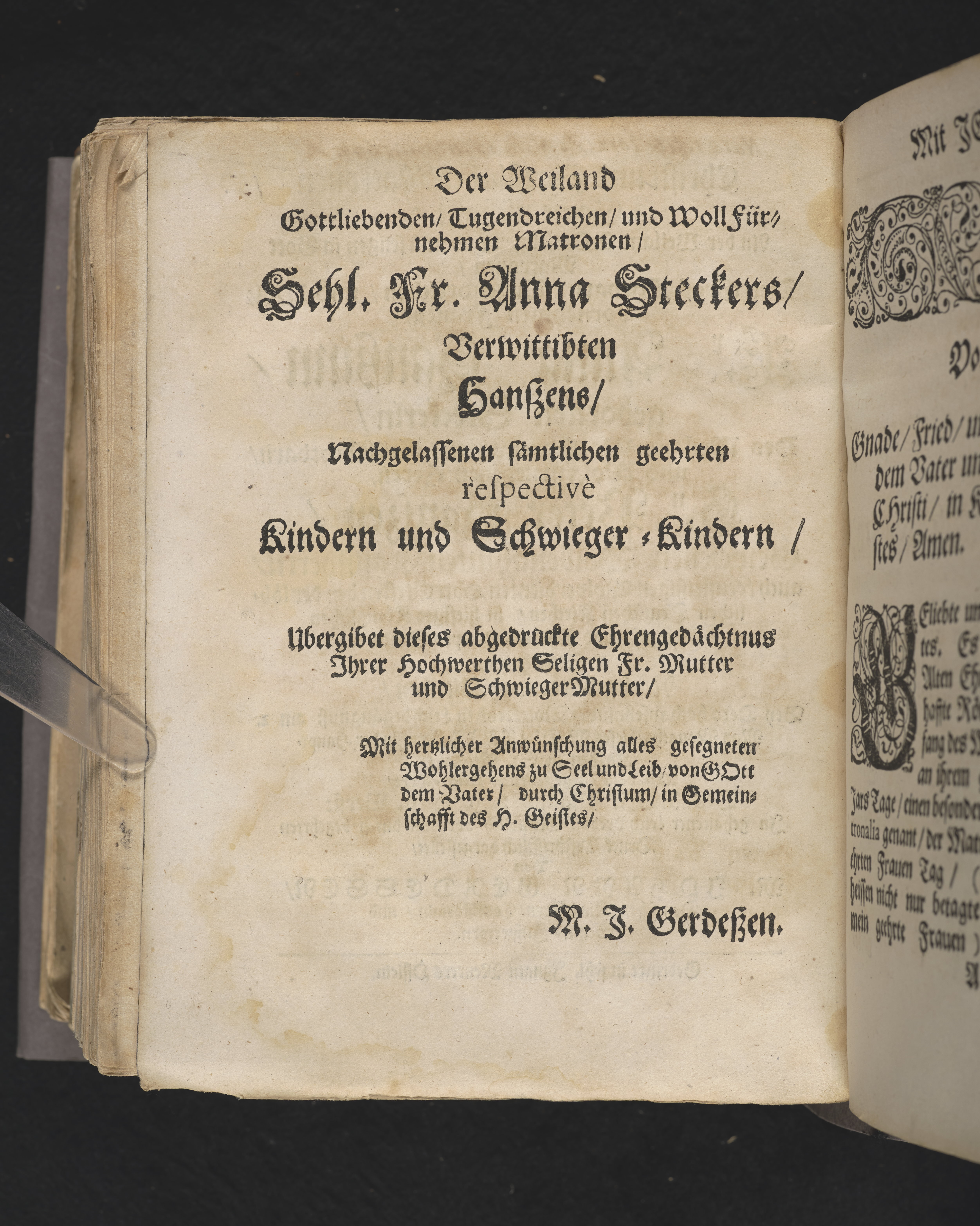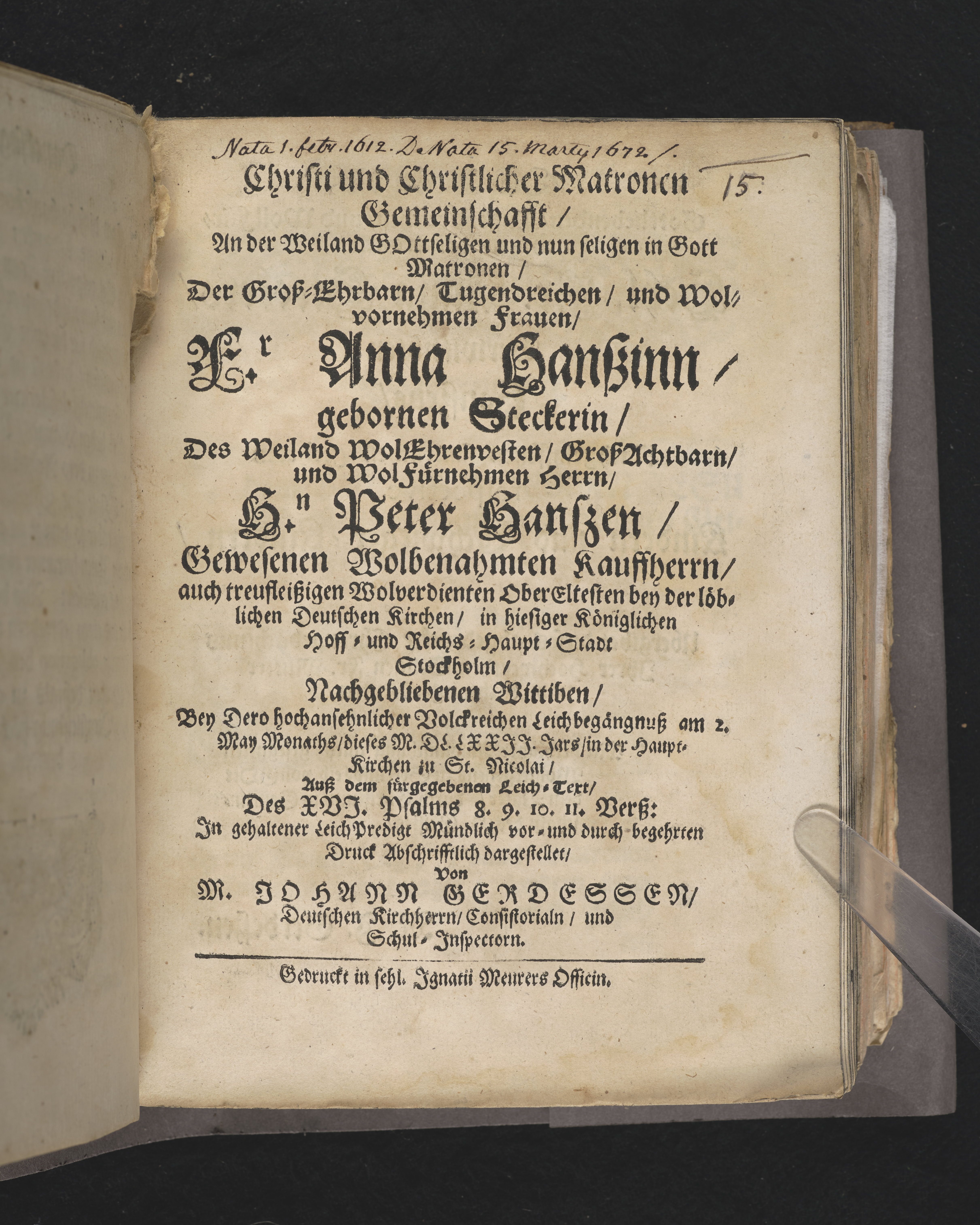 Christi und christlicher Matronen Gemeinschafft ... der ... Fr. Anna Hanszinn gebornen Steckerin, des ... Hn. Peter Hanszen, gewesenen wolbenahmten Kaufherrn ... nachgebleibenen Wittiben, bey dero hochansehnlicher volckreichen Leichbegängnusz am 2. May Monaths, dieses MDLLXXII Jars, in der Haupt-Kirchen zu St. Nicolai ... dargestellet, von M. Johann Gerdessen ... Gedruckt in sehl. Ignatii Meurers officin.