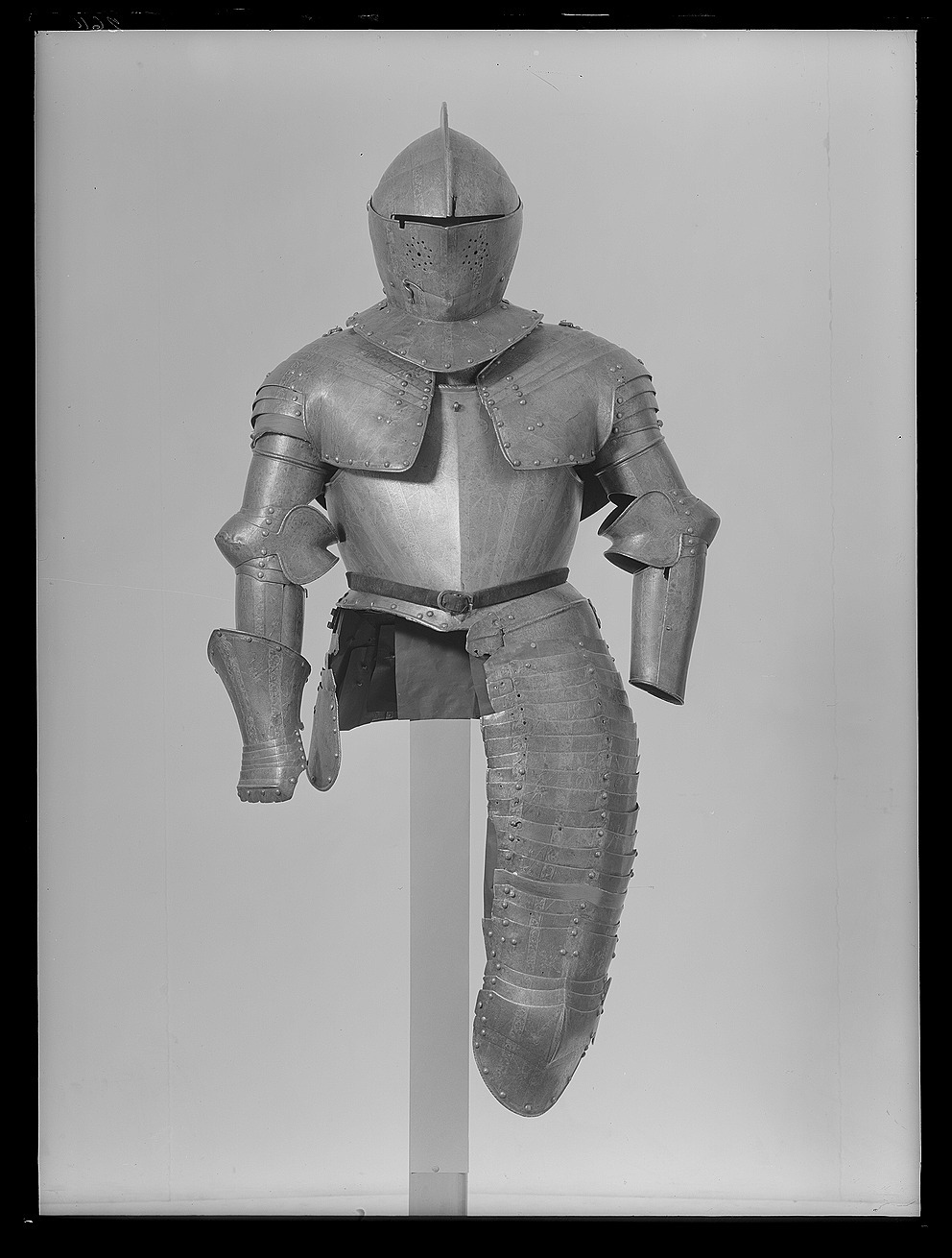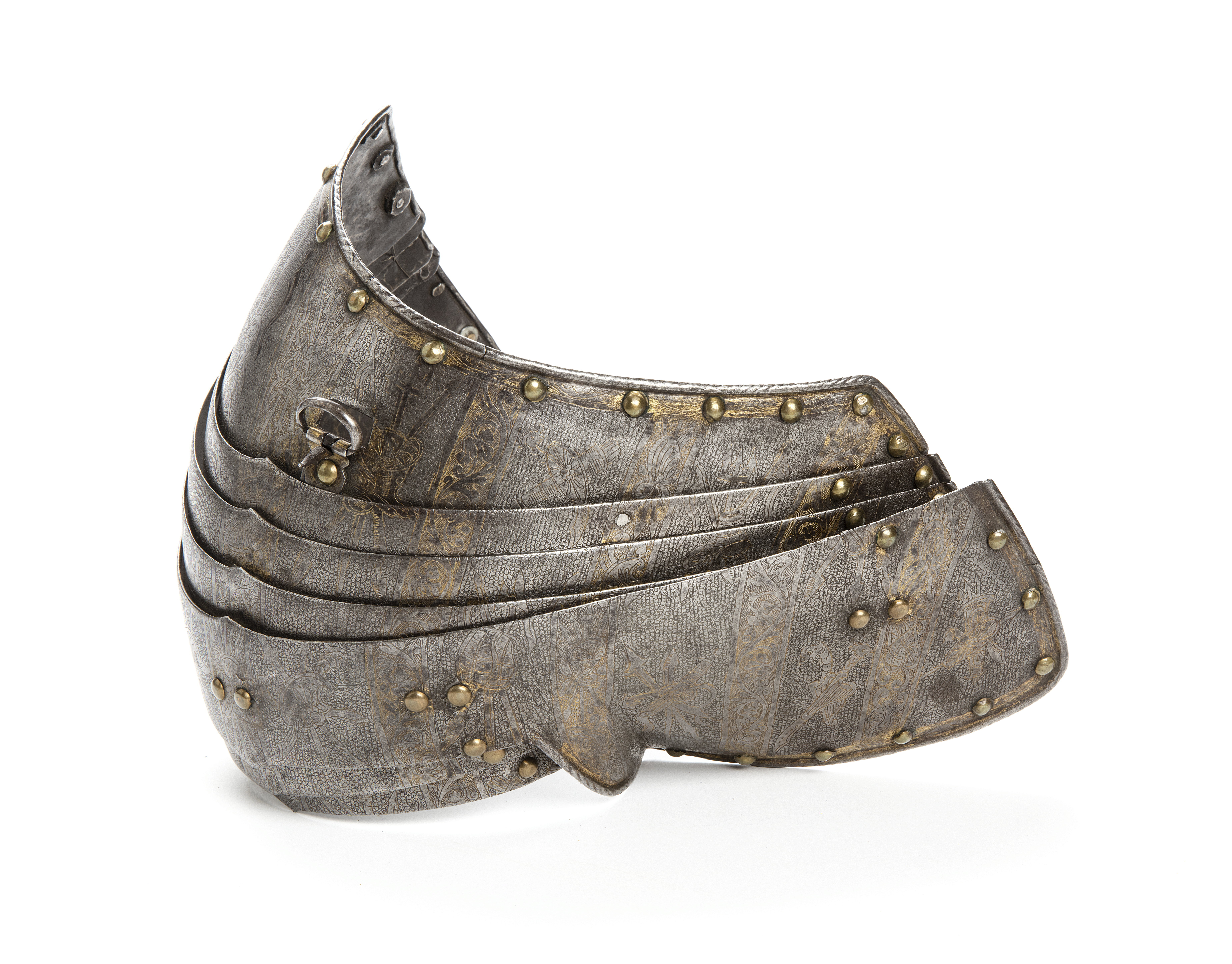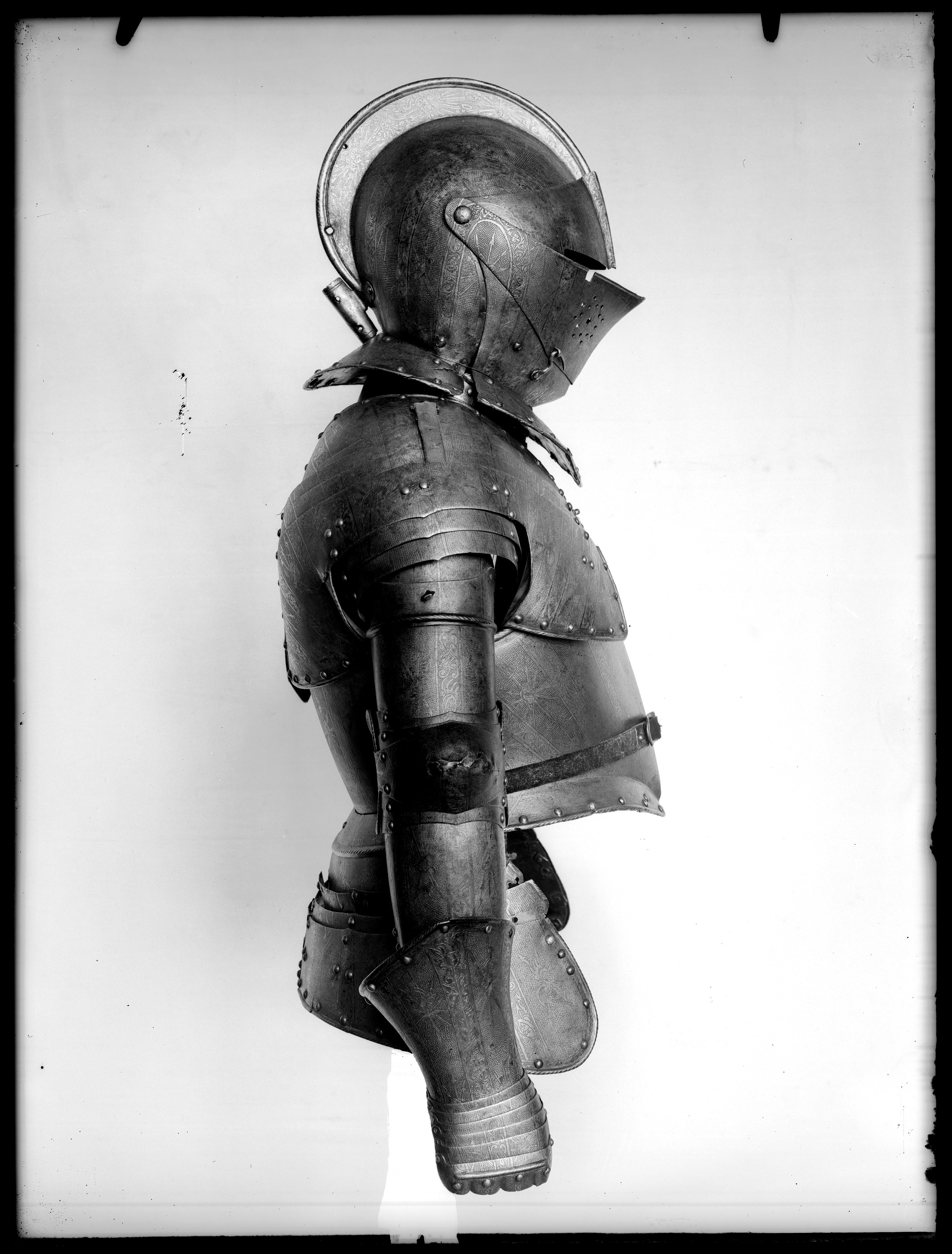 - Konung Erik XIV rustning af jern, etsad i ornementer och förgylld, består af: