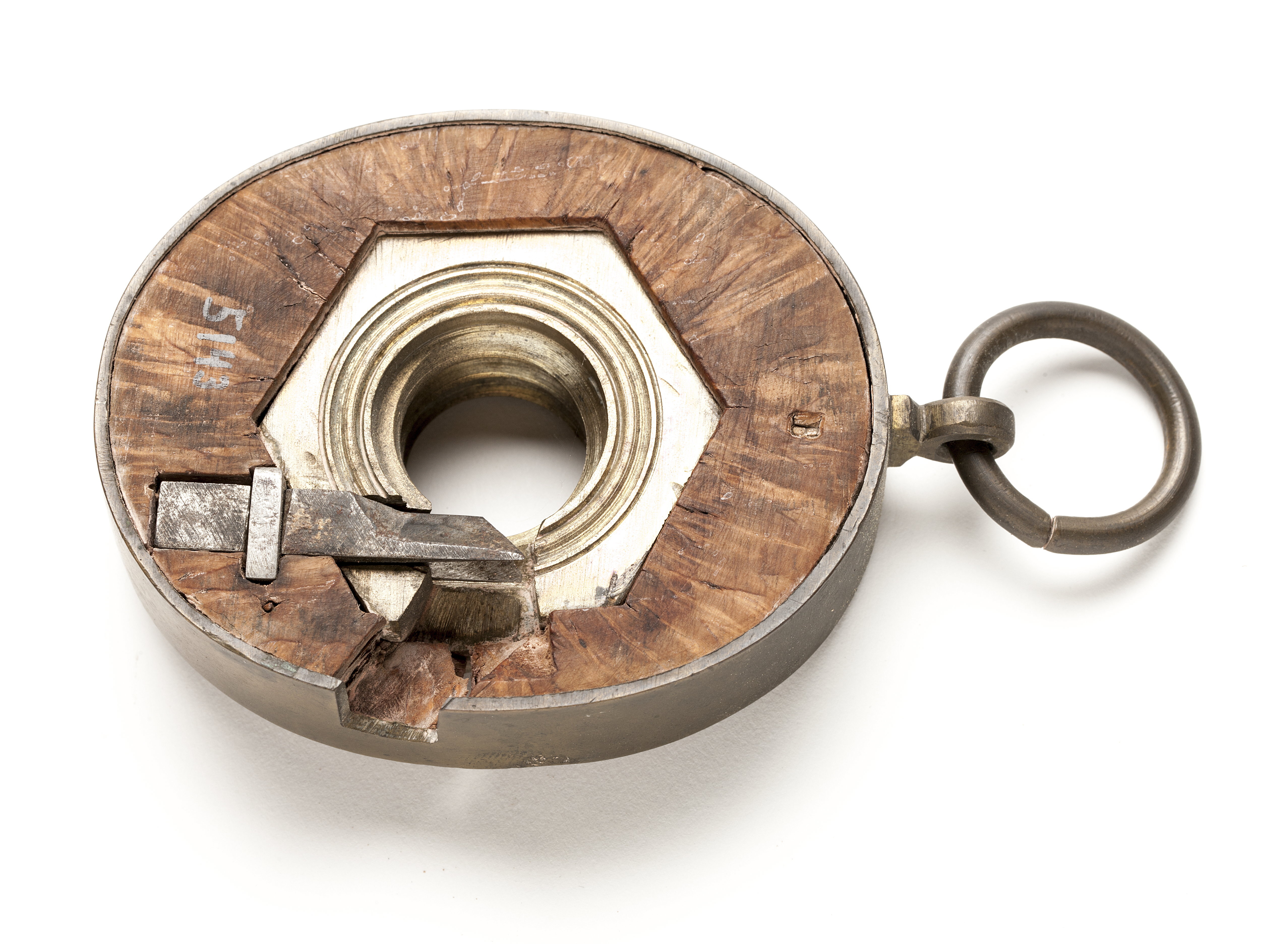 Sexkantigt mittparti av brons, infattad i band av mässing med upphängningsögla. Spetsvinklig egg av stål, fästad med stålskruv och kvadratisk, fyrklöverornerad mutter av mässing. Stämpel: "B". Hålets diam 97 mm. Gängornas stigning 7 mm.