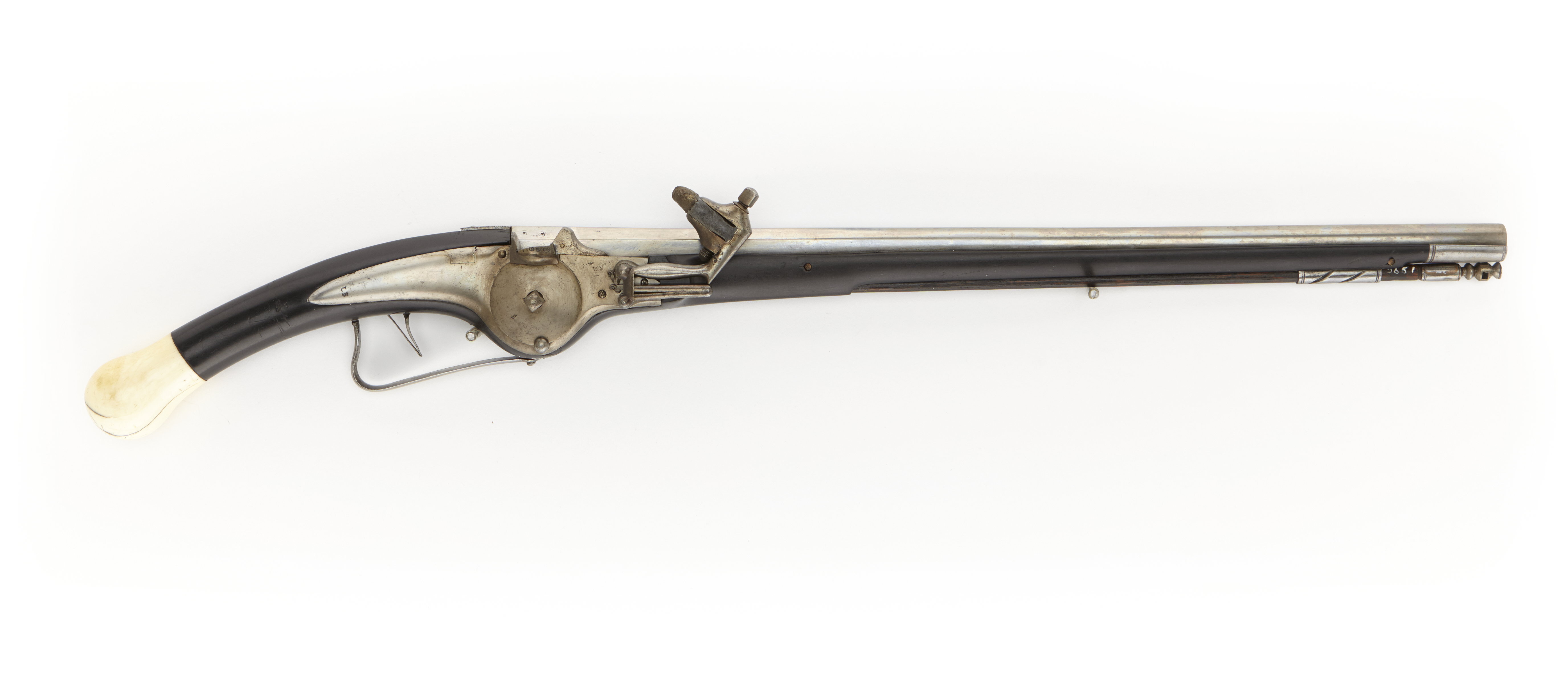 Rund, över kammaren åttkantig, slätborrad pipa av stål. Över kammaren stämplat "WR" två gånger (jfr Stöckel nr 4806), och en krönt ring. På pipans undersida otydlig stämpel. Två häften. Hjullås med välvt låsbleck av stål, fransk typ, bakåt nedböjt och avsmalnande till en spets. På låsbleckets bakre spets stämplat "LB" (se Stöckel nr 3726). Utvändigt hjul, stämplat "S". Utsvängt låsbleck för hjulet. Hane med lös underkäke, rak hanhals och spolformad hankropp. Svart helstock av ebenholtz med böjd kolv. Päronformad kolvkula av elfenben. Stocken utsvängd för hjulet. Två låsbrickor av pärlemor. Överrörka av stål med genombrutna sneda skåror. Näsbans av stål. Varbygel av stål bakåt utdragen. Tillbehör: Laddstock av trä, doppsko av stål. Märkt: 75 bakom låsblecket, stanstyp 5376.