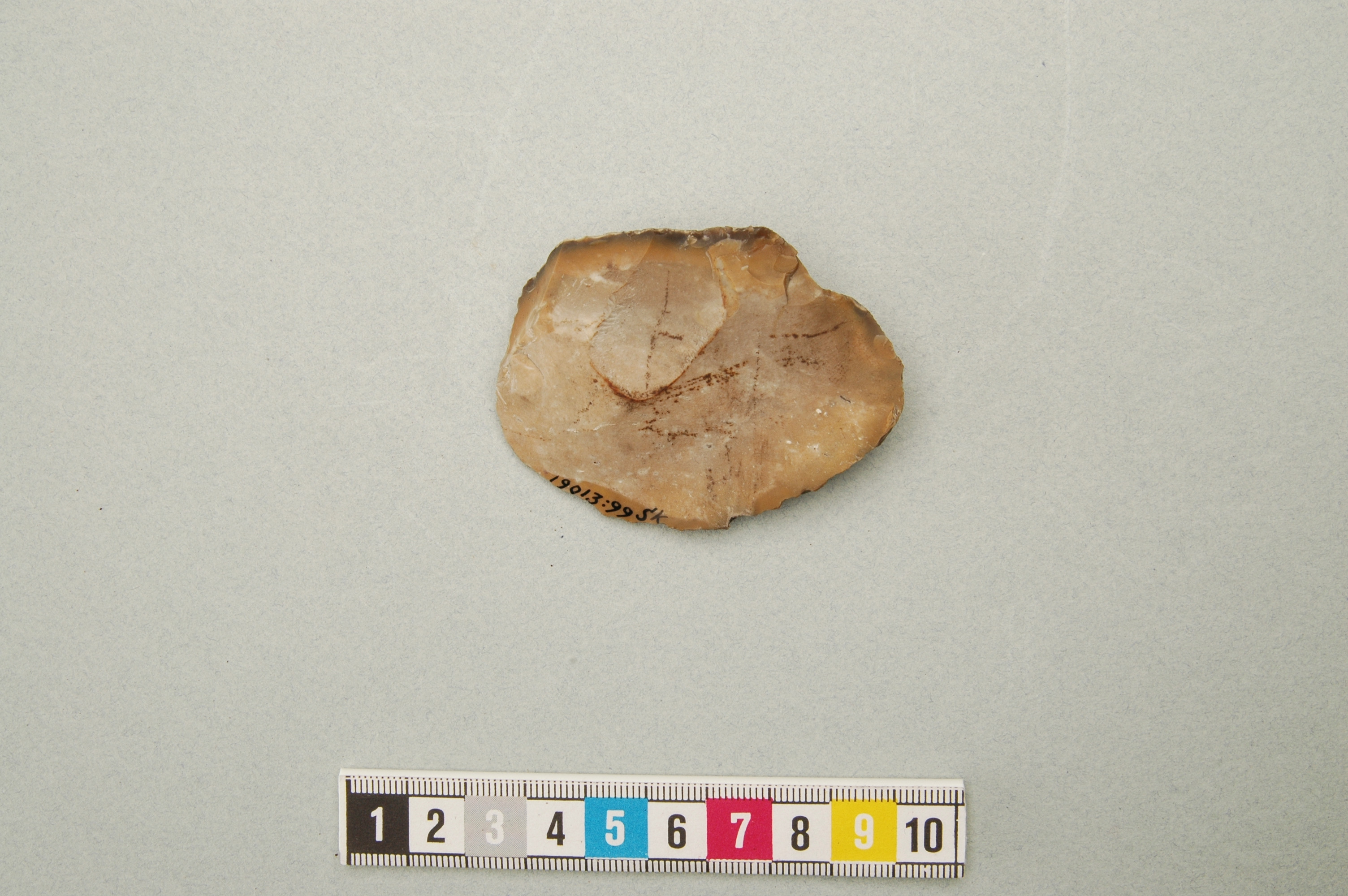 Skivskrapa av sydskandinavisk flinta. En del av kritskorpan är bevarad.