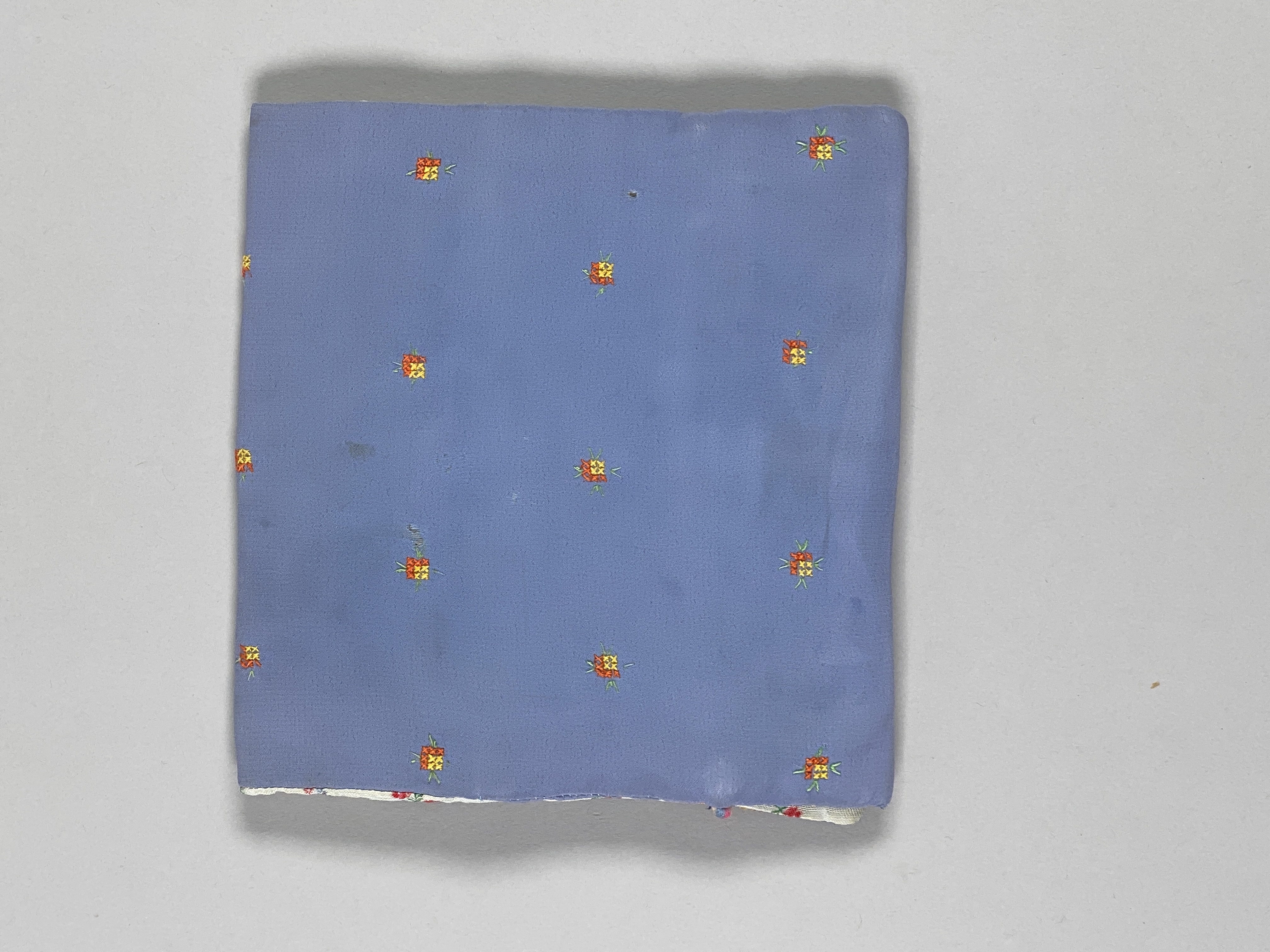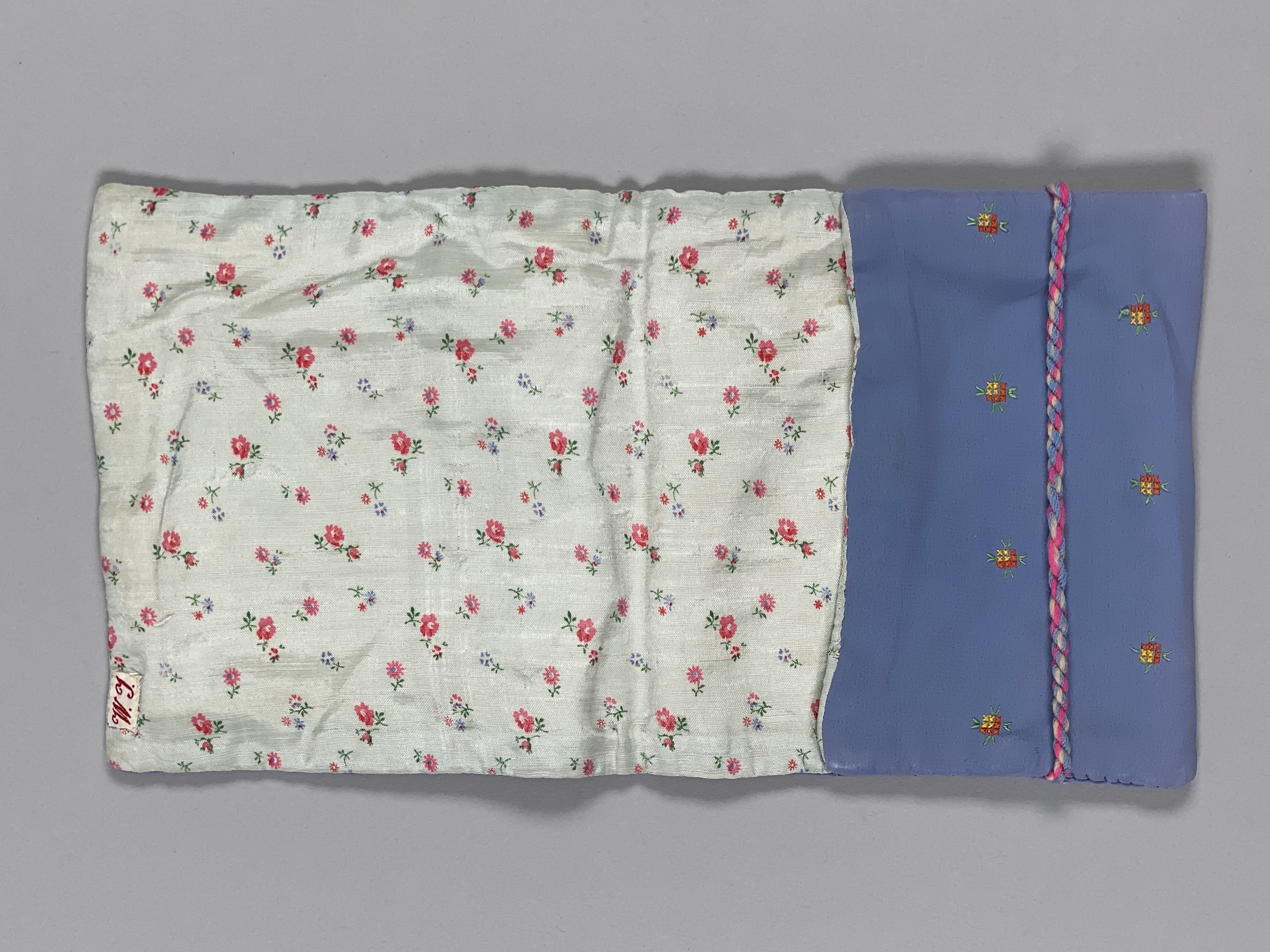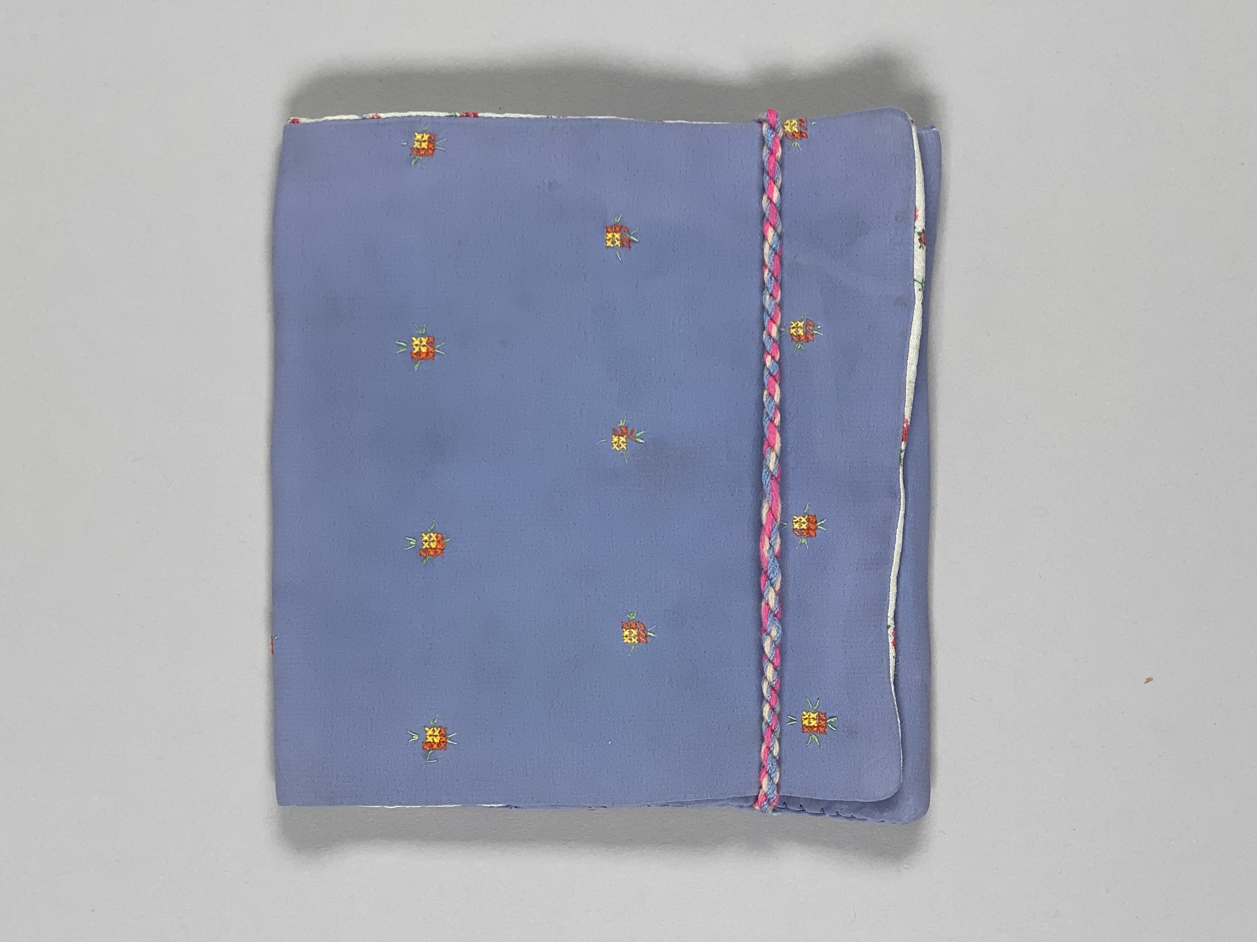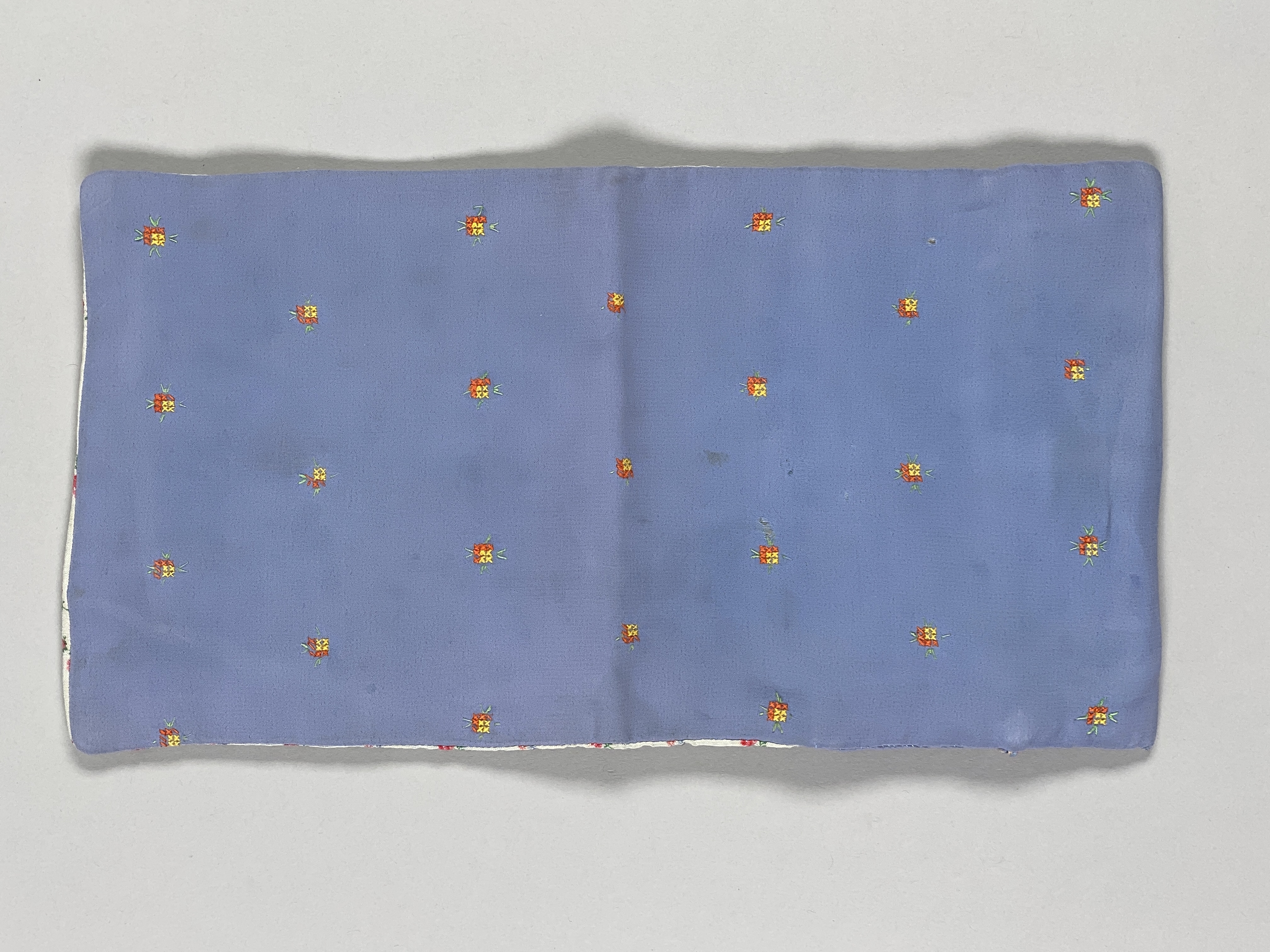 Liten blå, blommig väska för näsdukar. Fodrad med vitt, blommigt tyg. Vikes dubbel och försluts med snodd.