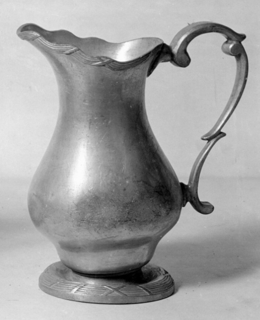 Päronformad kanna av tenn, vågig mynning med repstav runt kanten. Oval fot med repstavskant. Lodgrepe formad som tre sammanhängande C-bågar.