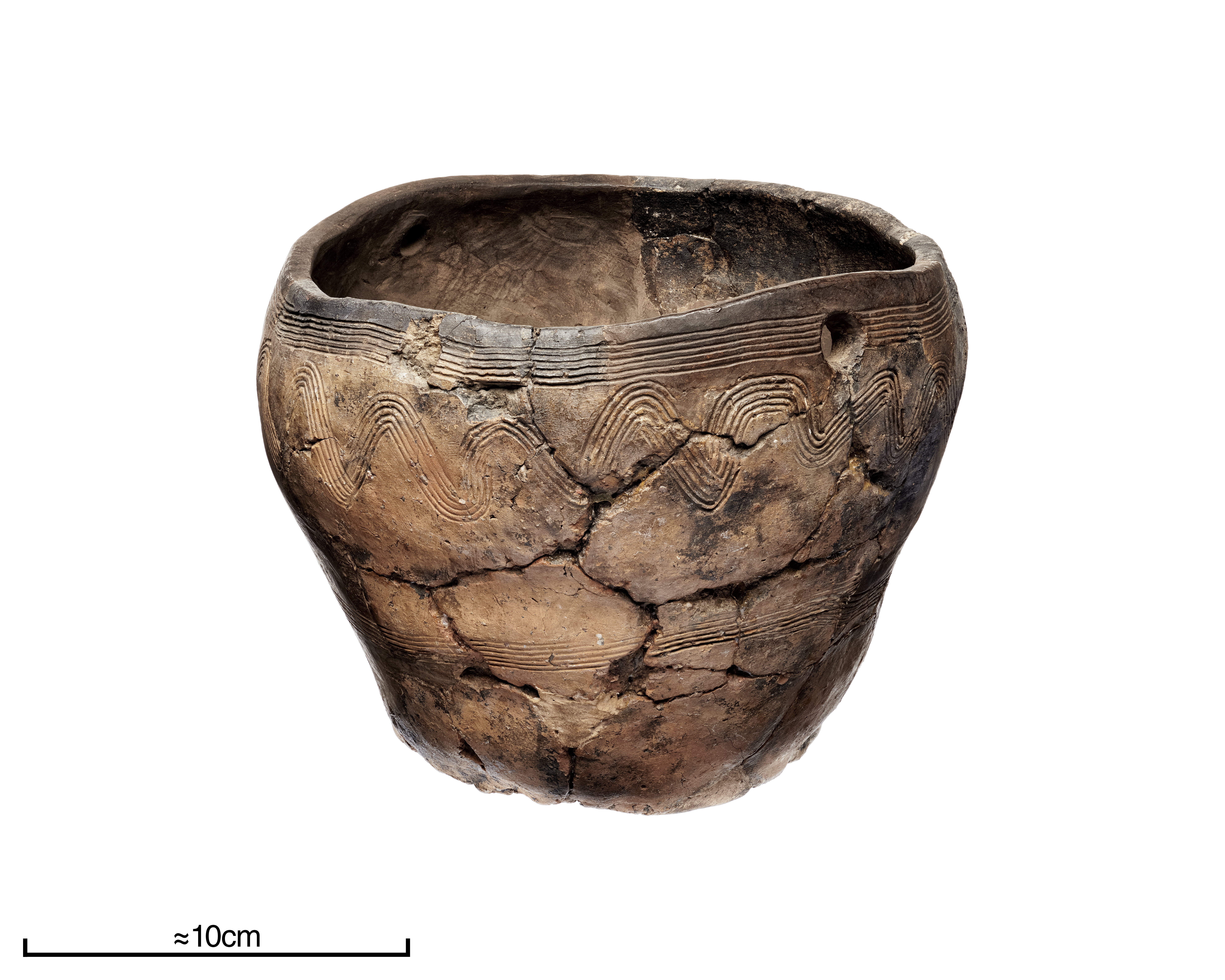 Delvis rekonstruerat kärl med inåtböjd mynning, plan mynningsrand och dekor av parallelle linjer och sicksacklinjer. Två hål vid mynningen; för handtag eller upphängning.