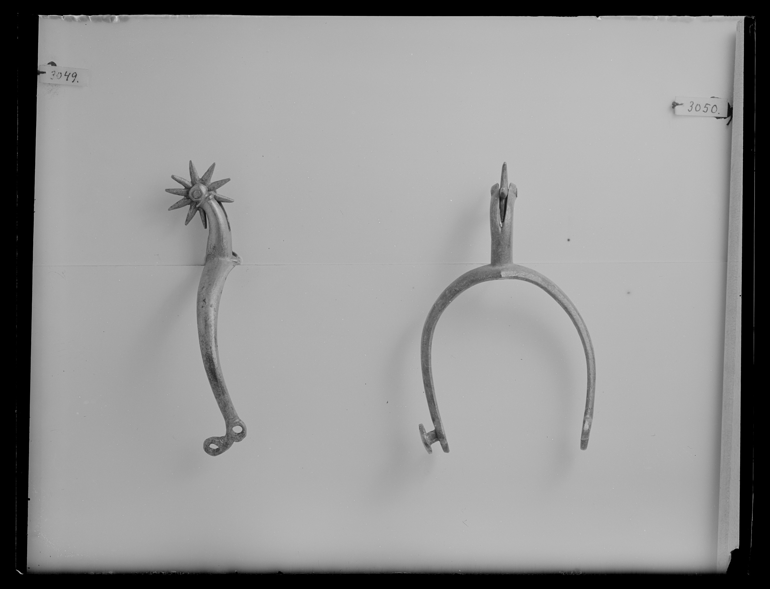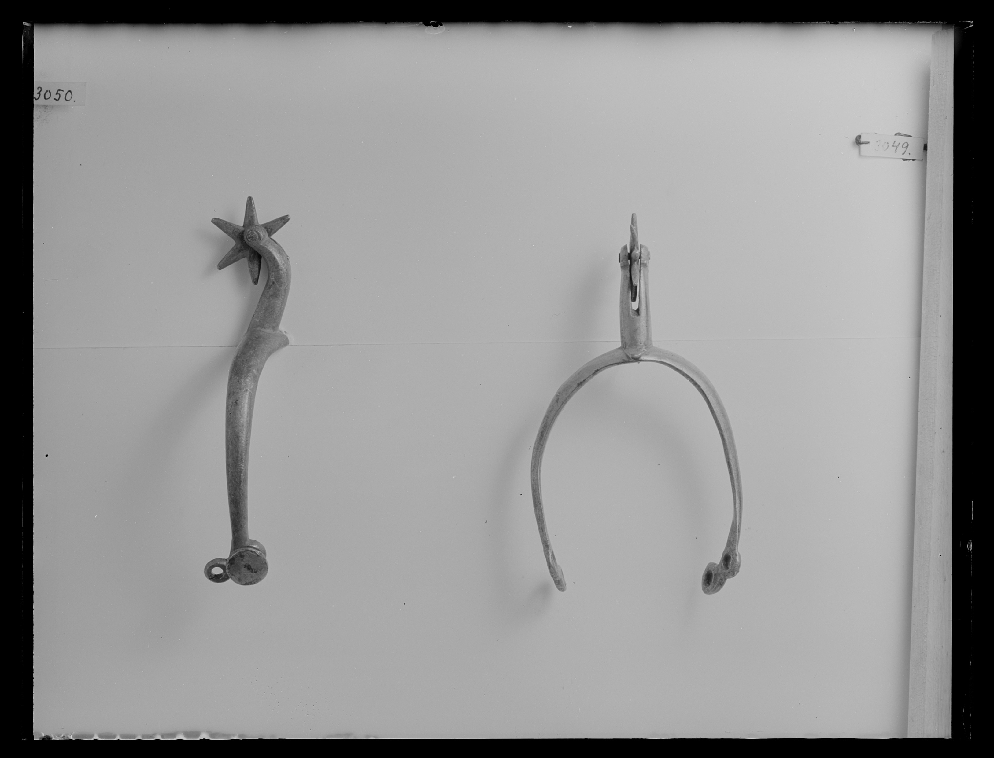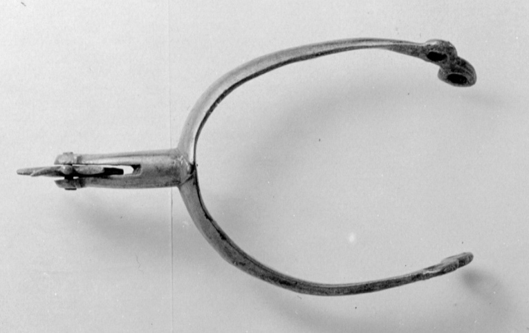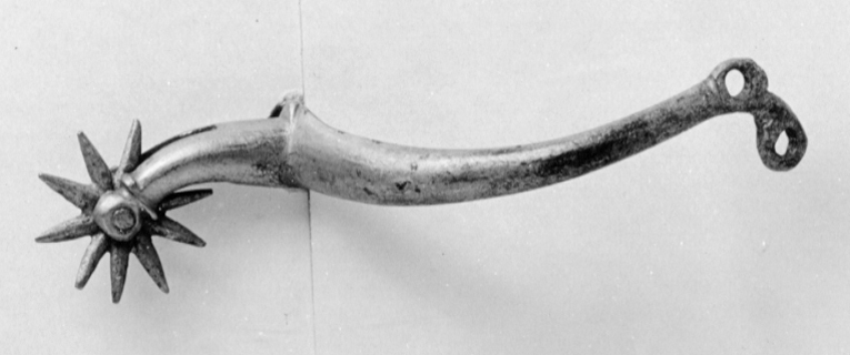Sporre av förtent stål med u-formade skänklar, 37 mm lång böjd hals och tiouddig klinga. Vid skänklarnas ändar två ringformiga hållare (för sporrläder).