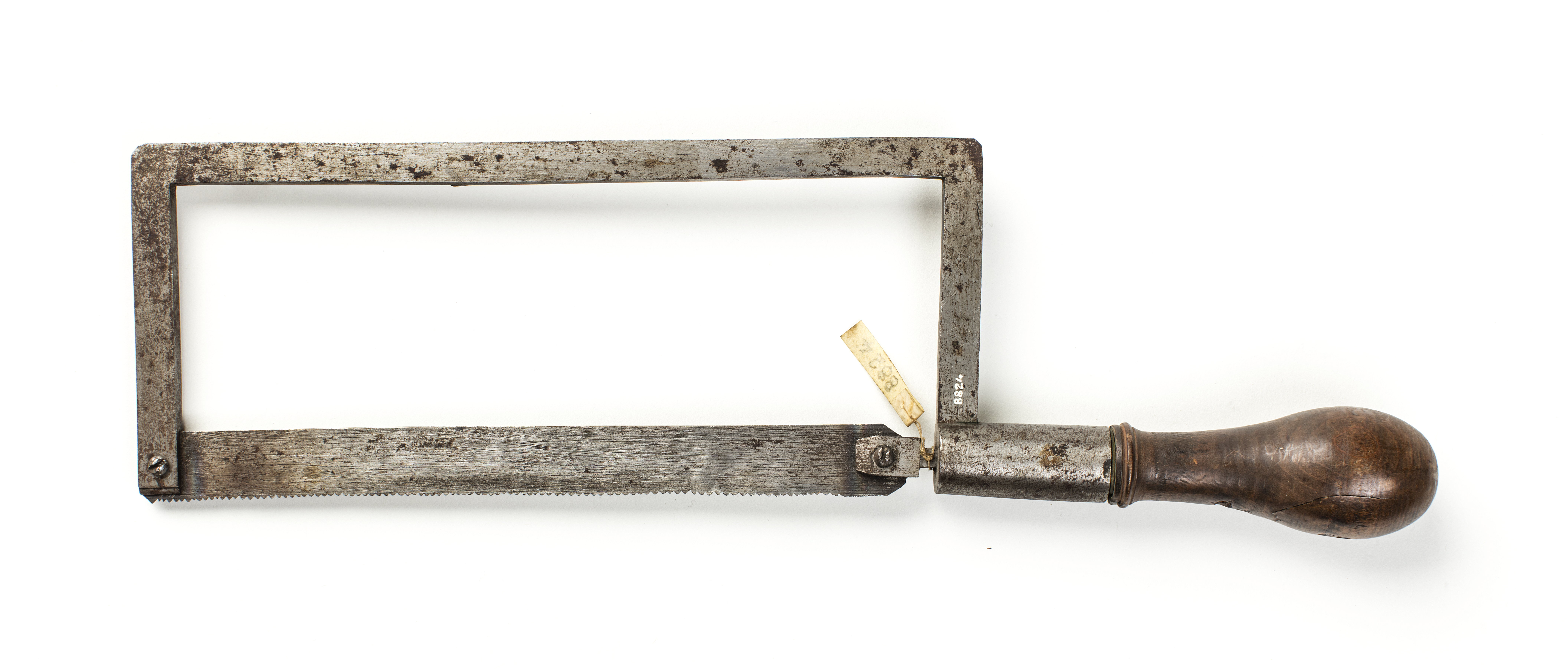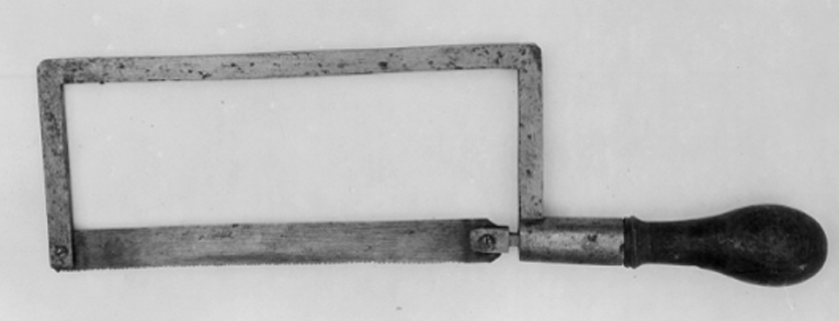 Bågsåg med båge med räta, på utsidan avskurna hörn och rektangulärt tvärsnitt. I ena änden finns en slits i vilken bladet är fastskruvat och i den andra en hylsa i vilken det sitter en fyrsidig axel med en slits i vilken bladets andra ände är fastskruvad. Axeln, vars andra hälft är gängad, går axialt i hylsan och på gängan skruvas handtaget som är svarvat, kägelformigt och i fäständen försett med en mässingshylsa som skruvas in i hylsan på bågen. Invid hylsan är skaftet dekorerat med två vulster och en mässingsstav är stucken genom skaftet. Staven har ett gängat hål placerat axialt i skaftet och i detta skruvas axeln. Tandavstånd 2 mm.