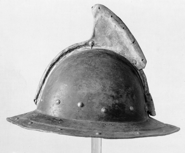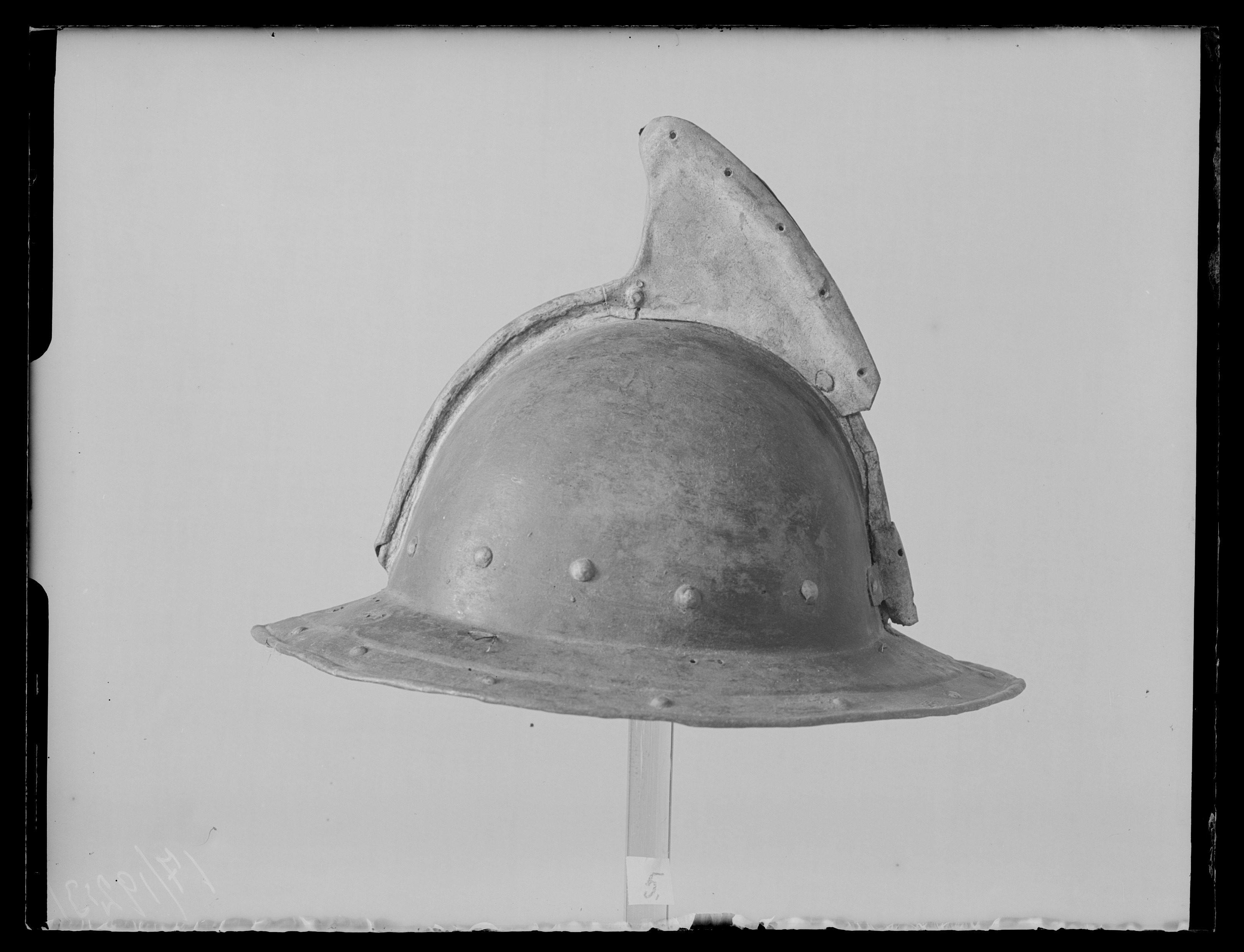 Hjälmen består av två sammanfogade "halvor". En låg kam löper över klockan. De två halvornas uppsmidda ytterkanter är lagda emot varandra och sedan är kanten vikt och rullad upptill, vilket skapar en stark söm i kammen. Baktill på hjälmen, fastnitad på var sida om kammen, sitter en plymhållare i plåtbleck med 3 hål slagna i. I den låga sammanhållande kammen är en fenliknande hög kam fastsatt med två nitar, troligen fastsatt i samband med tornerspelen under det sena 1700-talet. Troligen vid samma tillfälle har hjälmen blivit svartmålad, med beige/guld-färg på brättets kant, kammen och "fenan". Nedtill har hjälmen ett nedåtsluttande brätte (ca 6 cm brett), vars nederkant är vikt inåt. Innanför kanten är en försänkning, i vilken löper en rad av "falska" punsade nitar. I klockans nederkant är en rad av järnnitar runtom. På insidan håller de med brickor fast en läderrem, vilken utgjort fäste till den gamla infästningen. I kanten där brättet möter klockan är en rad av små slagna hålpar hela vägen runtom. I toppen av klockan är ett liknande hålpar slaget. Dessa hål är troligen slagna i samband med att hjälmarnas renoverats för tornerspelen, dvs. inte från 1600-talet och brukningsperioden. Hjälmen har ett intakt foder, bestående av grov lärft, ihopsytt av två halvor. Under är en stoppning av linblånor. Fodret är fastsnört i de ovan nämnda hålparen med linnetråd. Två smedstämplar framtill på brättet: föreställer nån slags svårtydbara figurer. Vid stämplarna är färgen avskrapad.