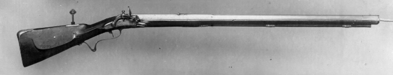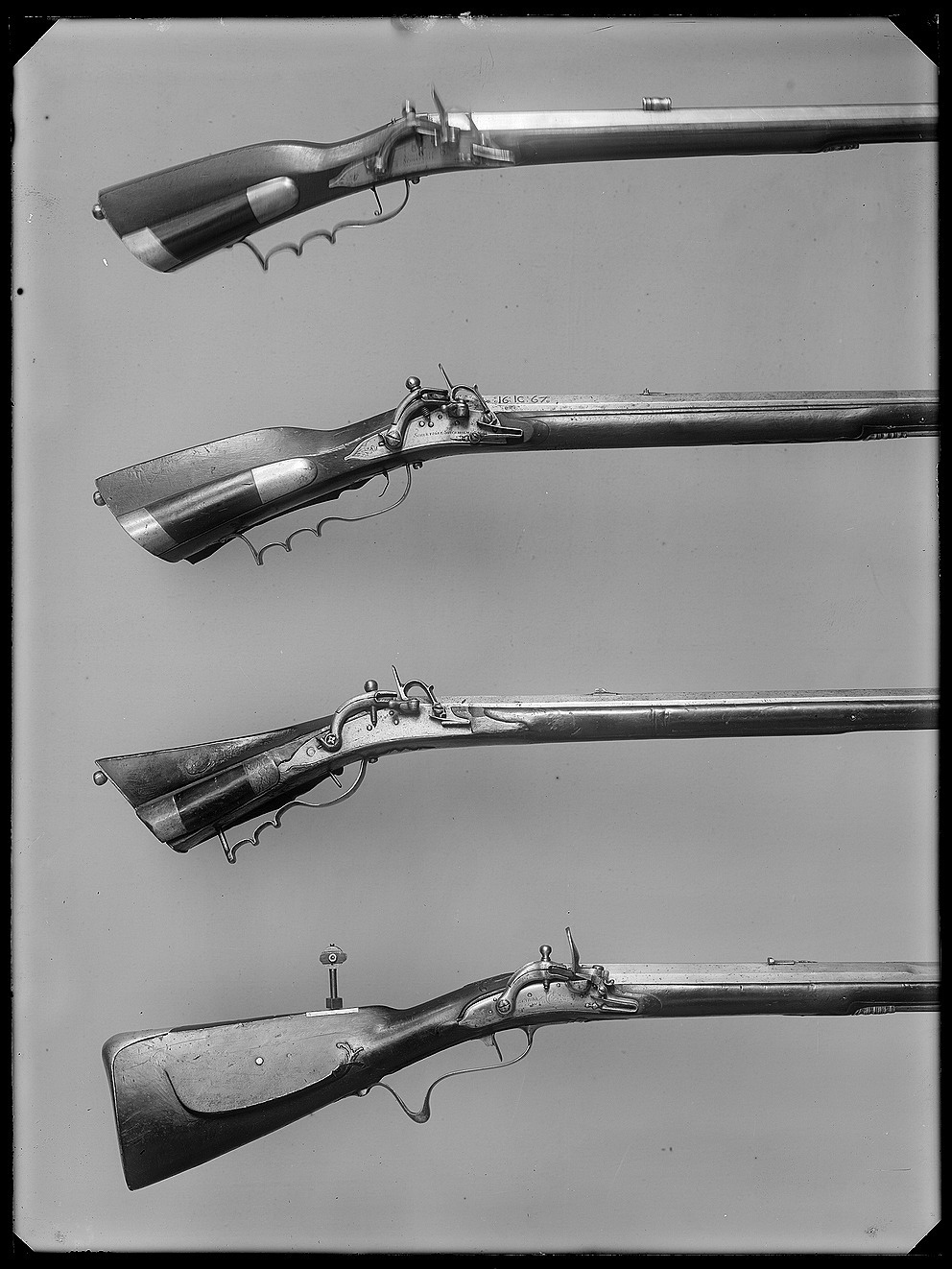 Åttsidig pipa av stål, åtta räfflor. Pipans främre del niosidig. På kammaren en tre gånger upprepad stämpel i form av ett blad krönt av öppen krona (LRK vägledning 1921 nr 209-210), mittstämpeln omgiven av P S B. Framför kammaren ett graverat blad. Riktmedel: Ståndsikte av stål, framförliggande blad. Spolformigt korn av silver. Dioptersikte nr 20434. Fästning: Tre häften. Pipan fäst med krysskruv. Flintlås av snapplåstyp, springlås. Välvt låsbleck med graverad trofégrupp på bakre spetsen, nedanför fängpannan en bock och ett jakthorn. Graverad signatur: "STARBVS STOKHOLM". Böjd hane med inlaxad överkäke. Rund fängpanna med fals. Eldstål med åsad rygg, fäst på fängpannans lock. Fästning: Två låsskruvar.Rak avtryckare med rundad framsida. Helstock av valnöt med vänsterkolv, anslag på h. sida med en benknapp på mitten, kolvlåda med lock av stockens trä på v. sida, snidad dekor runt svansskruvbladet. Näsband av horn, övriga beslag av stål. Bakplåt med tunga på kolvryggen, framför tungan en stålplatta med mässingsskott hål för dioptern. S-formigt, välvt sidbleck med ovalt mittparti. Tre profilerade rörkor. Varbygel med pungformigt nedsvängd bakre arm. Tillbehör: Laddstock av trä med skoning av horn, stålskruv med bladformigt huvud.