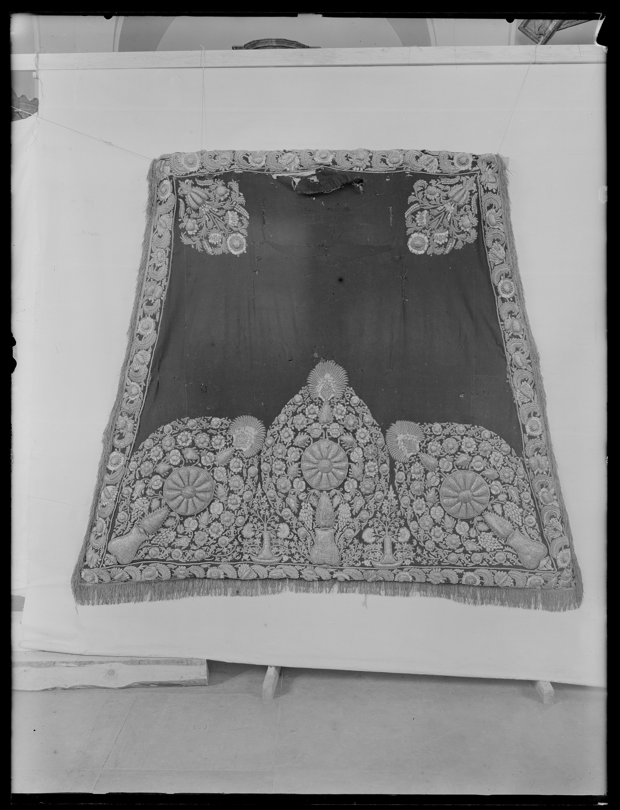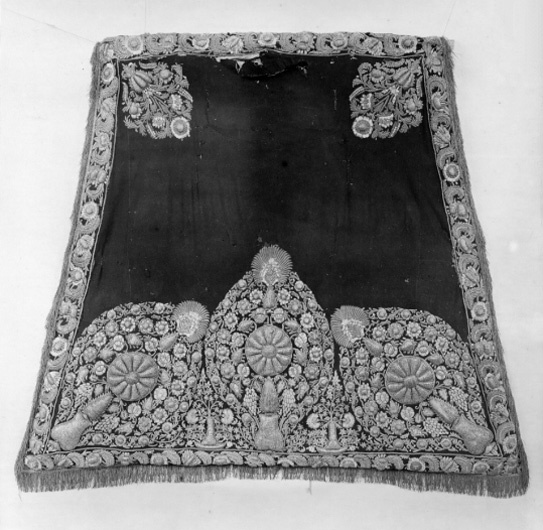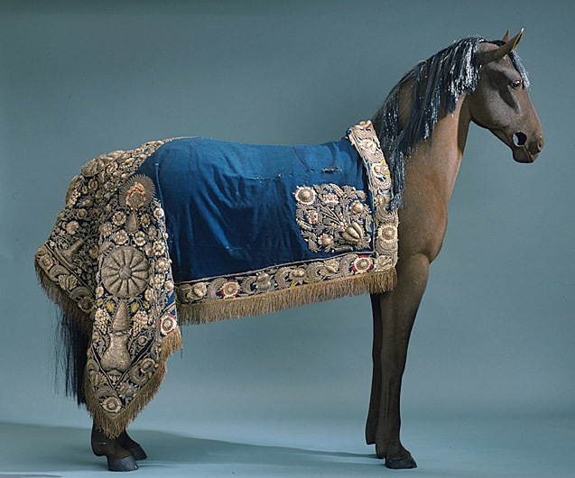 Fyrsidigt sadeltäcke av blått kläde, avsmalnande framåt. Bakre och främre kanterna raka, främre kantens bredd 1670 mm. Framsidan täckt av kläde och sammanfogad av en 1310 mm bred mittvåd, skarvad vid sidorna. Broderier i silke, guld- och silvertråd. Innanför bakre kanten tre identiskt lika blomsterornament, det mellersta sträcker sig rakt upp från kanten, de två flankerade är sydda diagonalt från hörnen räknat och lutar sig mot det mellersta. Varje mönstergrupp mäter 910-940 mm i längd, 560-590 mm i bredd och har i det närmaste spetsoval form. Ornamentets mittparti består av en blomma, d: 210 mm, med cirkelformat mittparti och 12 kronblad, allt utfört i hög, applicerad relief med fyllning av lingarn, täckt med silverlan, ytterst ett rutmönster av silverlan, snott kring en tråd. Blommans mittparti samt vart och ett av kronbladen omges av en snodd av lindad guldtråd, en likadan snodd omger även hela blomman. Blommans "stjälk" består av två delar, båda i relief som blomman ovan och med en sammanlagd längd av 320 mm, den nedre delen, vars största bredd är 120 mm, har buktiga sidor och kantas av en snodd som den stora blomman ovan, den övre delen smalnar av upptill närmast under blomman, största bredd 65 mm, utmed dess sidor finns små blad av guldtråd i läggsöm. Över blomman finns en mindre pendang till en figur som utgör stjälkens översta del, denna övre figur fortsätter upp i ett palmettmotiv, där mittpartiet är av silverlan, omgivet av silkesbroderier: vitt, rött, gult och blått i schattersöm. Den stora blomman omges av växtornament, huvudsakligen blommor, dess mittpartier är i relief i samma utförande som ovan. Kronblad av varierande typ, silkebroderier i rött, gult, vitt och grönt. Blommornas ytterkanter och blad markerade med silverlan eller guld- och silvertråd i relief eller läggsöm. Druvklasar av ljusbrunt silke i schattersöm samt silverlan. Utrymmet mellan de tre stora mönstergrupperna utfylls av ett litet trädliknande växtmotiv, h ca 350 mm, stam av silverlan i hög relief ovan, grenar av guldtråd i relief, blommor och blad som ovan. I vart och ett av de två främre hörnen finns ett blomstermotiv, 440x370 mm, överst en blomma med mittparti i hög silverrelief, omgivet av små blad: silvertråd i låg relief, ytterst kronblad av silke i rött, vitt och gult, silverlan. Ornamentets nedre partier består av blommor i silkesbroderier med samma färger som ovan, blad och stjälkar av guld-och silvertråd i reliefsöm. Utmed täckets ytterkanter går en ca 100 mm bred bård av blommor och blad, utfärda i samma teknik som de i täckets främre hörn, bårdens innerkant markeras av en snodd av guld- och silverlan. Utmed täckets bakre kant samt de två långsidorna går en dubbel frans, den undre är 70 mm bred, varav kanten 5 mm och av silver och grått silke, den övre är av guldtråd, l: 100 mm, varav kanten 10 mm, kanten har invävd guldlan. Täcket har sex springor avsedda för remmar, samtliga är igensydda. Foder av gult atlassiden i satinbindning, två våder om vardera 640 mm, skarvade vid sidorna. Upptill sitter 5 st ringar av gulmetall, d: 20 mm, monterade på tränsar av ljusbrunt läder. Nedtill en fastsydd pappersetikett med texten"B a r o n K l i n g s p o r r e" i brunt bläck. Mellanfoder av linnelärft.
