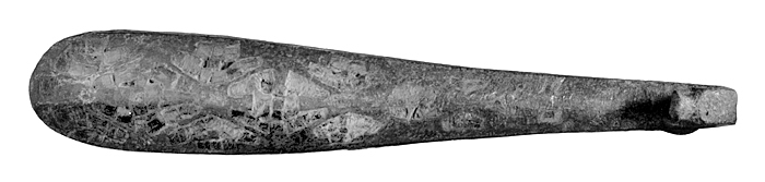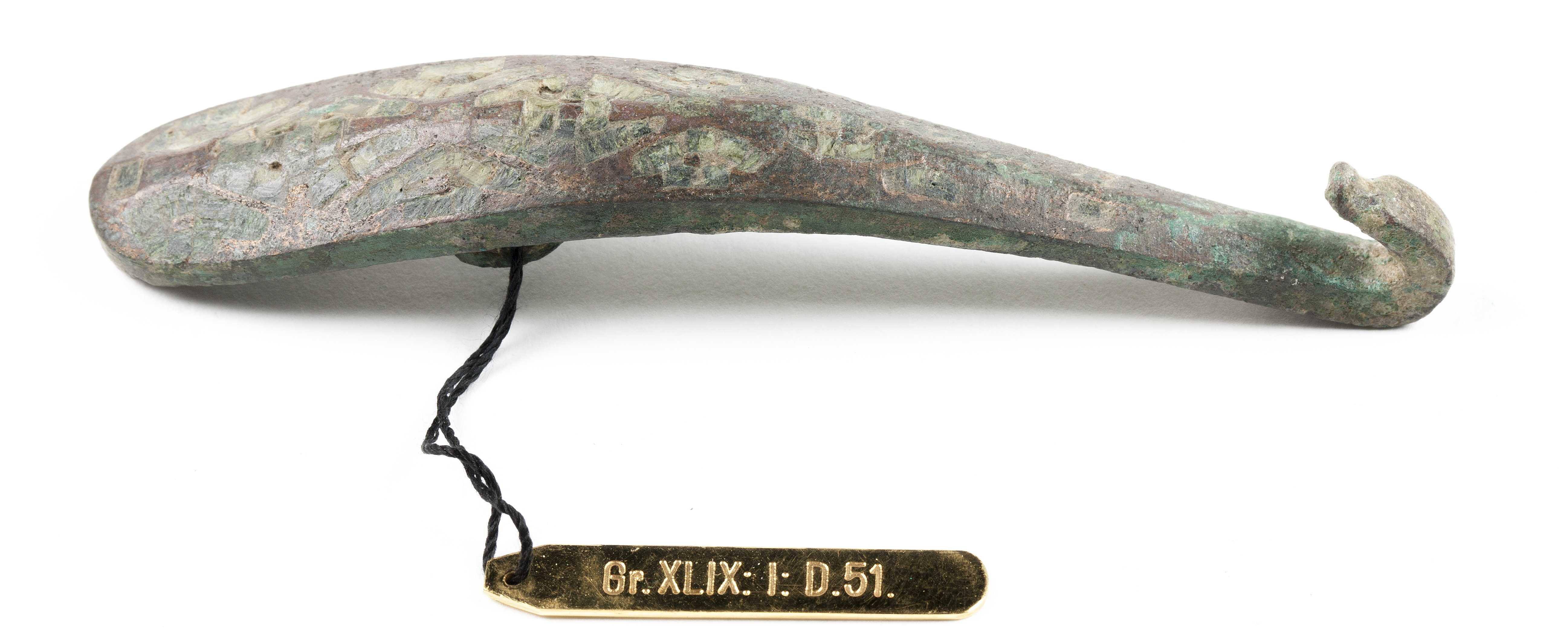 Bälthake. Lång, starkt böjd, avsmalnande mot halsen samt med tvåfasad framsida. Halsen omböjd som hake och avslutad i ett ormhuvud. Kroppen med rundad avslutning. På framsida inlagt ett mosaikmönster av fyrsidiga bitar i grön massa, bildande rombiska och triangulära rutor, skilda av smala bronsväggar. Baksidan platt, ett stycke från bredändan en rund platt knapp på kort grov hals. Längd: 11,8 cm.; bredd: 2 cm.