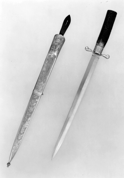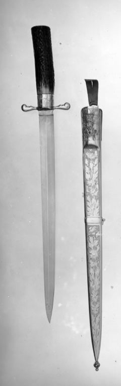 Balja av stål i utdraget konisk form med yttäckande ornering av etsade blad och rankor mot matt botten. Baljan upptill vidgad med två skåror vid kanterna. På utsidan upptill spegelmonogram G under kronprinskrona. På baljans mitt slätt mellanband med liten, kulformig hållare för koppelring på bakre kanten. Doppsko av genombruten mässing med kulformig, slät avslutning. Upptill på insidan oval hållare med bärring av stål. I denna en 74 mm lång, brun läderstropp med knapphål och spetsig avslutning. Nr 35 i Gustaf V:s vapensamling. Gåva av Gustaf VI Adolf genom K. Husgerådskammaren 1957-03-05.