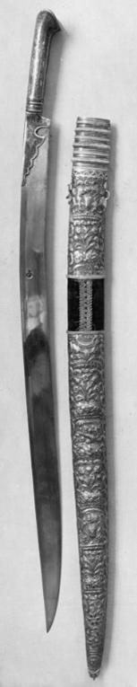 Skaft av ciselerat silver med dekor i hög relief i form av vågband och droppar. Skaftets ytterände är böjd mot eggen och vågformad. Skaftet fortsätter i en kil på bladets bas med graverad dekor i form av blad. Klinga eneggad, något böjd av stål med graverad dekor i form av slingor och orientalisk text, på klingans insida dessutom en rund stämpel. Graverad dekor i form av rankor på klingans utsida.
