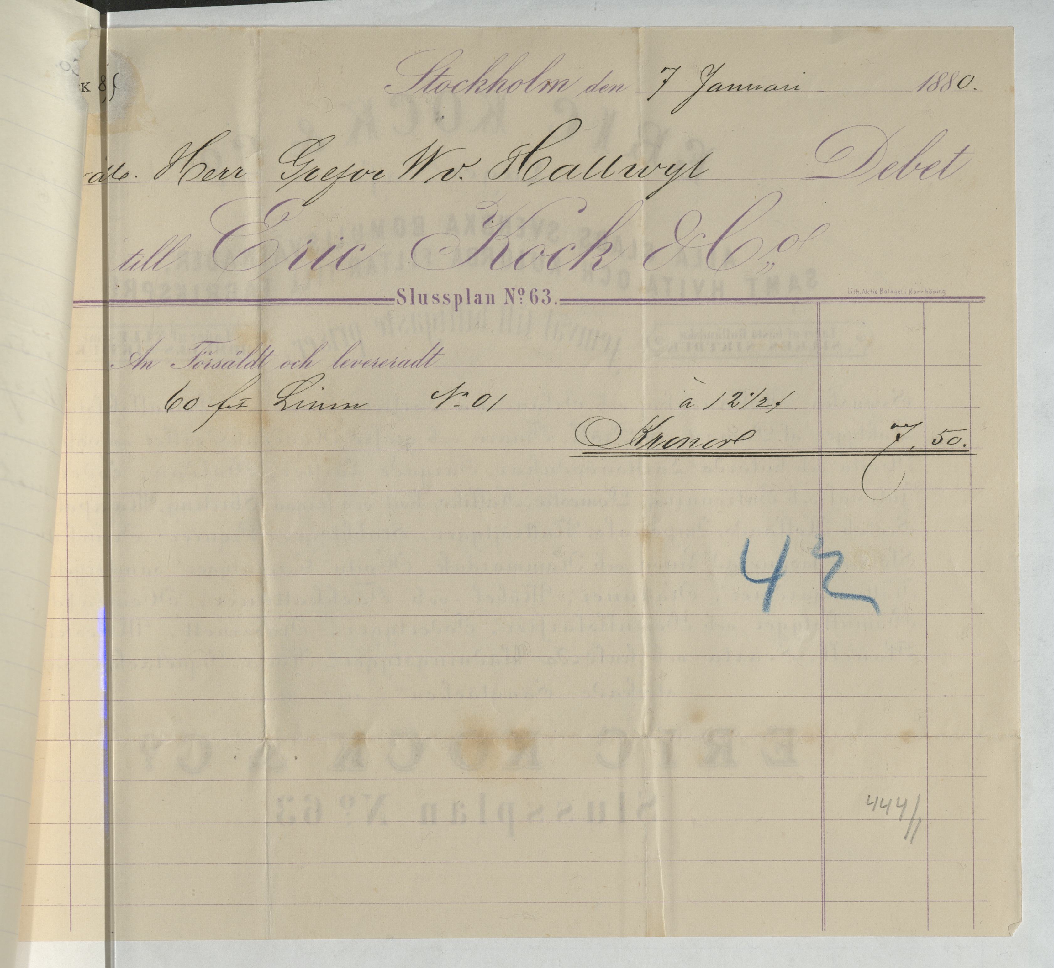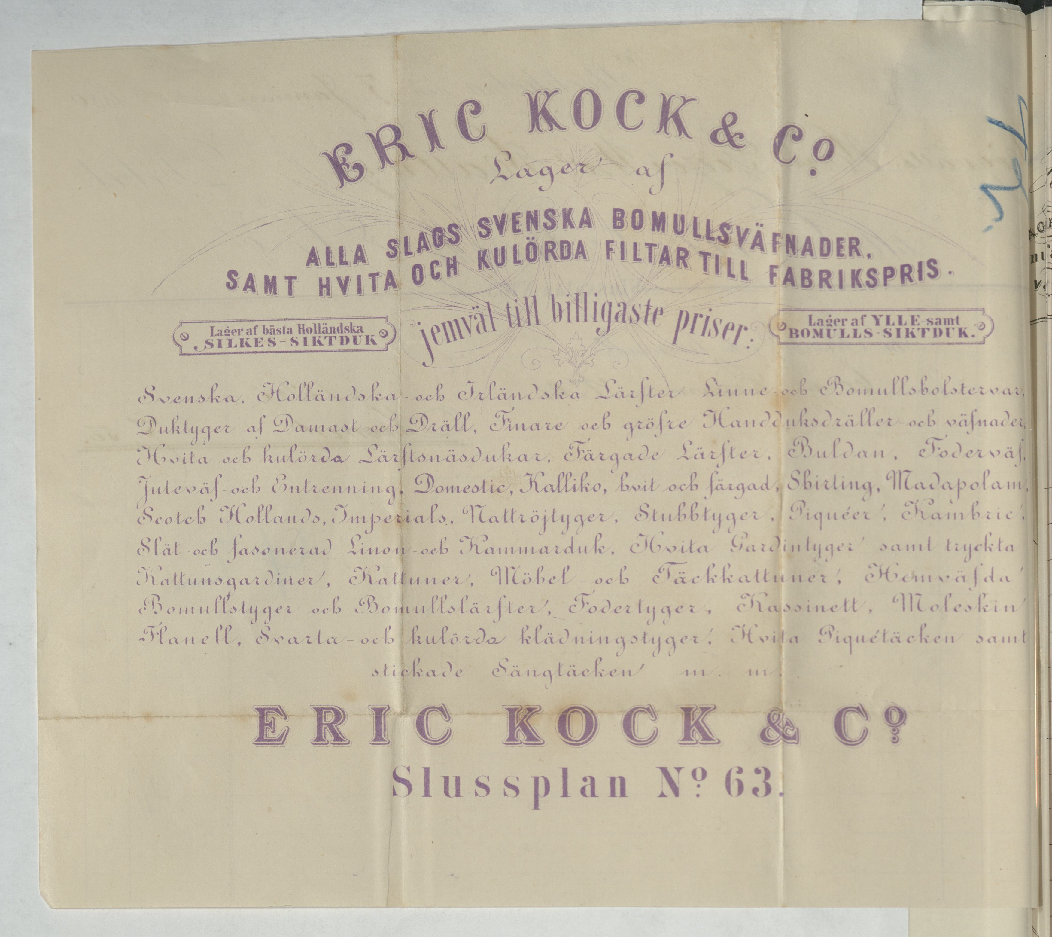 Kvitto från Eric Kock & Co. Alla slags svenska bomullsväfnader, Samt hvita och kulörda filtar till fabrikspris. Stockholm, 1880.