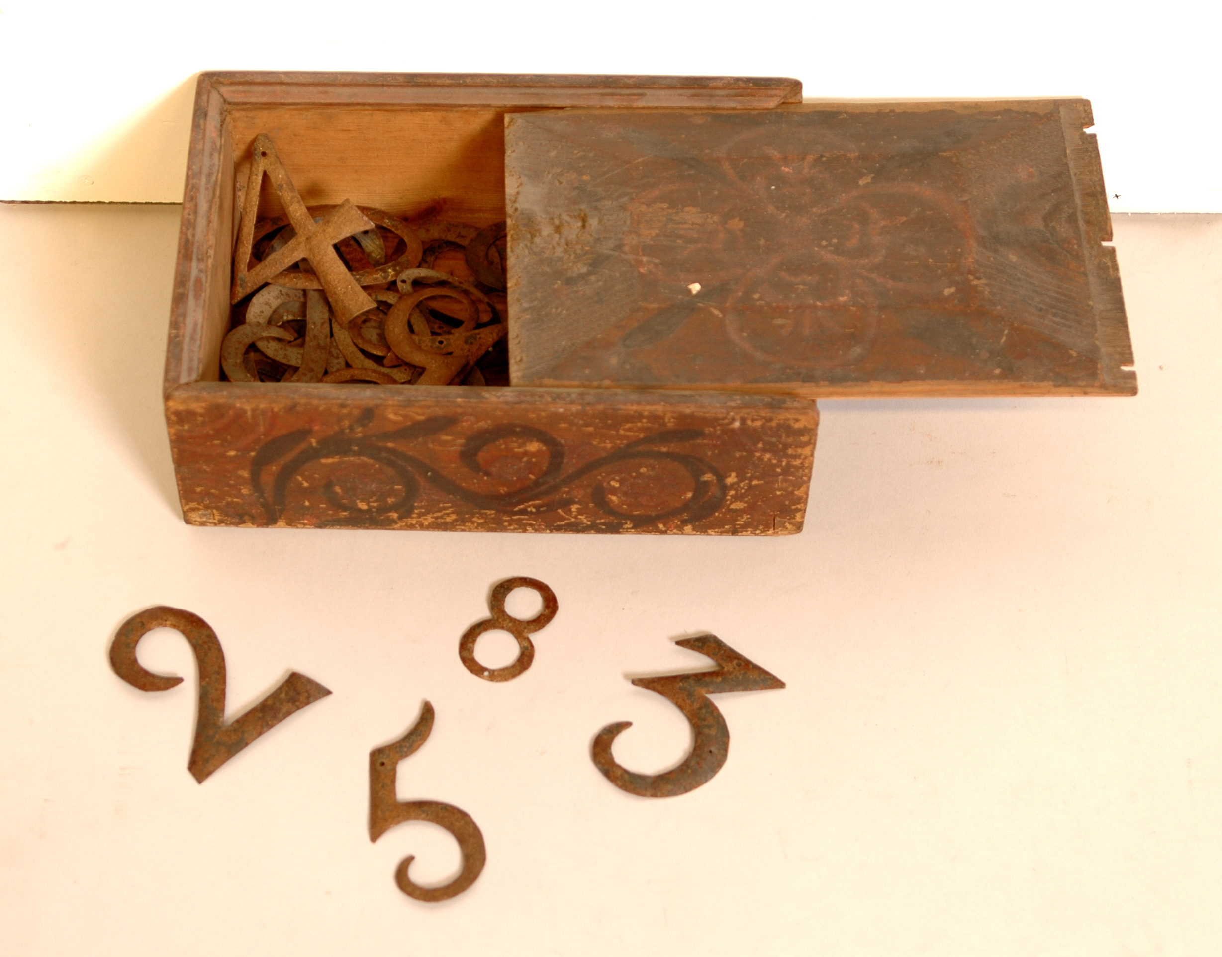 skrin med allmogemålning innehållande 43 psalmsiffror