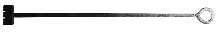 BRÄNNJÄRN Av järn. Bestående av ett mot ett skaft tvärställt rektangulärt stycke, på vars undersida i högrelief initialerna W H K (Wilhelm Henrich Kempe). Skaft långt, fyrsidigt, avsmalnande utåt, yttre ändan omböjt i en oval platt ögla. Längd: 44 cm. Tvärstycke, höjd: 2,1 cm, längd: 4,1 cm, bredd: 1,4 cm. Överförda av Wilhelmina von Hallwyl år 1916 från säteriet Ericslund till Hallwylska huset, Stockholm.