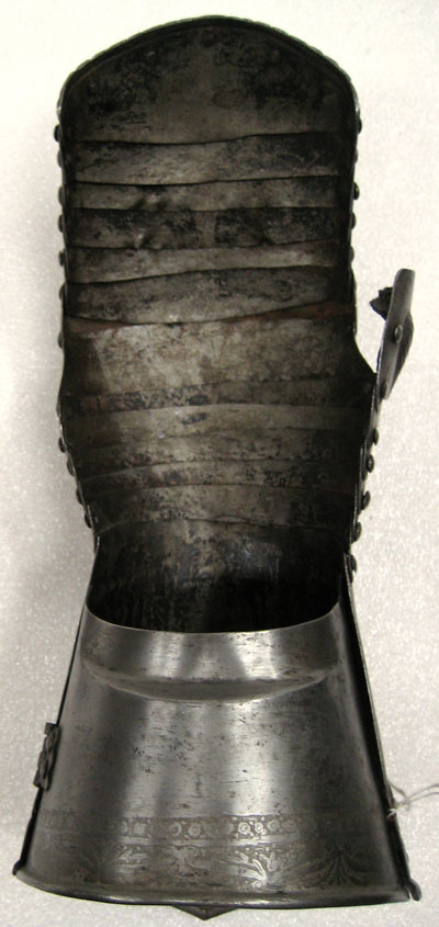 Denna rustningsdel utgör en del av en rustning som inkom till Livrustkammaren genom Karl XV:s testamente. Den hade tidigare varit överintendenten Fritz von Dardels ägo. Till denna rustning, som tillverkats i Nordtyskland under 1500-talet mitt, tillverkades under 1800-talet kompletterande delar. Dessa avlägsnades år 1894 men finns fortfarande kvar i Livrustkammarens samlingar.