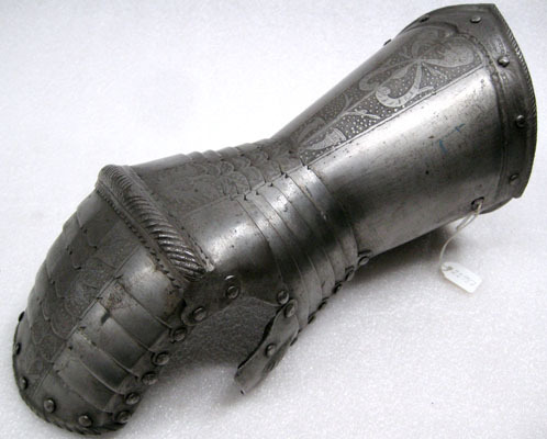Av stålplåt. Utsidan slipad blank med etsade något mörkare bårder. Sammanlagt 16 delar. Krage i två halvor, öppningsbar med gångjärn och tapp genom hål. Ovansidan utdragen i spets, kanten invikt och repstavsformig. Etsad kantbård avgränsad inåt med försänkning. Även en etsad bredare bård löpande längsmed hanskens mitt. Handen utgörs av sex skenor satta omlott, likaså fingerskyddet. Över skarven mellan dem ett knogskydd av åsad smalare skena med repstavsfilning och tandade kanter. Skenorna är flikigt tillfilade i mitten och fingerdelens sista skena har invikt repstavsformig kant. Tumskydd av ursprungligen fyra lameller (tre saknas), den första större än övriga och med uppdrivet droppformigt ornament.