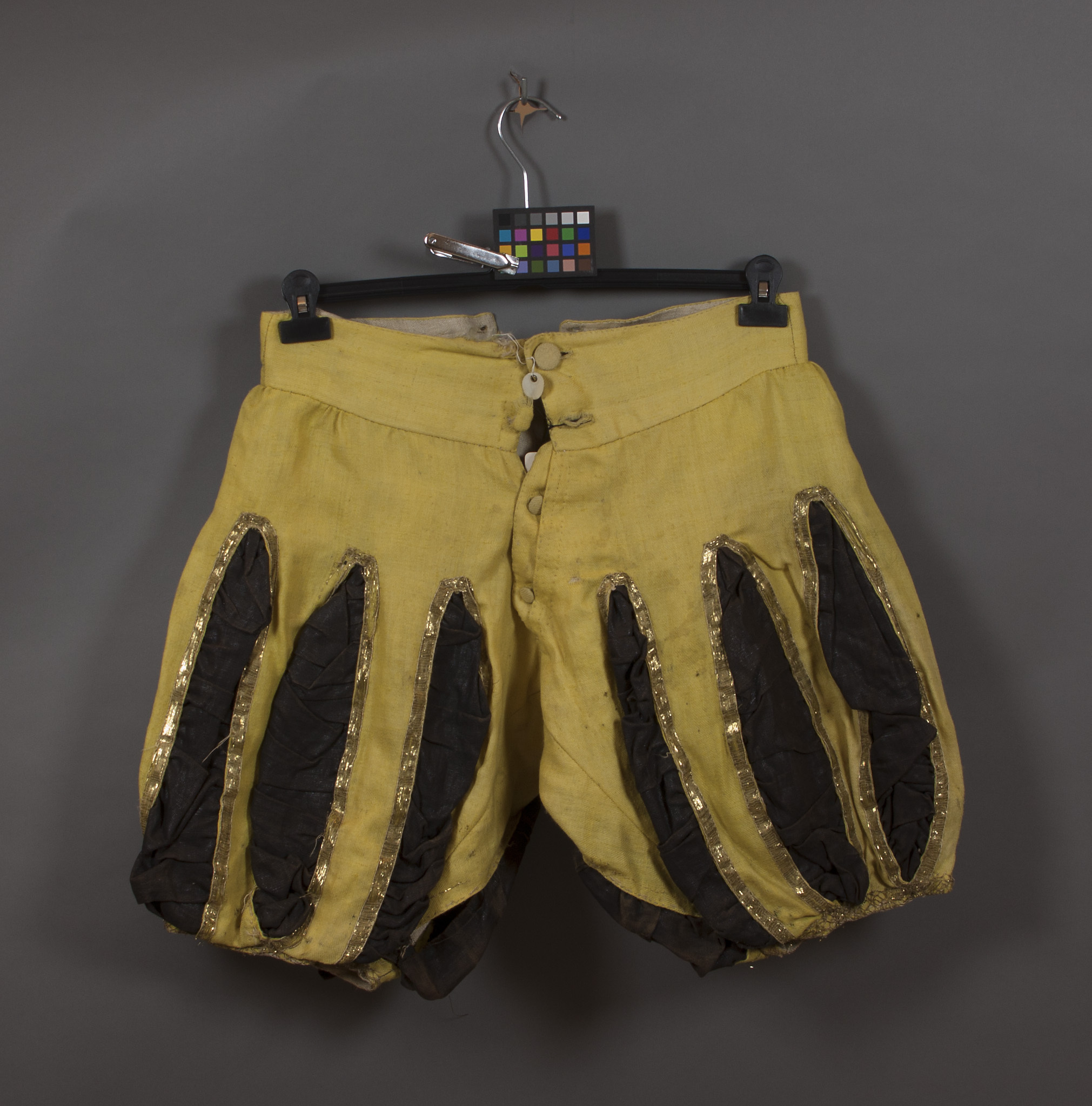 Knäbyxor av gult, kyprat ylle, rask, skurna med gylf. Knäppning i gylfen med två knappar, diam. 14 mm, i linningen likaså två knappar, diam. 23 mm, alla klädda med byxans tyg. Sprund mitt bak, längd 120 mm, med i linningen två sydda hål kastade med lingarn. Tyget i byxbenens slitsar av svart raskat linne. Slitslängd i sidsömmen ca 360 mm, vid innersömmen ca 310 mm. Slät guldgalon, bredd 12 mm, vid slitsarna. Vid nederkanterna flätad guldgalon, bred 15 mm. Foder av oblekt, tuskaftat linne. Rosersberg 1945 nr XL: 11. På linningens bak fastsytt pappersetikett med bläckpåskrift: "A // N:o 24".