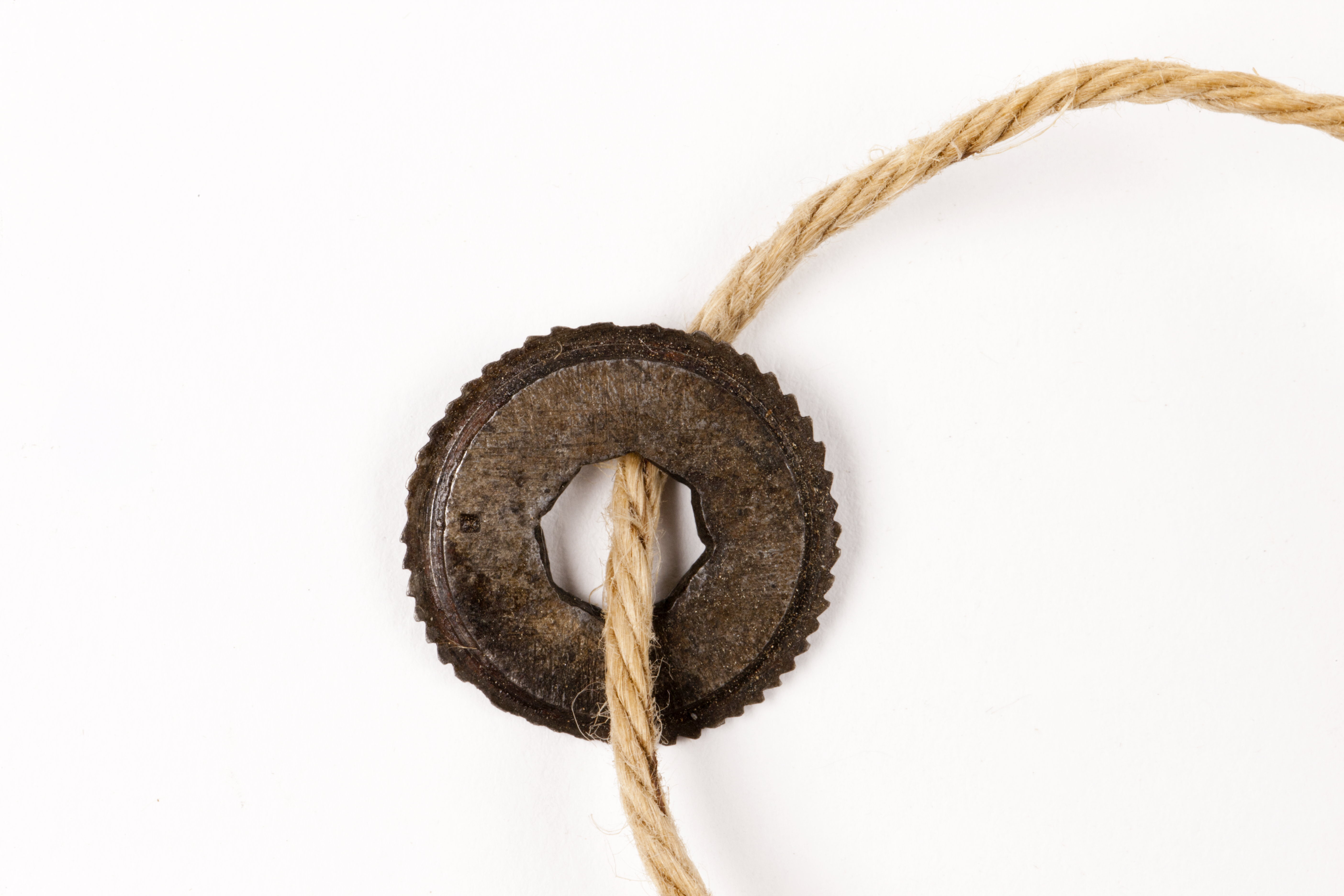Rund, tjockare mot mitten. Tvärställda tänder. Hålet oregelbundet åttsidigt, hopslaget, diag. ca 7 mm.
