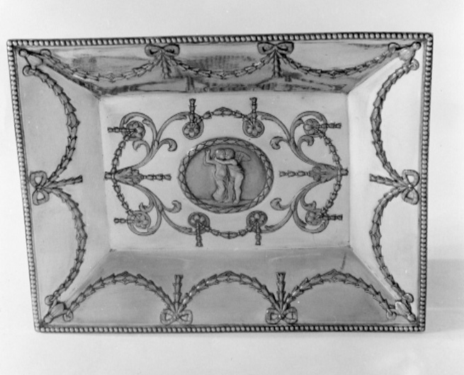 Rektangulär bricka av gjutet och förgyllt silver med dekor i relief. Runt kanten pärlstav. Det raka brättet har gjuten, ciselerad och pålödd dekor i form av bladvolut i varje hörn och på sidorna sammanlagt 6 bandrosetter med sammanhållande bladfeston emellan. I brickans mitt en lagerkransomsluten oval med en scen i relief: Putto omfamnande en älvflicka (?). Runtom bladgrotesker med festoner. I bottnen ristat "62 1/2" (avser lod) och i vardera hörnet inslaget en stämpel:1) Smith och Sharps fyrpassformade stämpel med DS RS, 2) Londons krönta leopardhuvud, 3) Londons lejon, 4) årsbokstaven b.