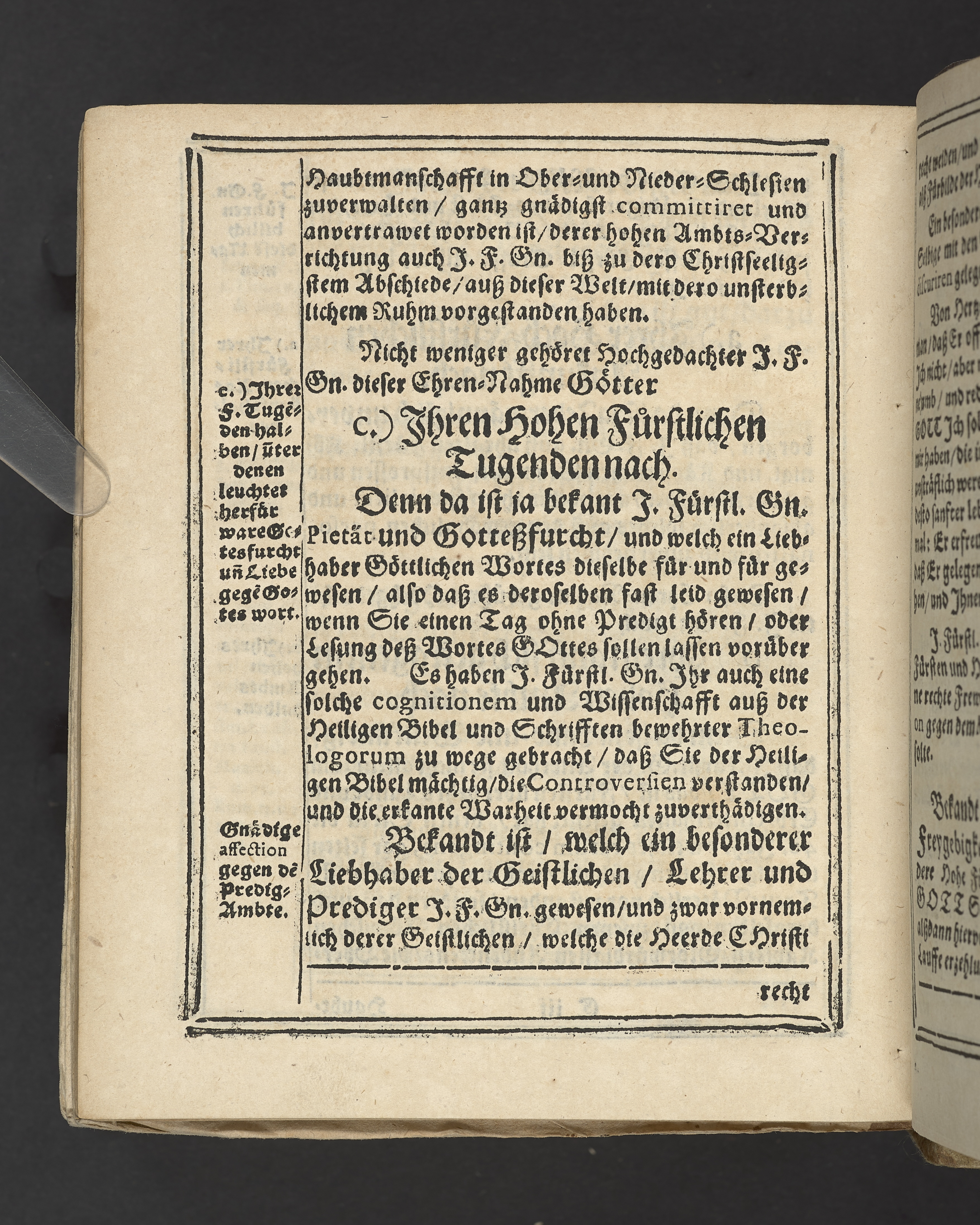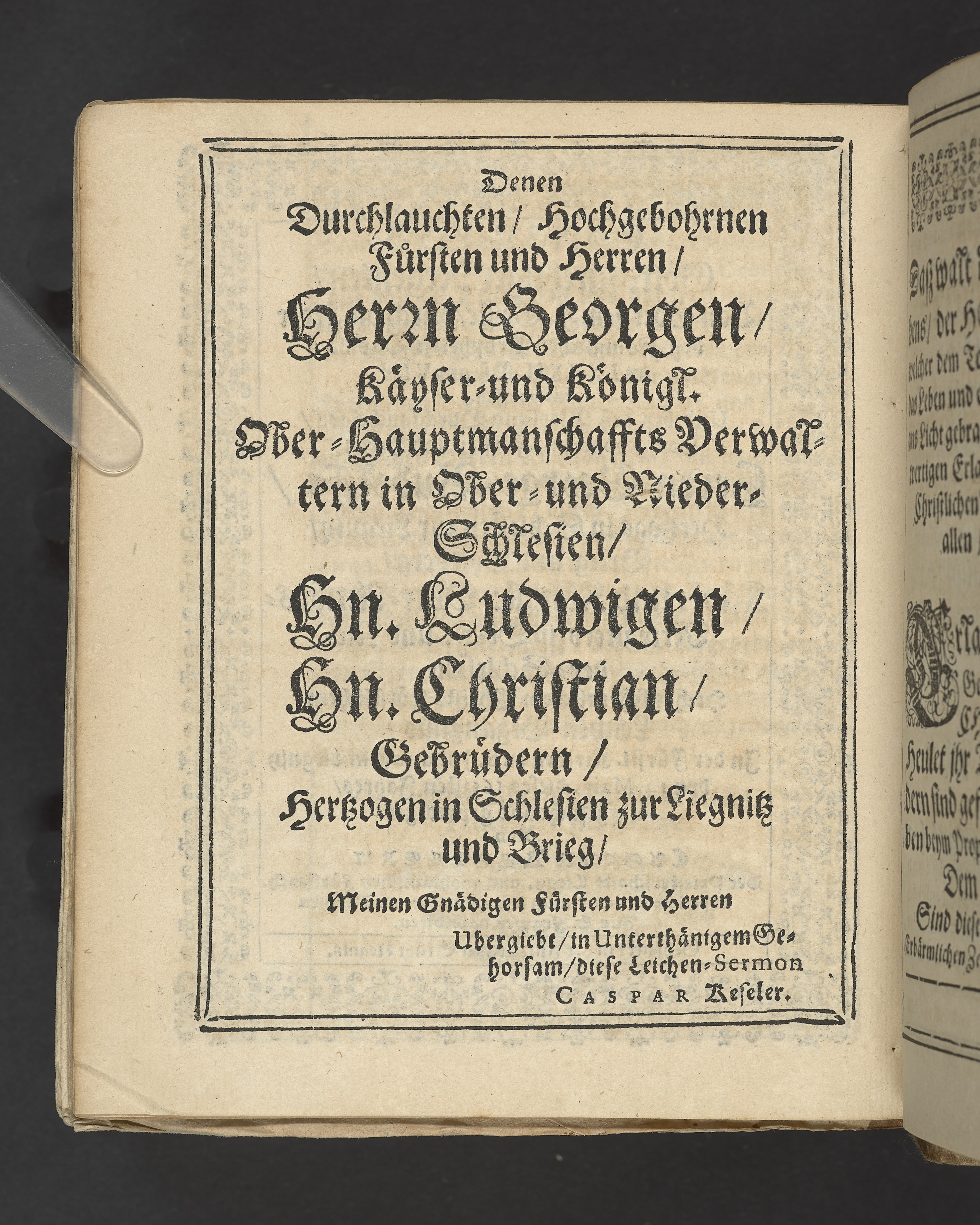 Ehren-Lob Gottsfürchtiger Regenten ... bey desz ... Herrn George-Rudolffs, Hertzogs in Schlesien, zur Liegnitz ... Leichen-begängnus, in der fürst. Kirchen zu S. Johannis in Liegnitz den 14 Maij; dieses 1653sten Jahres, aufgesucht und geprediget von Caspar Reselern ... Gedruckt in der fürstlichen Stadt Liegnitz.