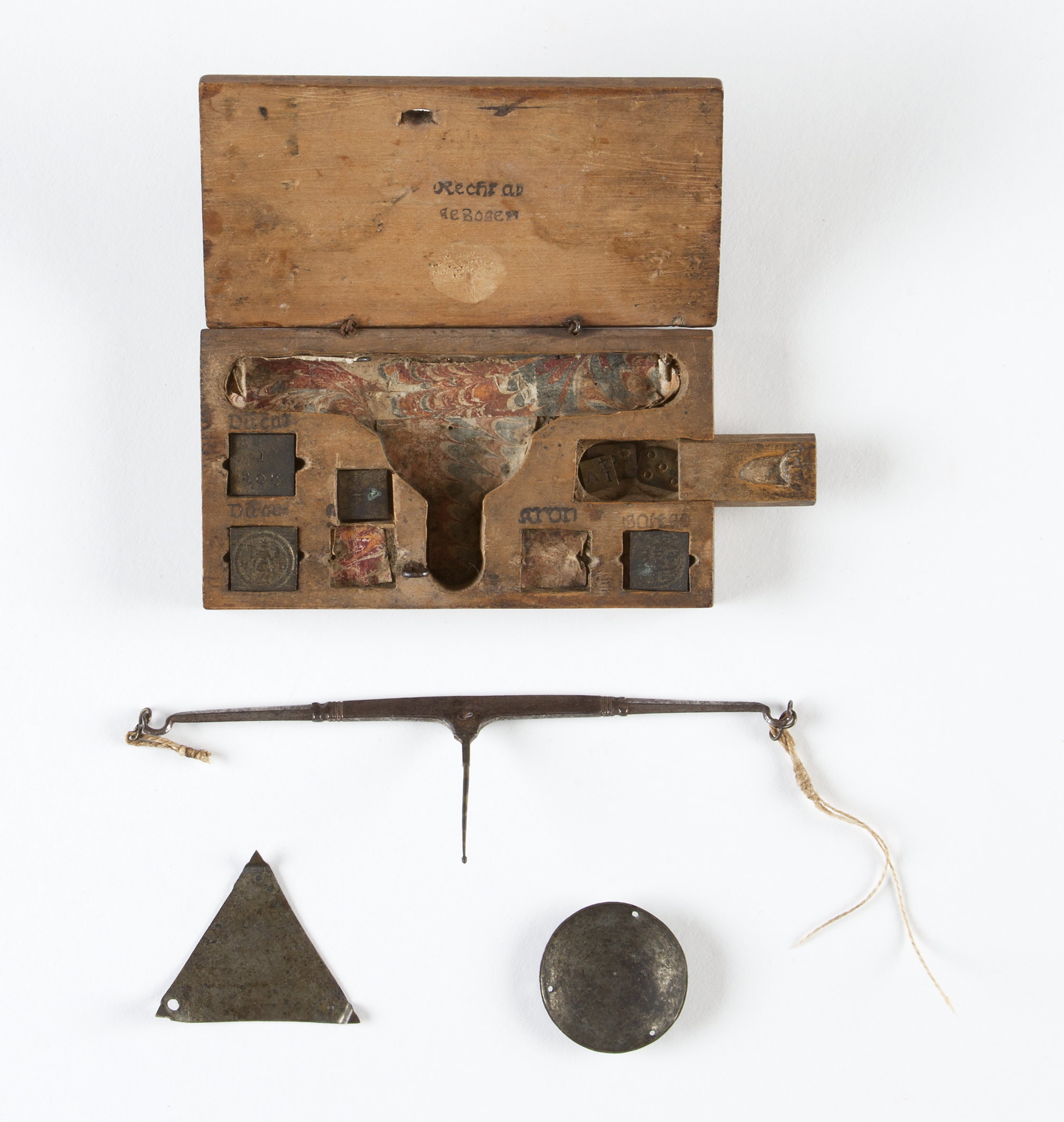 Vågbalk av järn, 148 mm lång med svanhalsformad ände och åttaformad hake. Visare av mässing. Två vågskålar av försilvrad mässing, den ena kupig, den andra trekantig med uppvikta hörn. I vardera vågskålen tre hål för upphängningssnören. I vågbalkens hakar rester av brunt hampsnöre (?). Vikter av mässing stämplade med: 1) Man med krona på huvudet, riksäpple i sin vänstra hand och hillebard i sin högra, H D på sidorna, inom ring. (ducat?, vikt c. 6 gram). 2) FBOS (ducat?, vikt c. 6 gram). 3) Tre franska liljor i krönt sköld, krönt R resp. krönt C på sidorna, inom ring (vikt c.3 gram). 4) IV (vikt c. 3 gram). 5) 0,25 V (vikt c. 1 gram). 6,7,8) rektangulära vikter av mässingsplåt med punsade 3, 4 resp. 5 ringar (sammanlagd vikt c. 1 gram). Fodral av ljusbrunt trä. Ovanpå locket oregelbundet stämplat små romber. I fodralet utskurna urtag för balansvåg, sex kvadratiska vikter samt fack för små vikter. Skjutlock över småviktsfacket. Urtagningarna fodrade med turkiskt papper. På lockets undersida skrivet "Recht ab gezogen" (=riktigt avpassat), en beteckning som är vanlig på mynt från Nürnberg). Vid fyra av viktfacken skrivet: "Ducat", "Ducat", "Kron" resp. "Golthe" (?). Ytterligare ett av facken har haft en dyl. beteckning, vilken dock försvunnit i och med att det sjätte facket skurits ut. Locket fästat vid fodralet med två järntrådar. Stängs med en hake i en ögla, vilken går igenom ett hål i locket. Stämplar: L D B över sex stjärnor inom sköld (på trekantig vågskål).