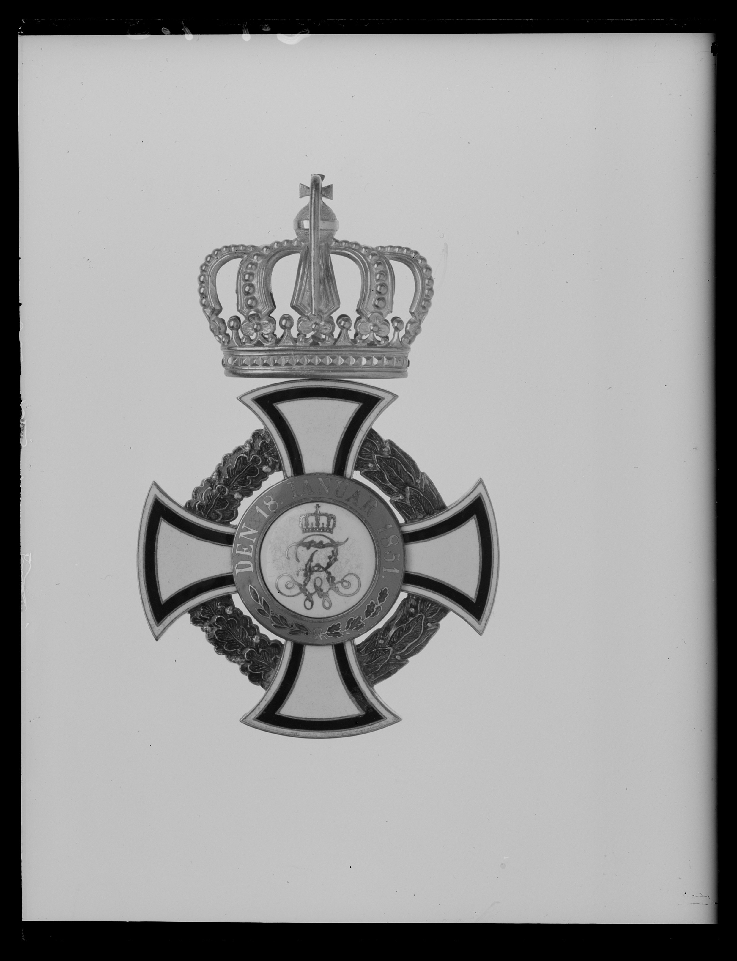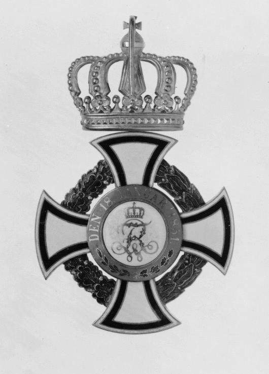 Vitemaljerat mantuakors av guld med rundade armändar, guldkantad kantbård av svart emalj,b: 1 mm, 0,5 mm från kanten. Mellan korsarmarna en grönemaljerad eklövs- och lagerkrans avguld. Svagt välvd vitemaljerad medaljong, däri av guld samt svart och vit emalj den kröntapreussiska örnen med Hohenzollern-skölden på bröstet. Runtom en ring täckt med ljusblåemalj, däri guldtext: "VOM FELS ZUM MEER", nertill två korslagda, grönemaljerade lager- ochekkvistar. Frånsidans medaljong välvd och täckt med vit emalj, däri av guld ett krönt namnchiffer:FWR. Runtom en ring täckt med ljusblå emalj, däri guldtext: "DEN 18.IANUAR 1851", nertilltvå korslagda, grönemaljerade lager- och ekkvistar. På den övre korsarmen en ring, därifäst en kunglig krona av guld, på baksidan av korset på äpplet en hake, vilken fästes ikedjan. På den nedre korsarmen otydlig stämpling: ..FB.