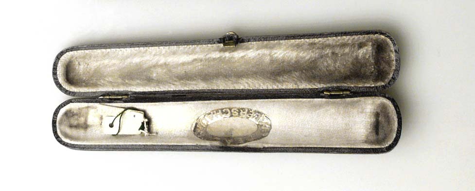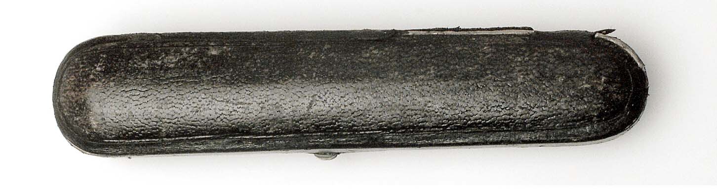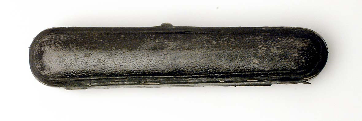 Avlångt etui av trä med rundade ändar samt rundad över- och undersida. Utvändigt klätt med röttenågot slitet skinn, kantbård i guldpressning, fjäderläs och två gångjärn av gulmetall.Locket invändigt klätt med benvitt siden smutsigt vid ändarna, guldpappersetikett med vit text:"REAL MEERSCHAUM". Underdelen invändigt klätt med benvitt konstfibermaterial, likaså smutsat vidändarna.