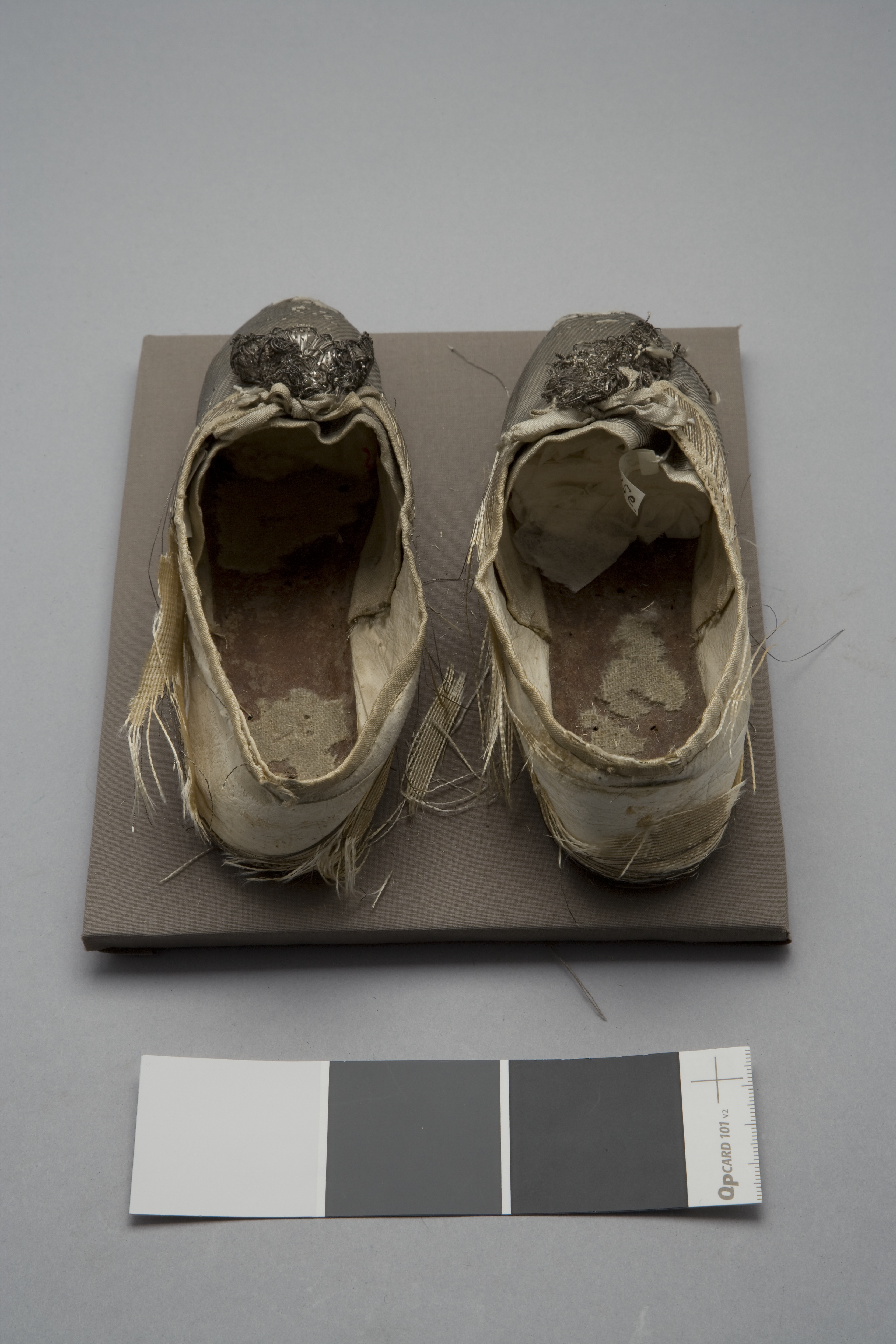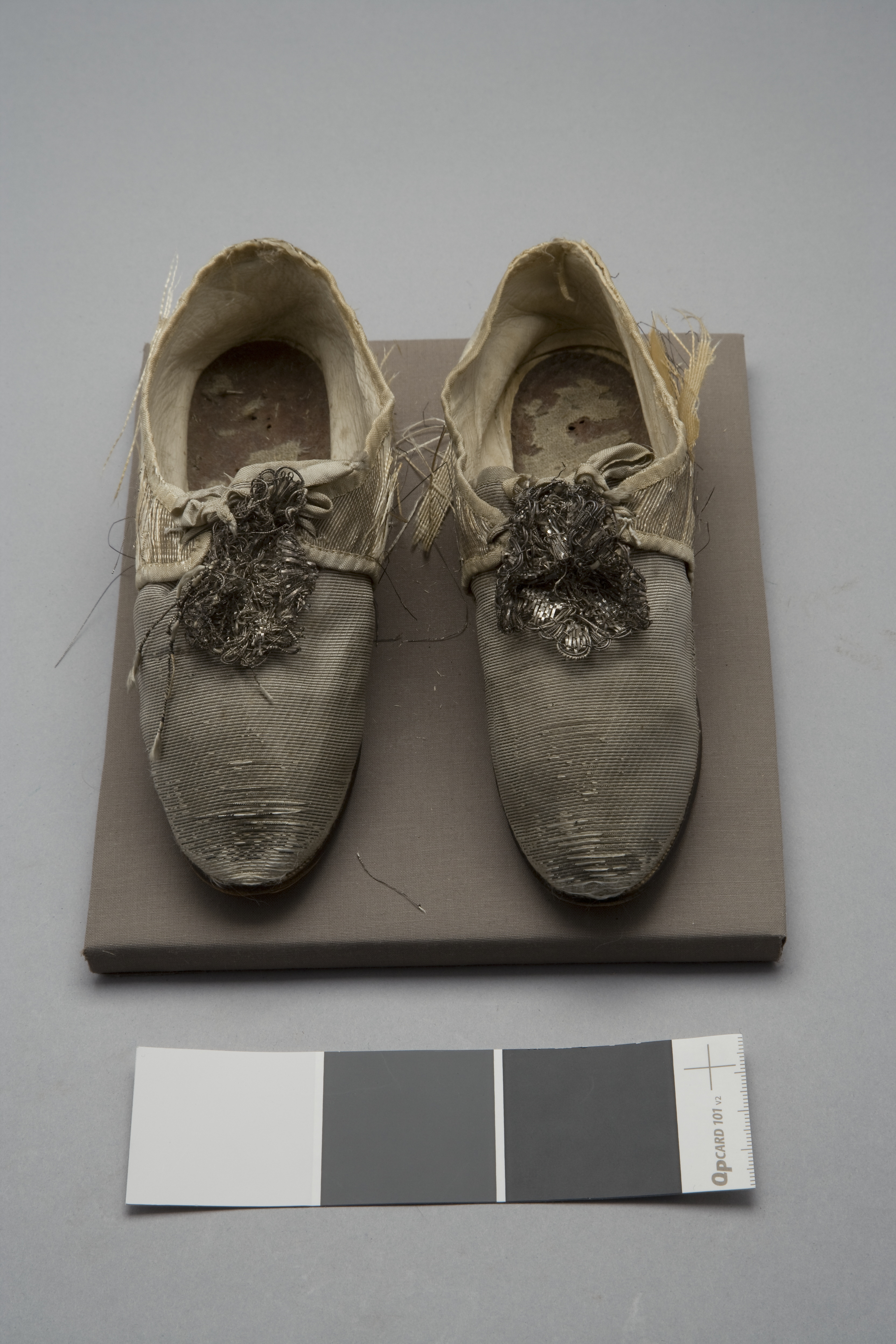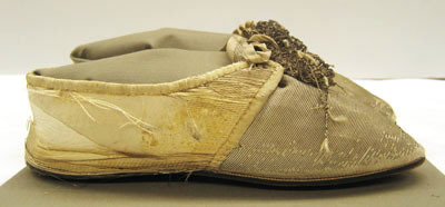 Sko sydd i ripsvävt silvertyg (samma som dräkten) och fodrad med getskin. Bandet som kantar skons ringning är i siden och vävt i tuskaft (10 mm bred). Modellen har spetsig tå och knappt synbar klack. Skon knyts ihop över vristen med ett sidenband över den rundade plösen och pryds mitt fram av en skorosett (45 mm bred). Sulan är i läder och tre mm tjock.