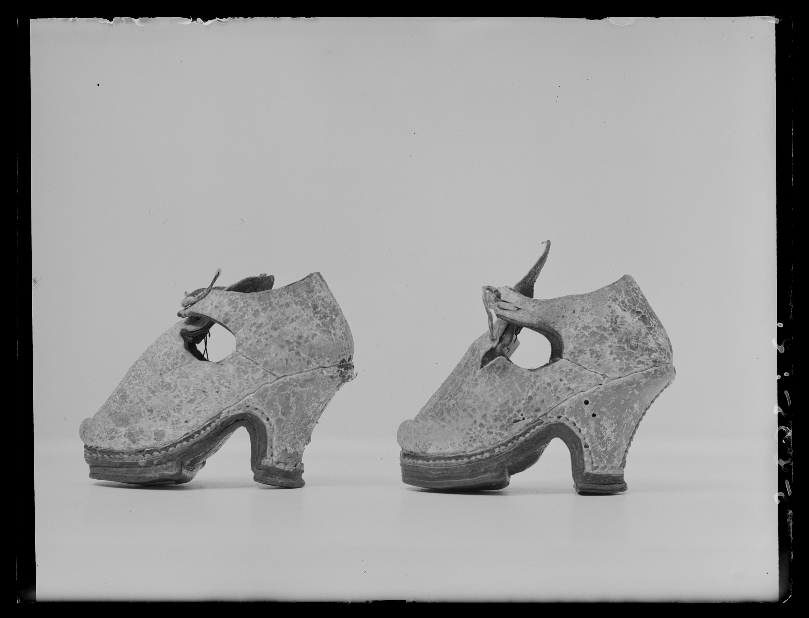 Från Venedig. Sko tillverkad av dubbelt skinn, utvändigt med tunnt, vitt glaceskinn som färgats ockra-brunt, härunder ett tjockare brunt skinn. Skon har rundad tå och med reseft uppdraget i en spetsig plös som har 2 hål för skorosens fästande. Bakstycket är framtill utdraget i en slejf på varje sida, slejfarna har också hål för knytandet. Bak- och sidsömmar är hopspannade från insidan. Sulan är fastsydd med holtrand. Slitsulan är lagd i vinkel under trampet och en extra sula inlagd under fotens främre halva. Slitsulan går under klackens stiftlapp och har ett pinnhål under tramp, hålfot och klack.Klacken som är 50 mm hög och 30 mm bred har rak front. Den är av trä, klädd med skinn och har söm mitt bak.