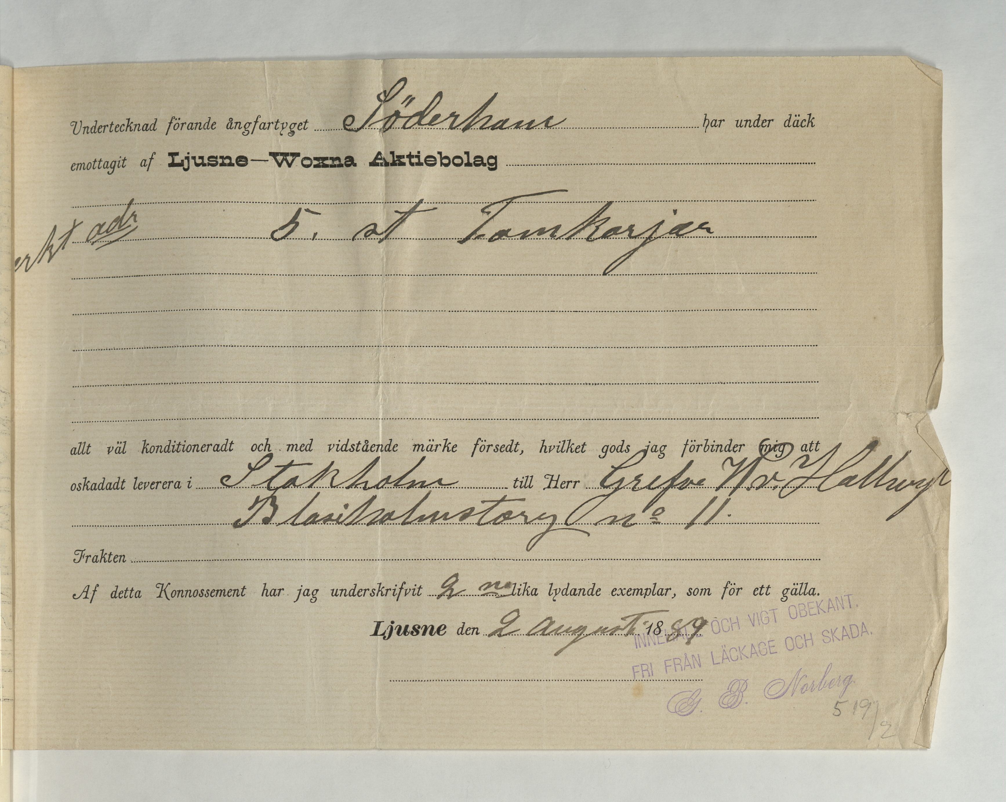 Verifikation på genomförd leverans från Ljusne Woxna Aktiebolag till Greve Walther von Hallwyl på Blasieholmstorg no 11, 2 augusti 1889.