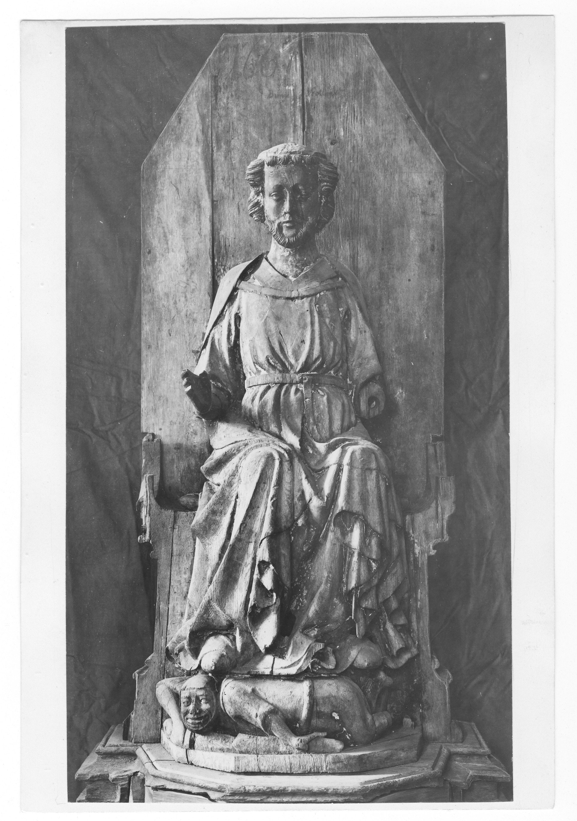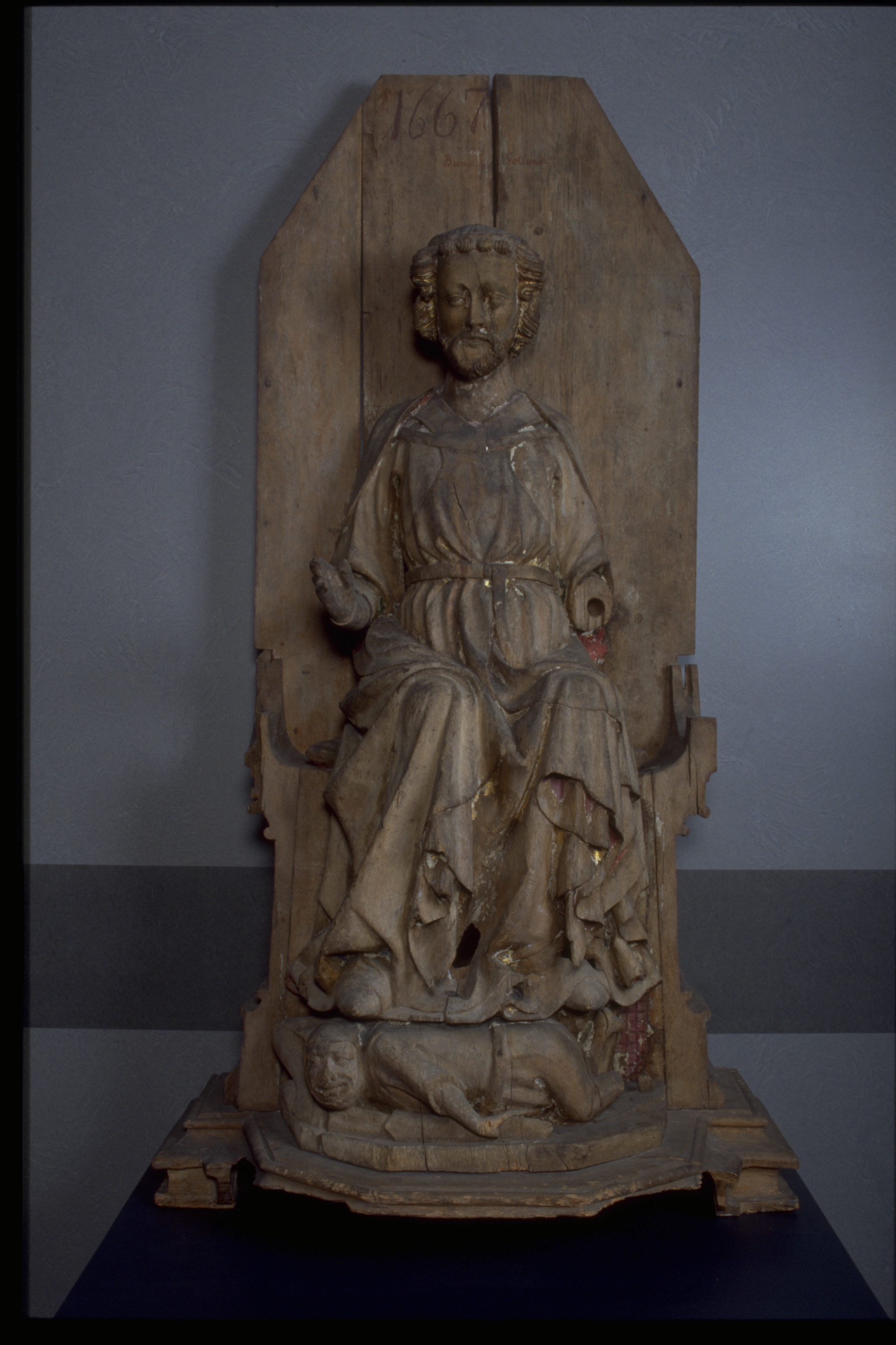 Kondition: kronan, vänster underarm och attribut förlorade, högerhanden fragmentarisk, underliggarens ansikte något nött. Färg: endast smärre fragment.