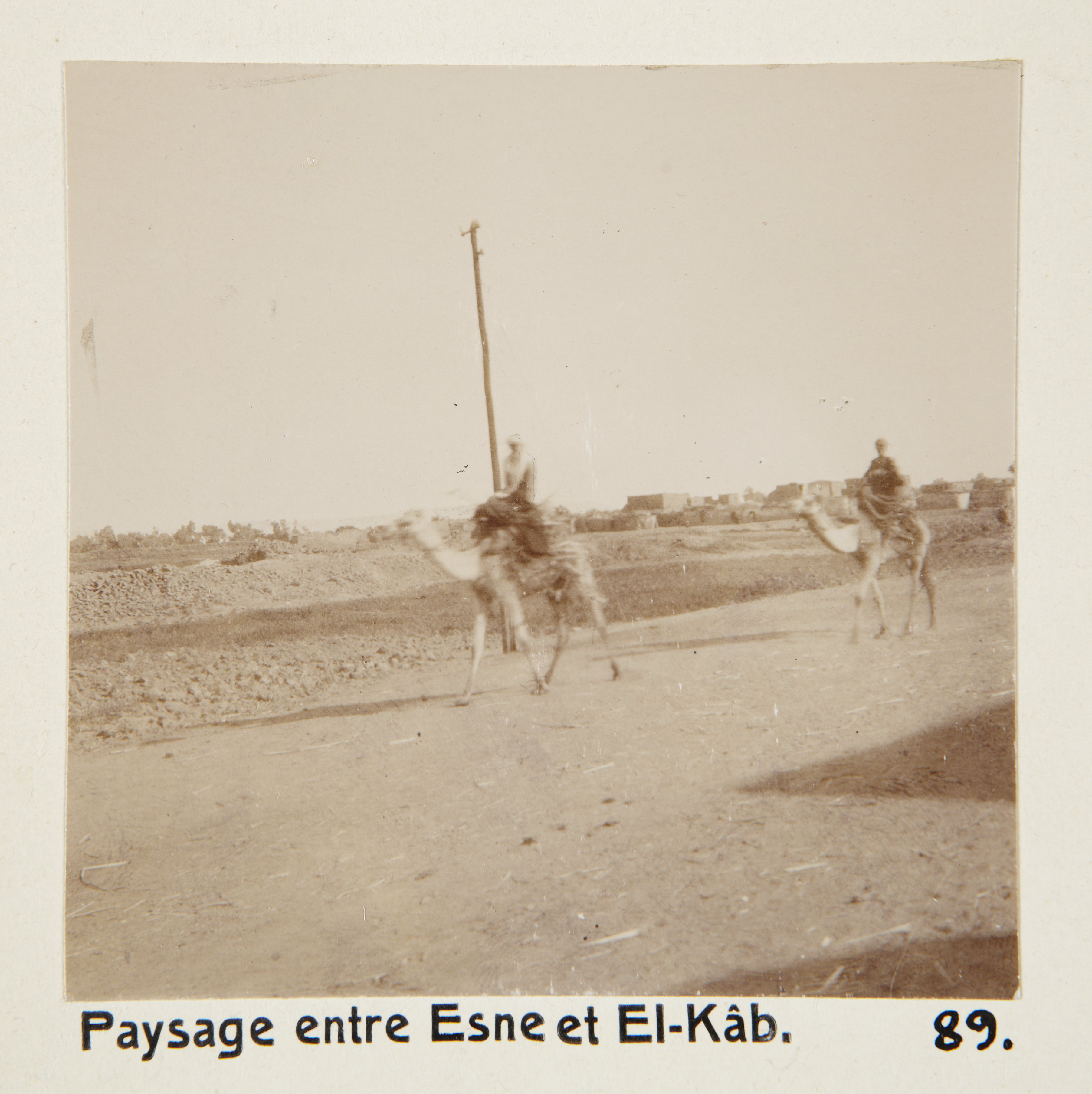 Landskap mellan Esna och Al Kāb, Egypten. Text på fotografiet: Paysage entre Esne et El-Kâb. Fotografierna LXVI:M.01.- 201. kommer från resan till Egypten och Sudan som Wilhelmina och Walther von Hallwyl gjorde vintern 1900-1901. De lämnade Sverige den 5 november 1900 och fortsatte från Egypten till Palestina den 28 mars 1901. Med på resan var döttrarna Ellen med maken Henric de Maré och Irma med maken Wilhelm von Geijer. Wilhelminas sällskapsdam, fröken Ida Uhse reste också med. Under en del av resan anslöt sig ledamoten av Internationella domstolen i Kairo, assessorn Otto Conrad Waldemar Cedercrantz med makan Anna Elisabeth. Vid resan uppför Nilen hade Walther von Hallwyl hyrt ångfartyget Columbia med besättning. Båtresan startade i Kairo 27 december 1900, gick ända till Wadi Halfa varifrån man reste vidare med tåg till Khartum och tillbaka till Wadi Halfa. Båten vände åter i riktning mot Kairo, men det verkar som att sällskapet tog tåg sista biten, från Luxor. Henric och Ellen de Maré samt fru Cedercrantz lämnade båten redan då de passerade Luxor första gången. Resten av sällskapet återvände till Kairo den 1 mars. Fotografierna LXVI:M.01.-120. togs av resenärerna själva, de största av Ellen de Maré, de mellersta av Wilhelmina von Hallwyl och de minsta av Wilhelm von Geijer. Resten köptes av professionella fotografer i Kairo, de flesta från Studio Photogr. Artistique G. Lekegian & Cie. Alla uppgifter kommer från Ida Uhses reseanteckningar.