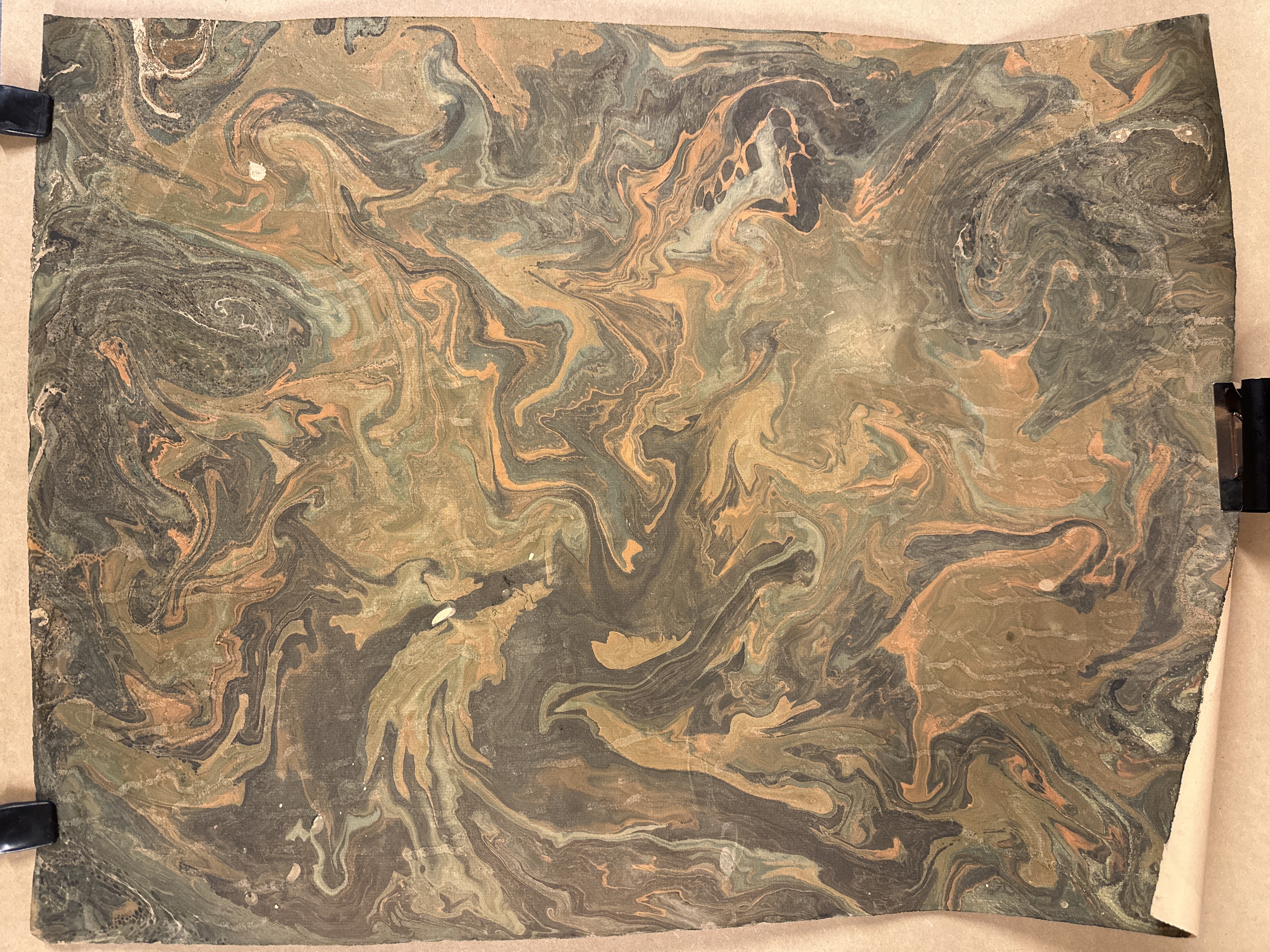 Marmorerat papper, i färgerna orange, blått och svart. Marmoreringen utförd på pappret "Ingress" tillverkat vid Tumba bruk.
