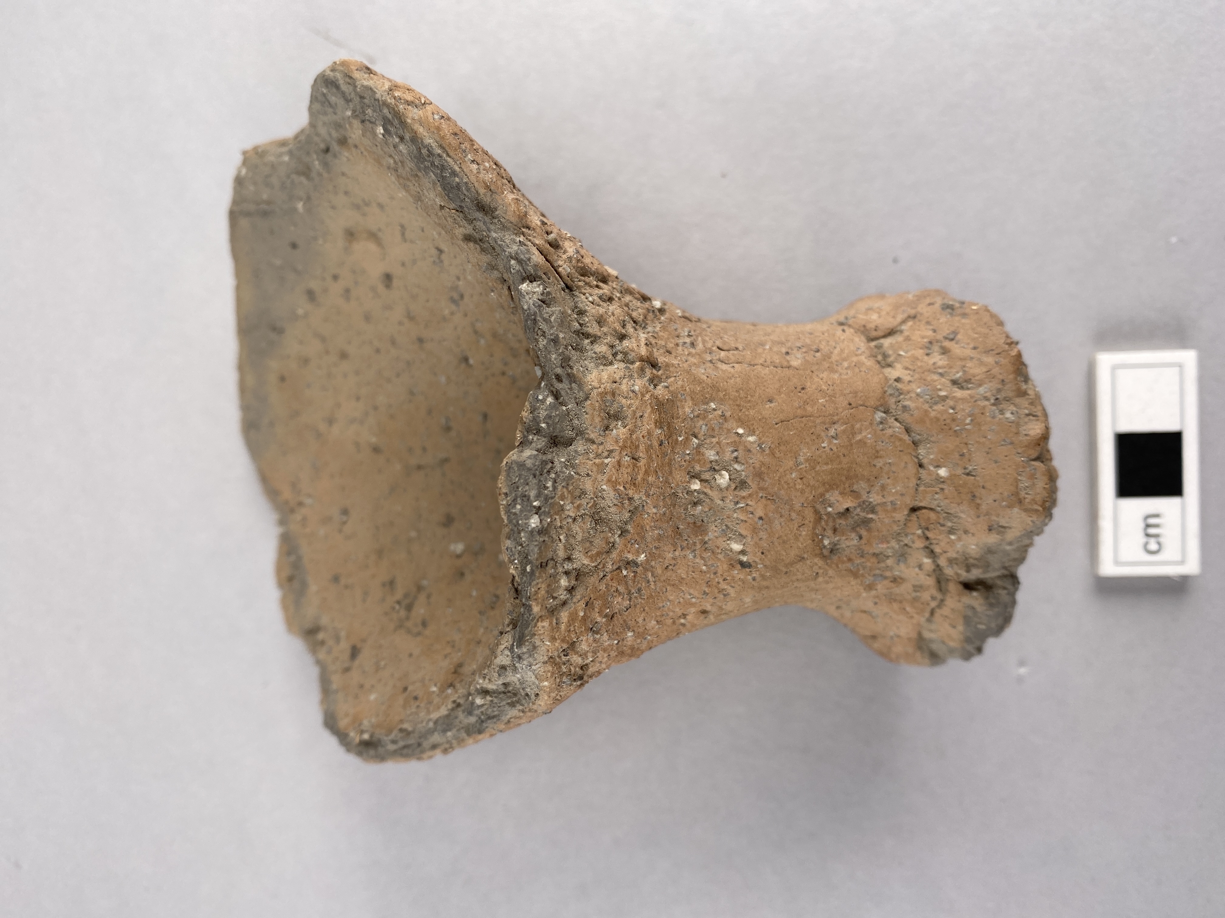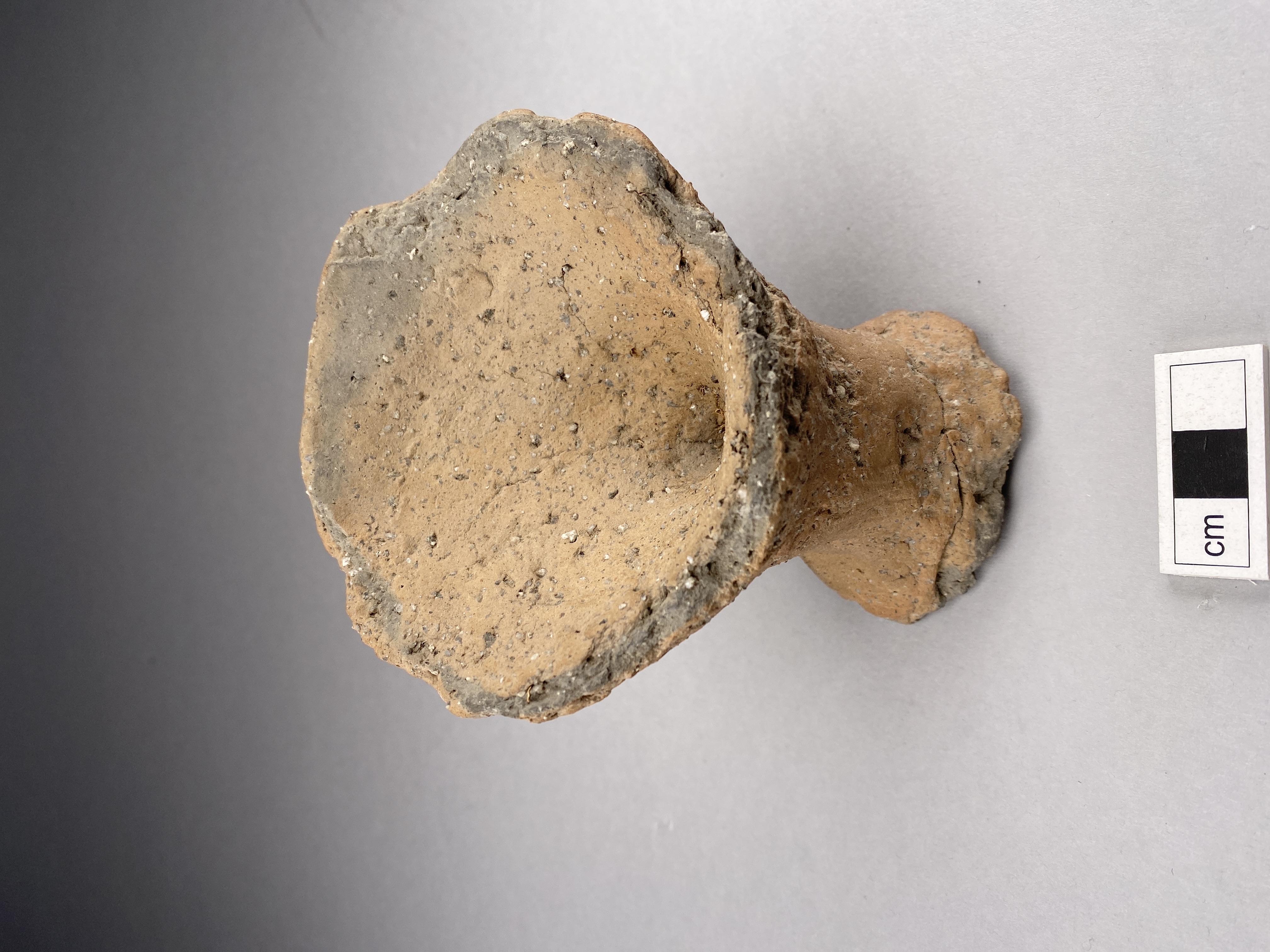 timglas/äggkoppsformat kärl. Grovt glättad yta, oxiderat bränt. fingeravtryck. innuti har kupan en spetsig form. konkav fot. Lausitzinfluerad pokal eller vikingatid? delar av mynning är bevarad.