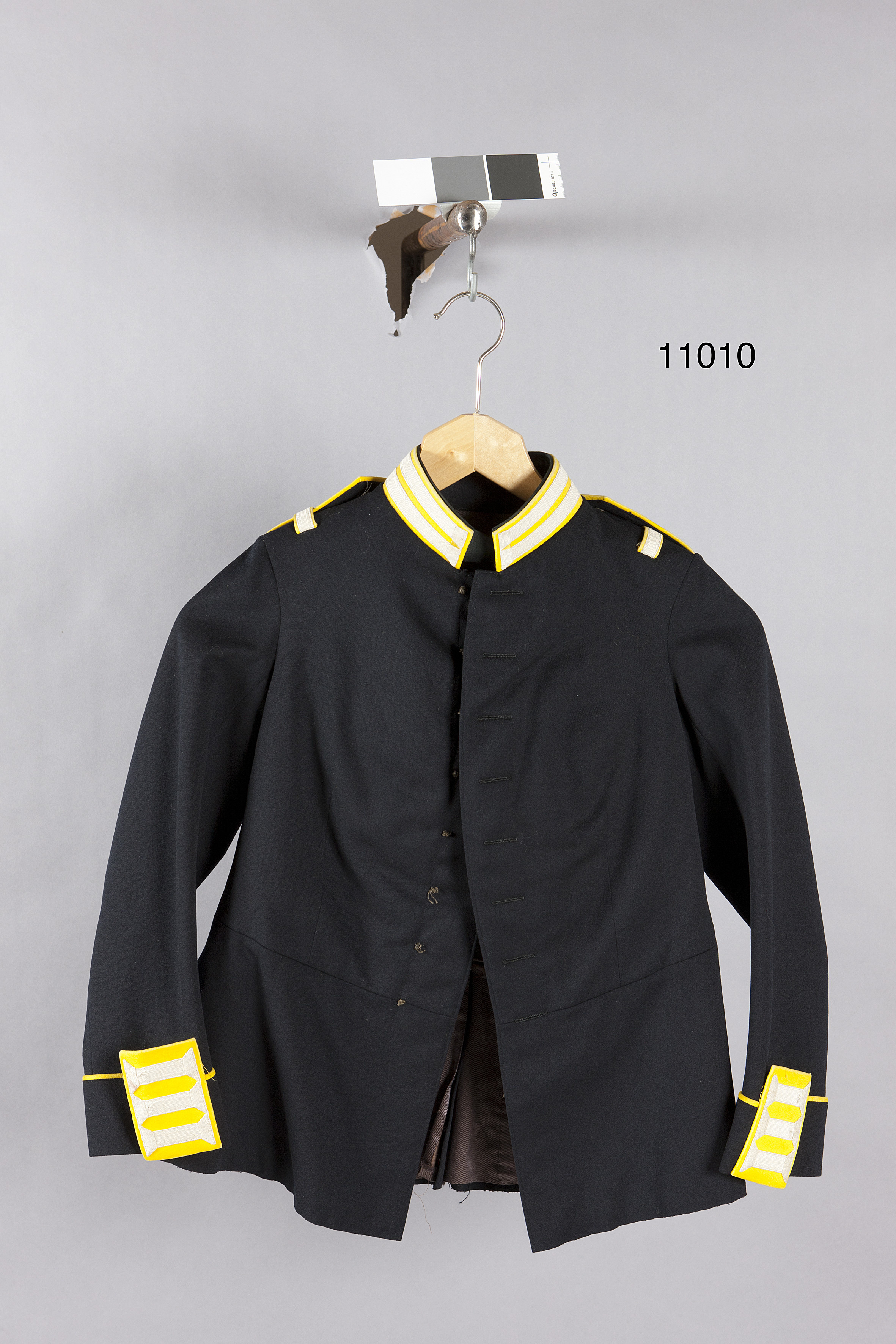 Vapenrock av mörkblått kläde, tillskuren med livsöm, enkelradig. Ståndkrage klädd med gult kläde med knapphål av vitt linne. På axlarna hällor av gult kläde med påstickad galon av vitt linne. Axelklaffar med gul passpoal och O II:s namnchiffer av förgylld mässing. Ärmuppslag 61 mm, med gul passpoal samt gul klaff. Skört kantade med gul passpoal samt dolda fickor. Foder av grått siden, kyprat. Livet matelasserat. En innerficka. I midjan två tampar med hakar av gulmetall. Ärmarna fodrade med siden med smala röda ränder.