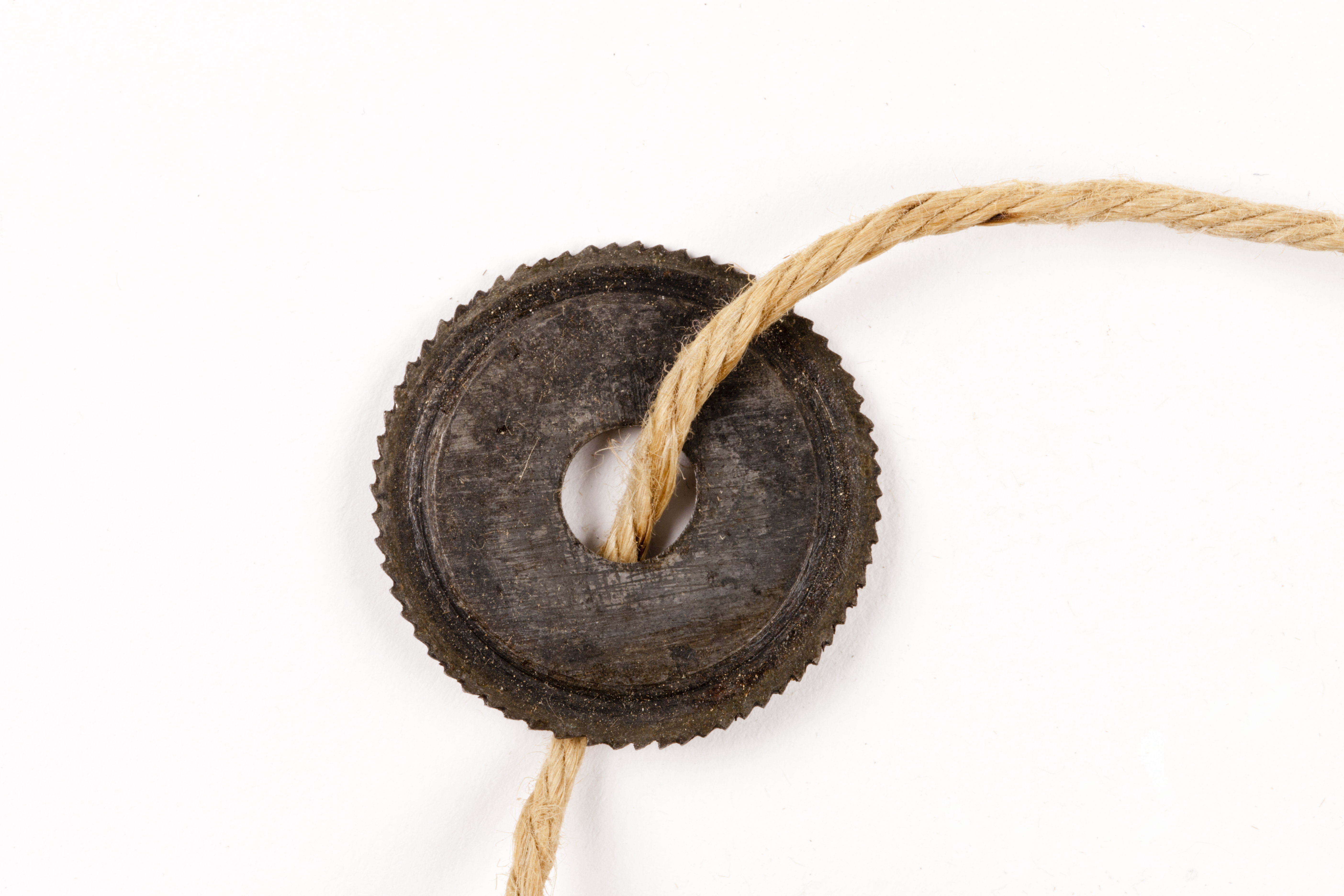 Rund, tjockare mot mitten, tvärgående tänder. Hålets diam 7 mm. Stämplad med en punkt.