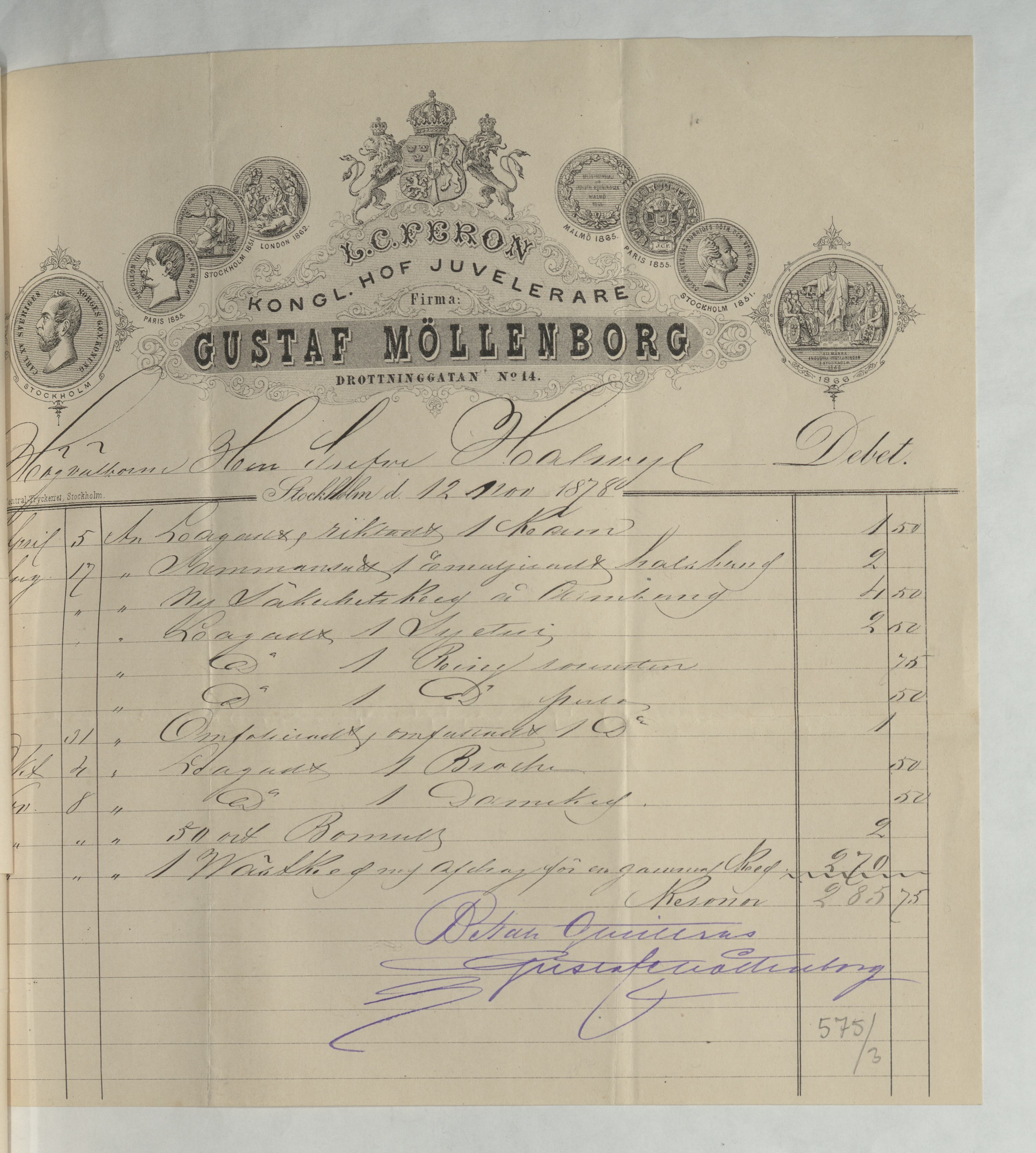 Kvitto från Gustaf Möllenborg, Juvelerare