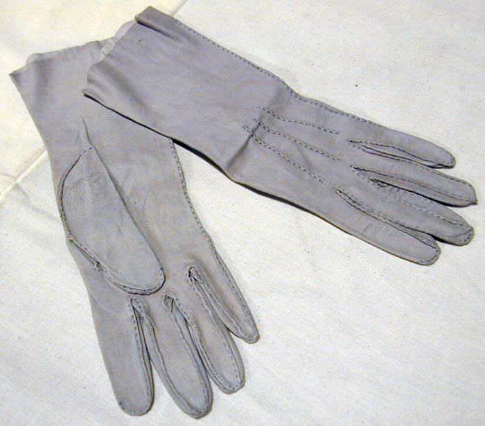 Handske av ljusgrått sämskskinn, handlaskade sömmar. På ovansidan tre längsgående sick-sackvalkar.