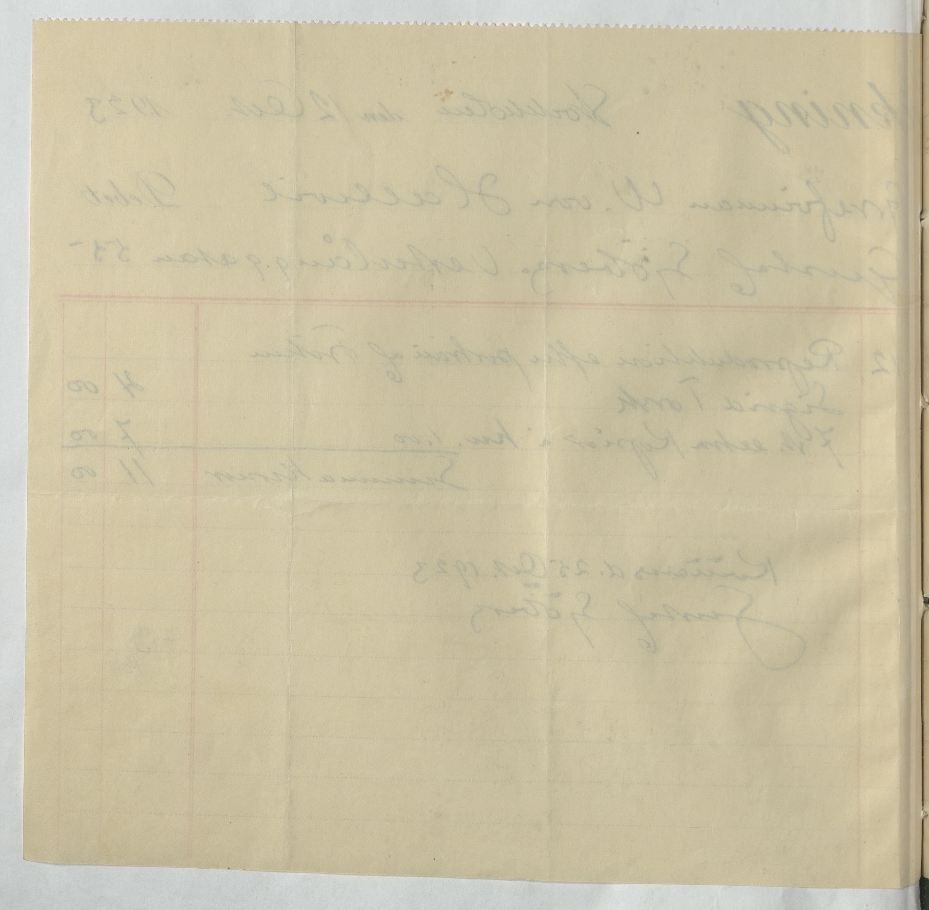 Kvitto från Gustaf Sjöberg. Gällande betalning för hans arbete med fotografering av museisamlingarna. Stockholm, 1923.